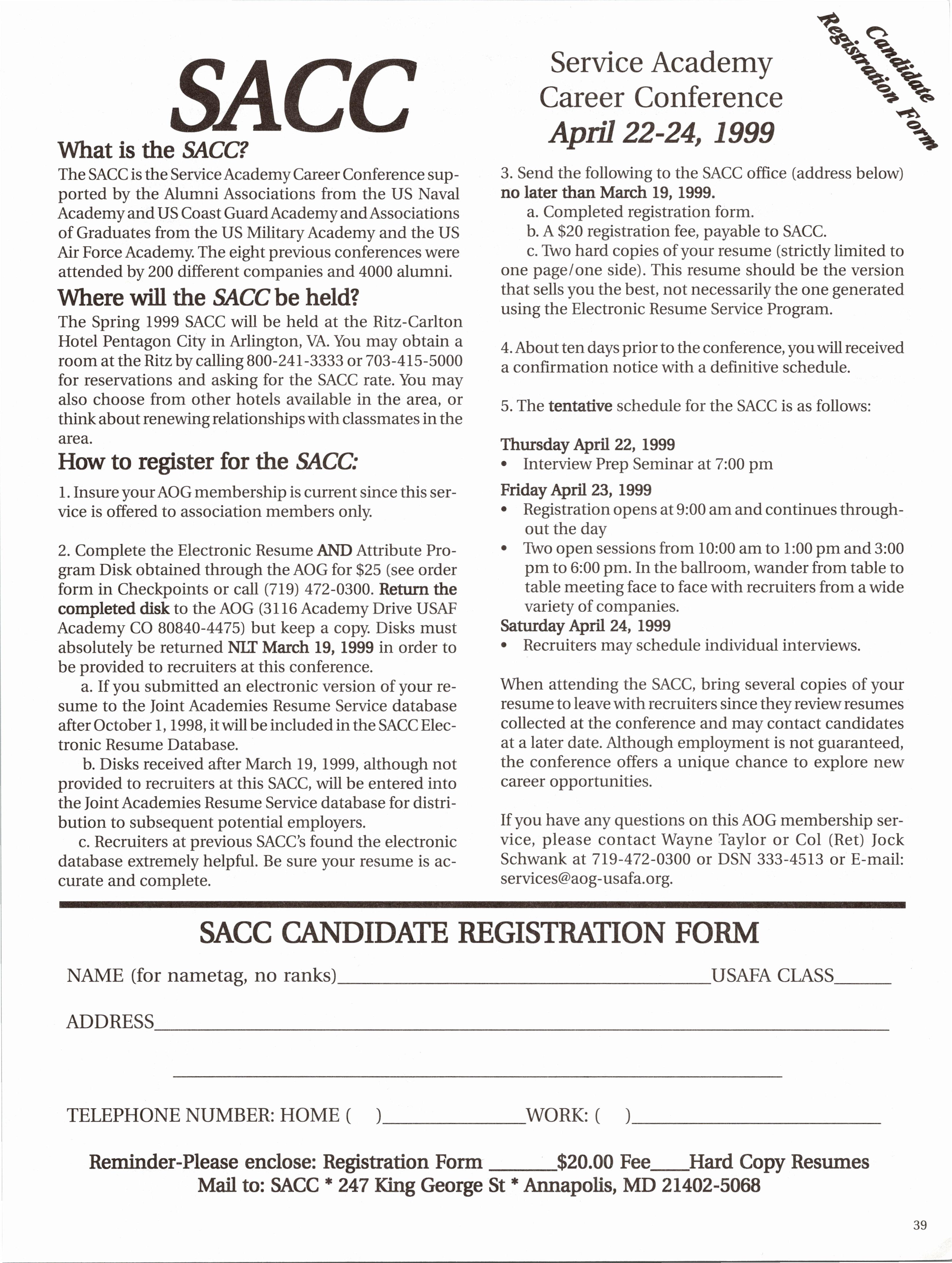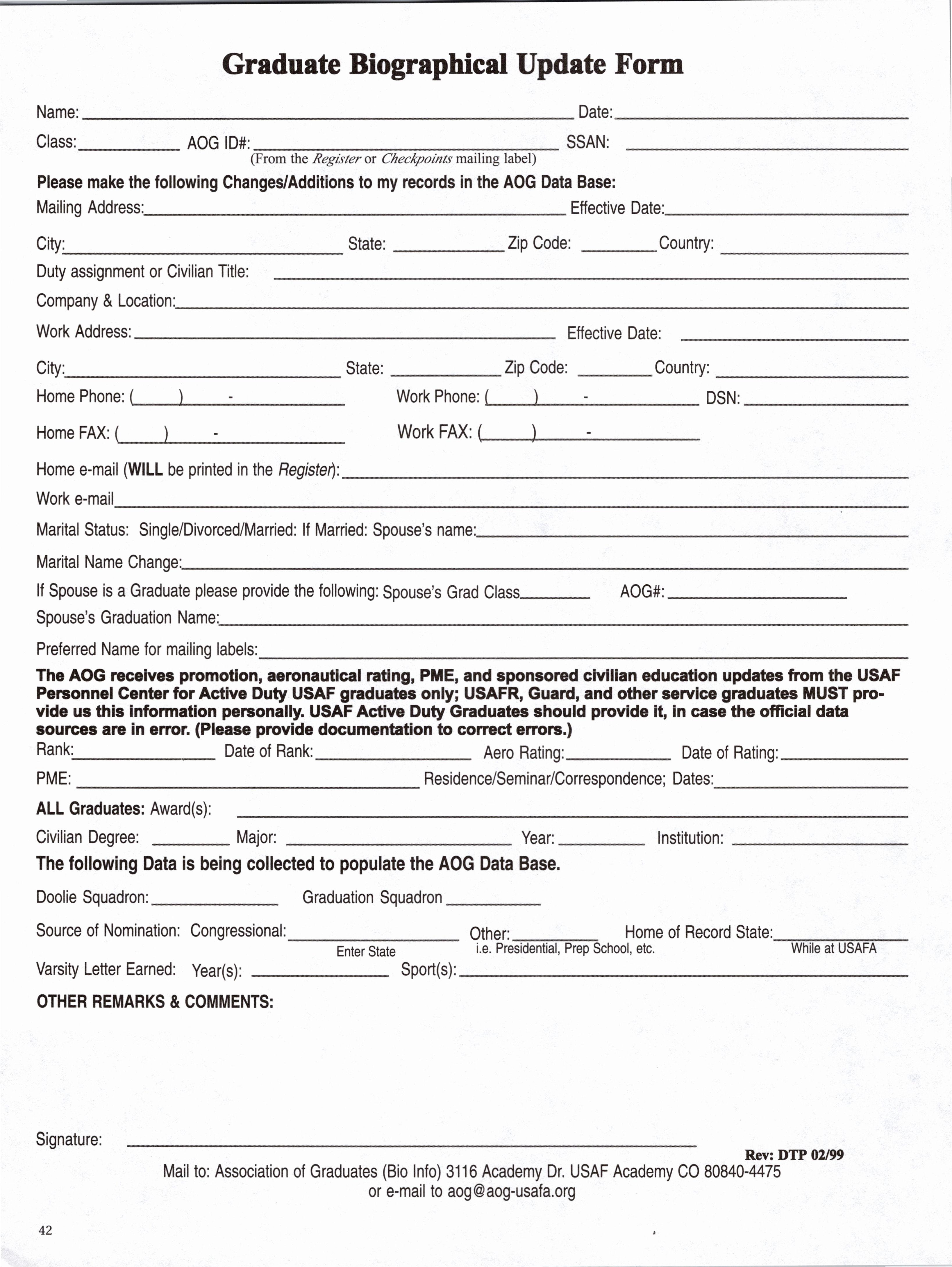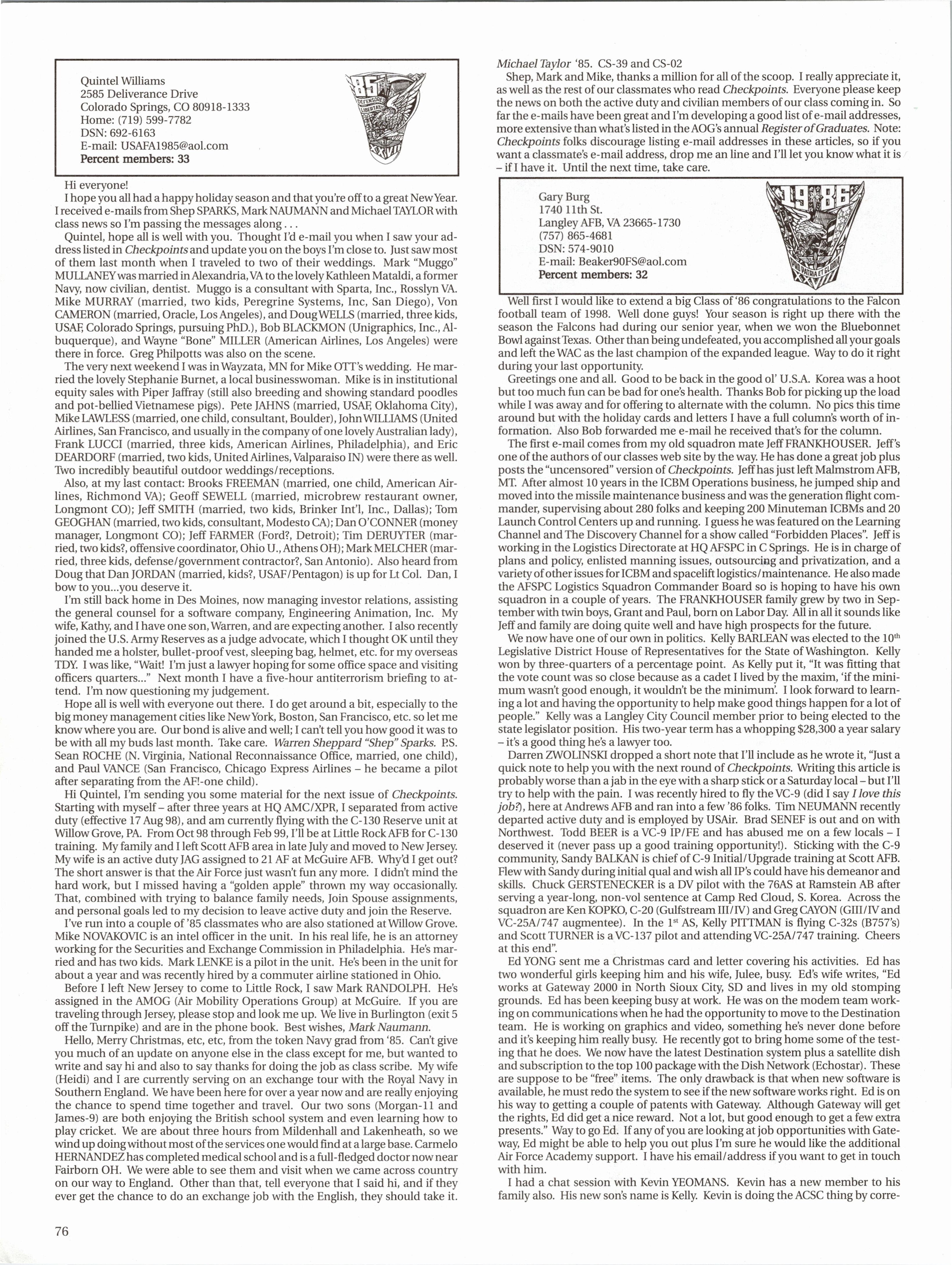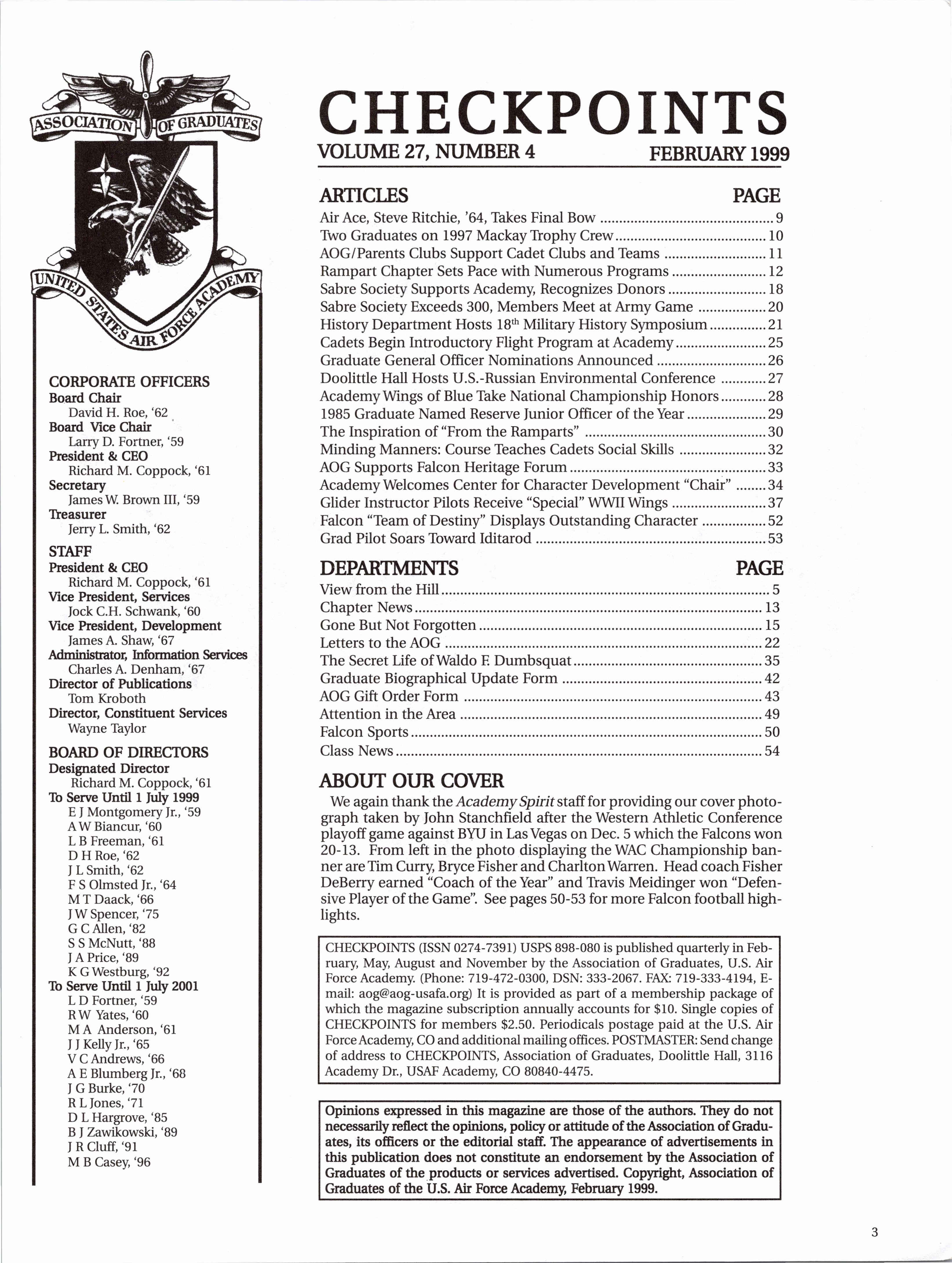 CHECKPOINTS (ISSN 0274-7391) USPS 898-080 is published quarterly in February, May, August and November by the Association of Graduates, U.S. Air Force Academy. (Phone: 719-472-0300, DSN: 333-2067. FAX: 719-333-4194, Email: aog@aog-usafa.org) It is provided as part of a membership package of which the magazine subscription annually accounts for $10. Single copies of CHECKPOINTS for members $2.50. Periodicals postage paid at the U.S. Air Force Academy, CO and additional mailing offices. POSTMASTER: Send change of address to CHECKPOINTS, Association of Graduates, Doolittle Hall, 3116 Academy Dr., USAF Academy, CO 80840-4475.