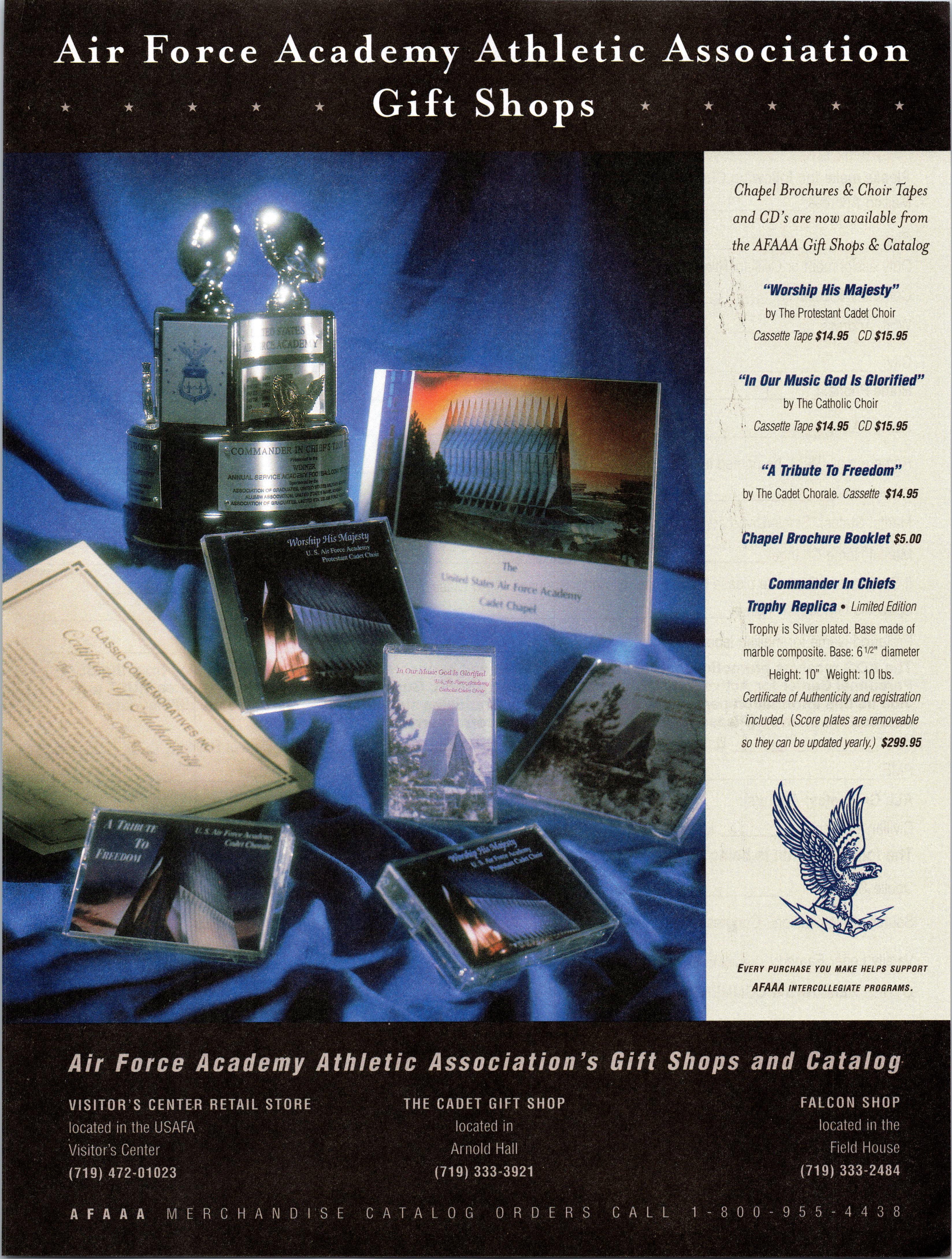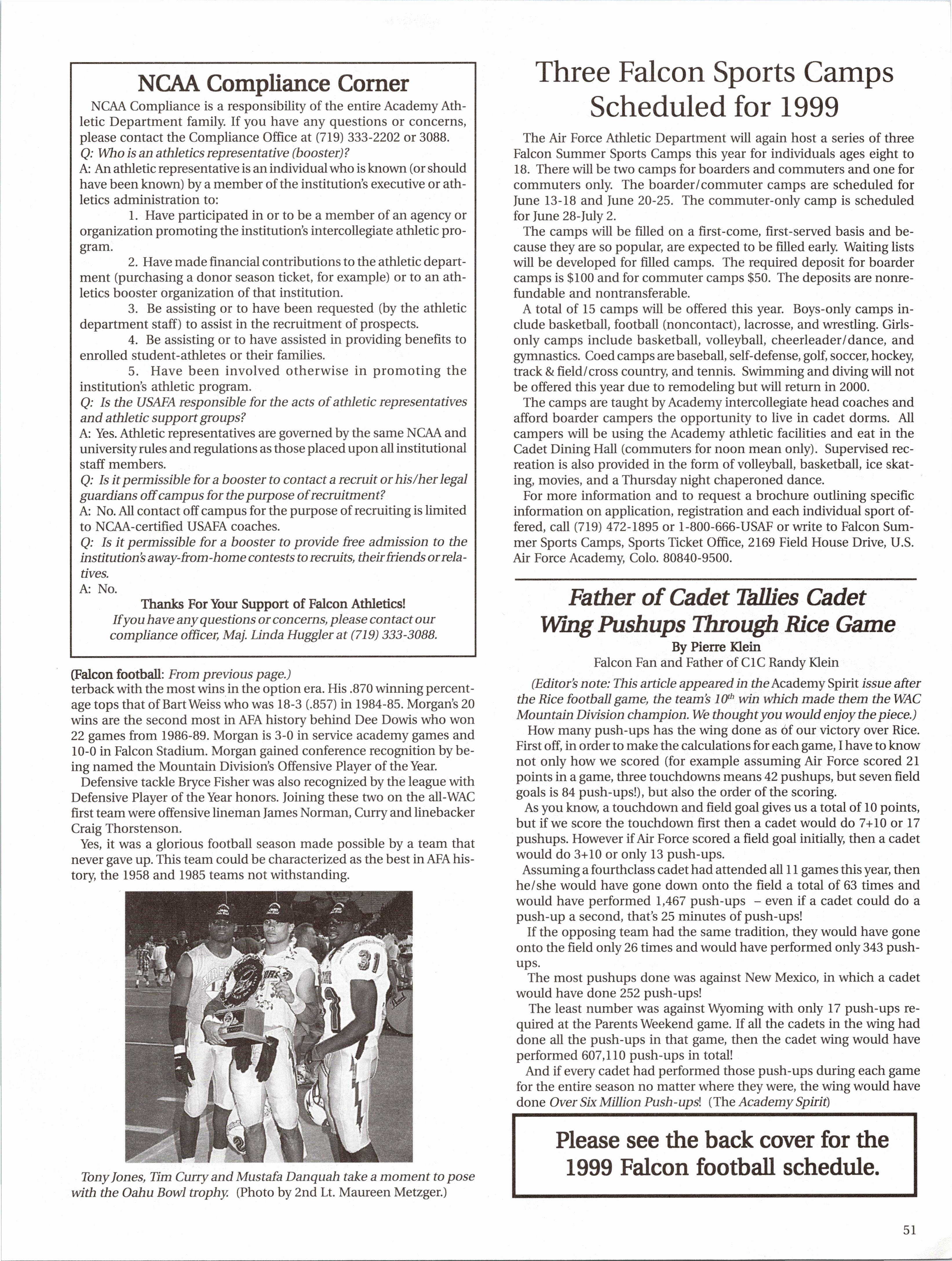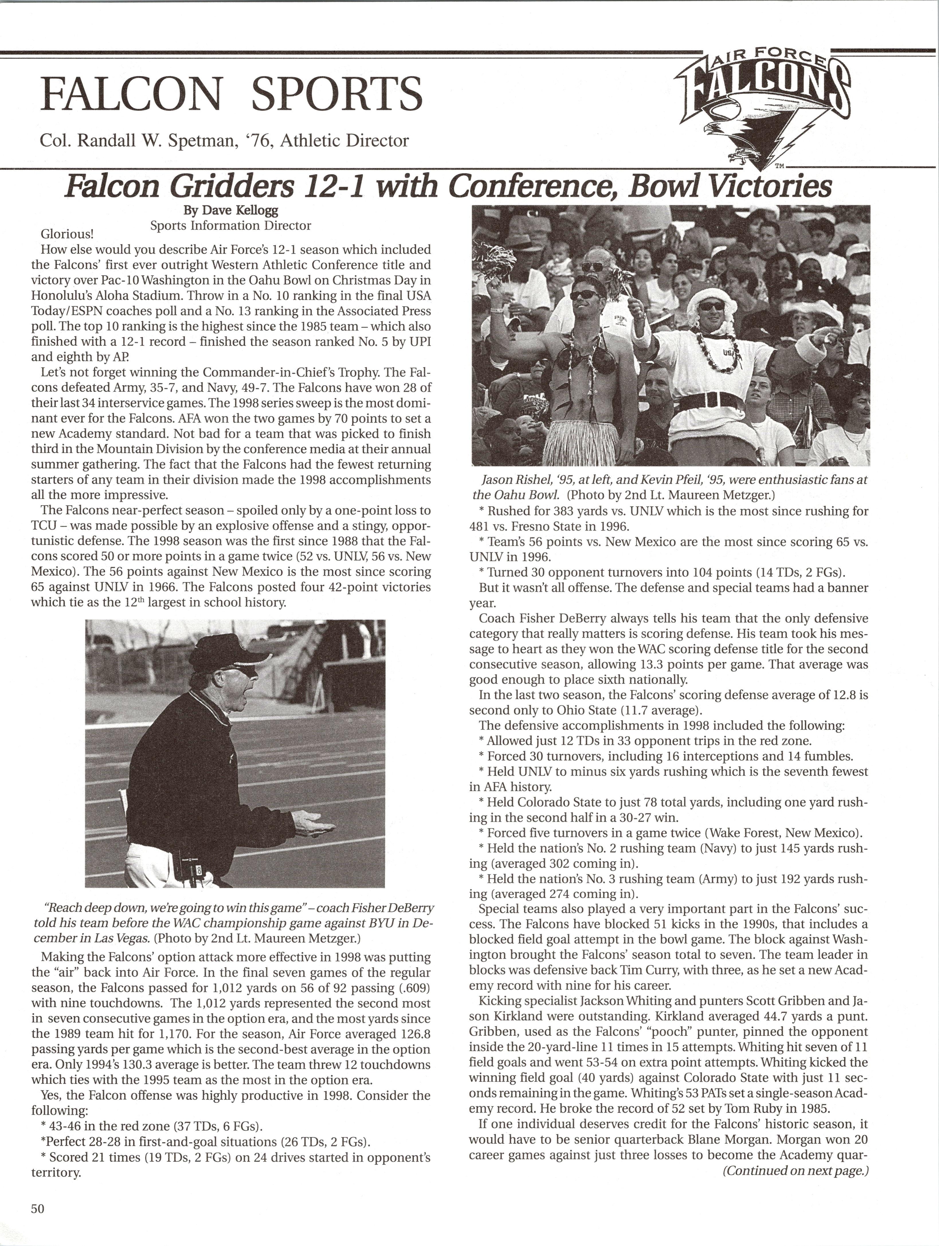We again thank the AcademySpirit staff for providing our cover photograph taken by John Stanchfield after the Western Athletic Conference playoff game against BYU in Las Vegas on Dec. 5 which the Falcons won 20-13. From left in the photo displaying the WAC Championship banner are Tim Curry, Bryce Fisher and CharltonWarren. Head coach Fisher DeBerry earned “Coach of the Year” and Travis Meidinger won “Defensive Player of the Game”. See pages 50-53 for more Falcon football highlights.