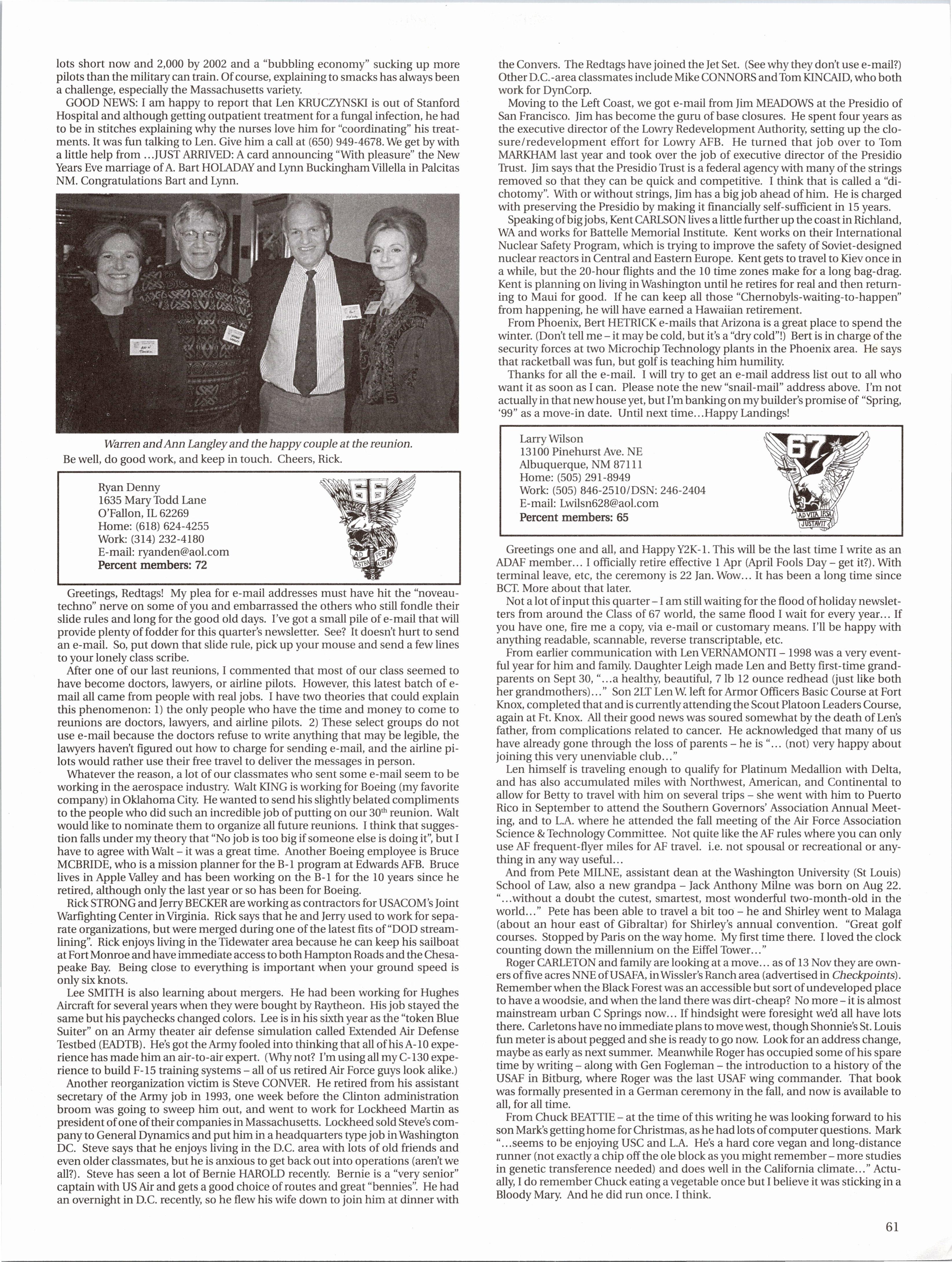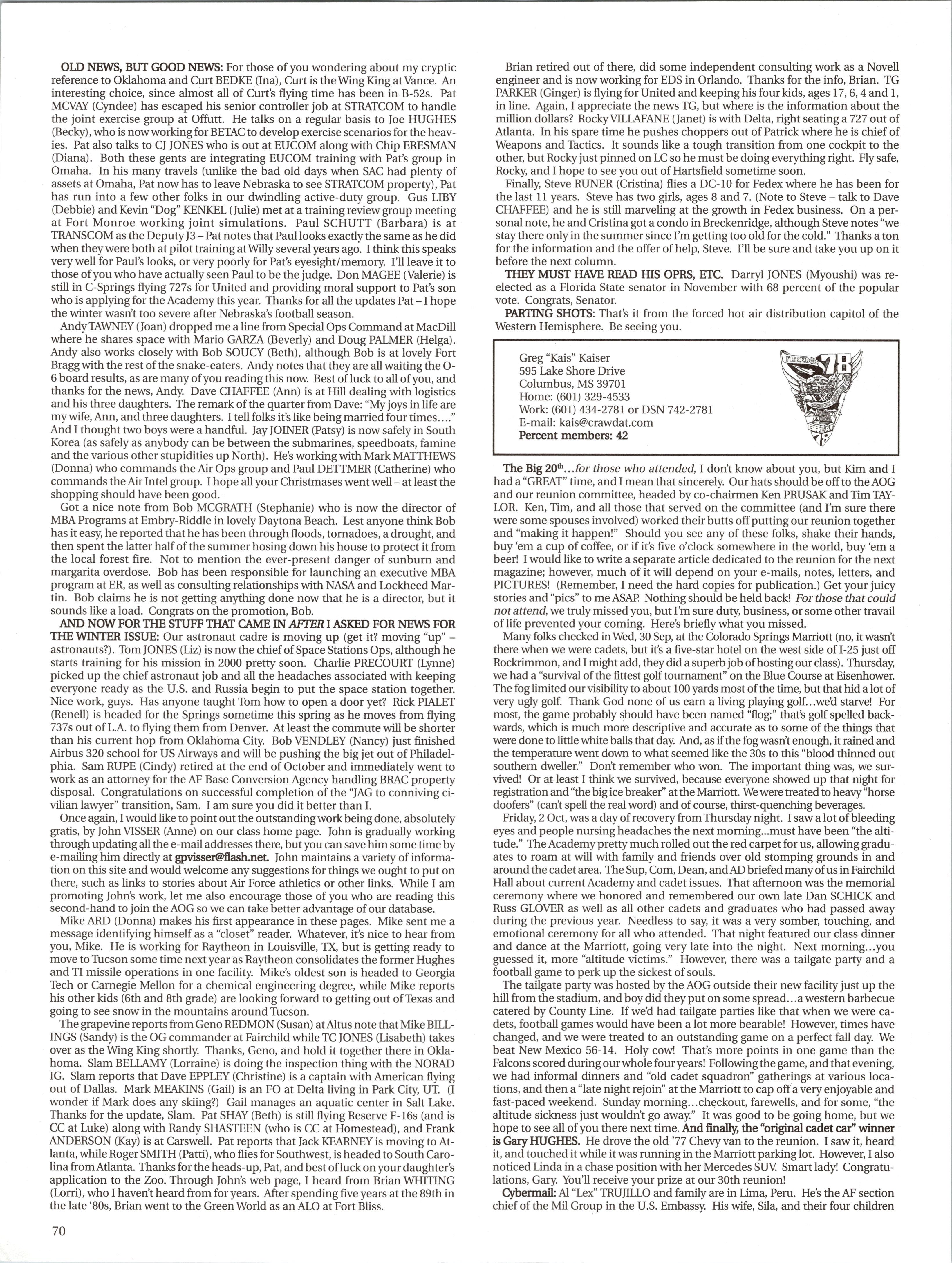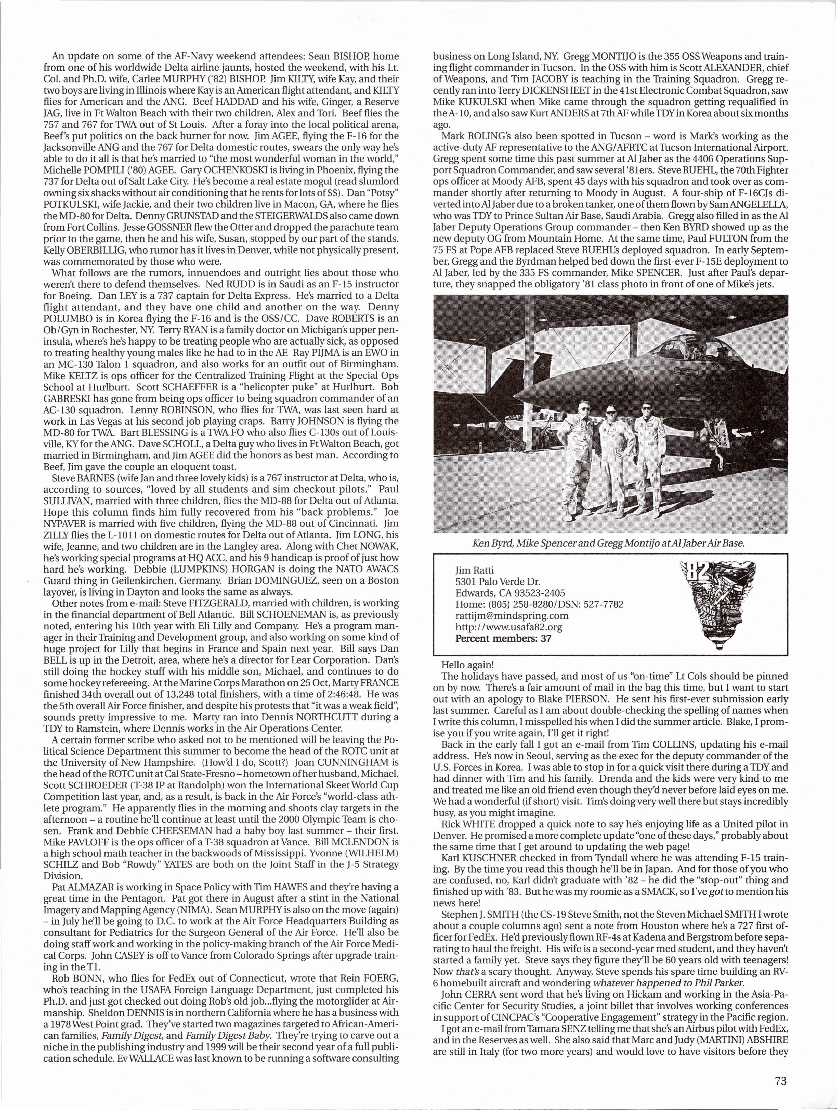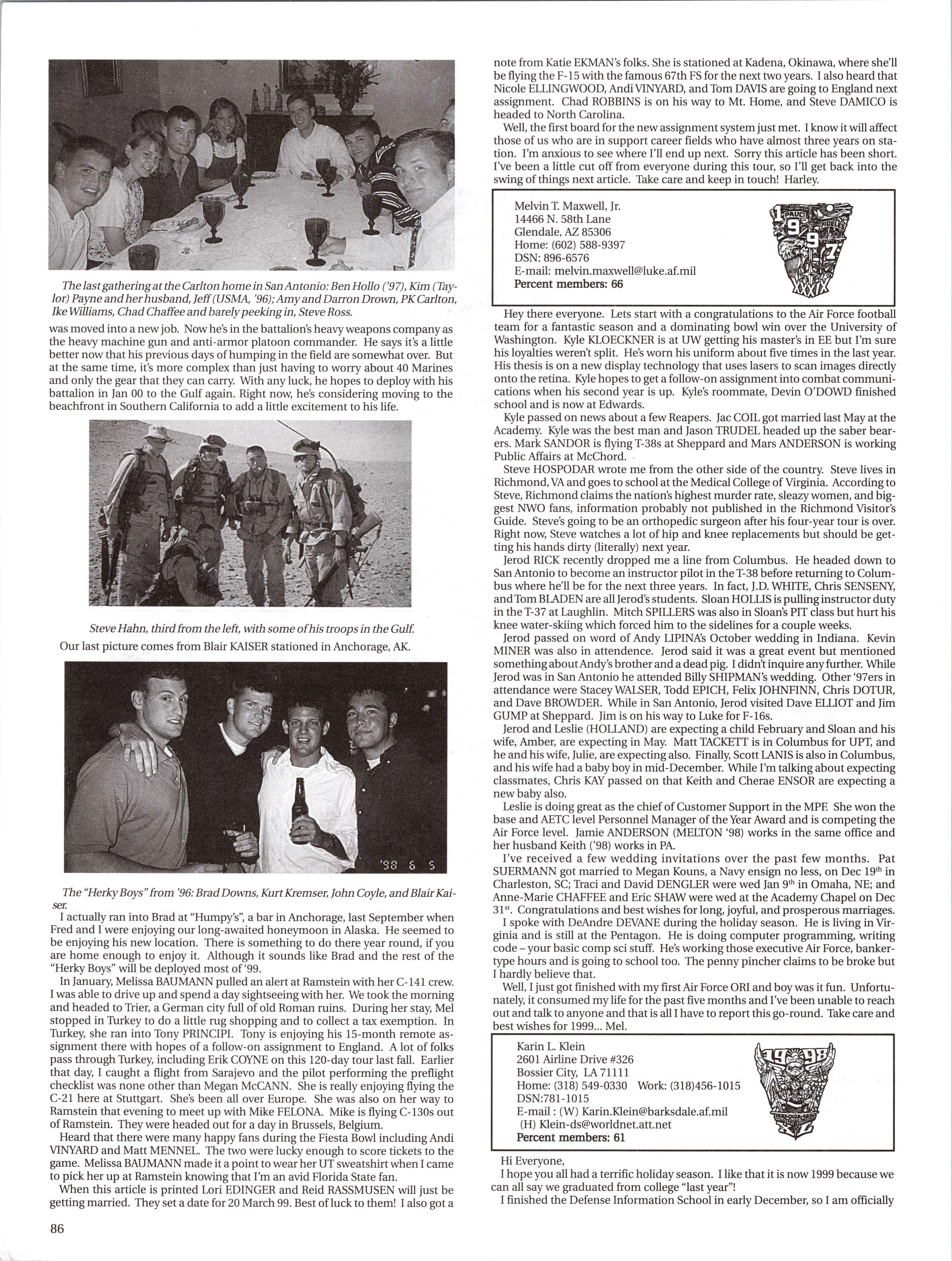 In the last article Chad MARCHESSEAULT, who is on his way to pilot training in Enid, wrote about people who were still at the Academy. But, as brought to my attention by Scott KLEMPNER, I neglected to mention all the AFIT people who are doing language, computer, or master’s programs in the Springs. Scott, Dan DEYOUNG, Michelle ROXBURGH, and Brian EGBERT (who got married soon after graduation) are all in the Space Ops program and will head to Vandenburg at the end ofJune. EricWINTERBOTTOM and Andrea MAUGERI are doing the computer training and Jeremy EDWARDS and Mike CONNERS (among others) are doing the language training. Dre is living in a small honor guard conclave with Sammy BERENGUER and Sean BRAMMER-HOGAN among others, and Derek SALMI and Chad BURDICK left for pilot training in late October.