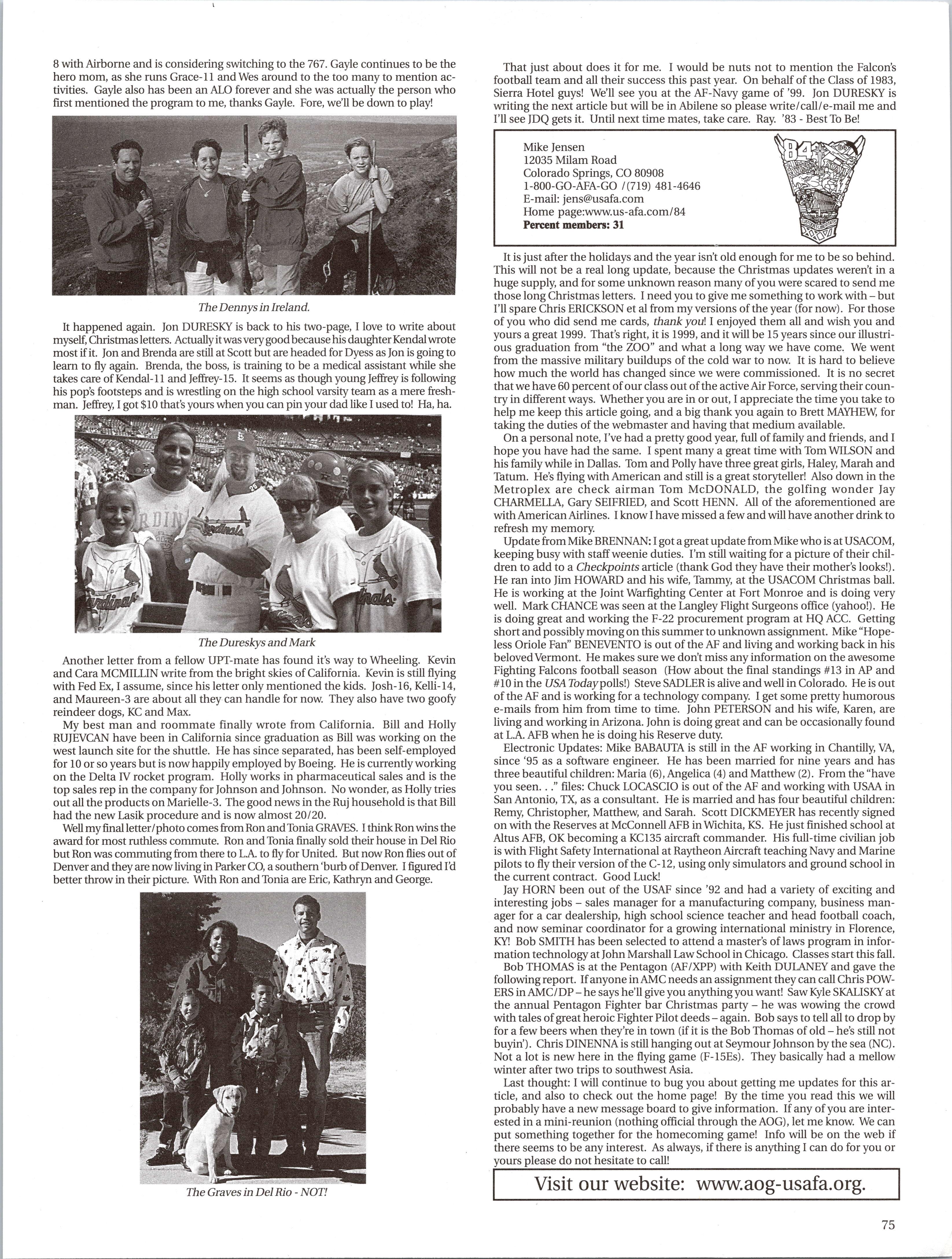 Hey there everyone. Lets start with a congratulations to the Air Force football team for a fantastic season and a dominating bowl win over the University of Washington. Kyle KLOECKNER is at UW getting his master’s in EE but I’m sure his loyalties weren’t split. He’s worn his uniform about five times in the last year. His thesis is on a new display technology that uses lasers to scan images direcdy onto the retina. Kyle hopes to get a follow-on assignment into combat communications when his second year is up. Kyle’s roommate, Devin O’DOWD finished school and is now at Edwards.
