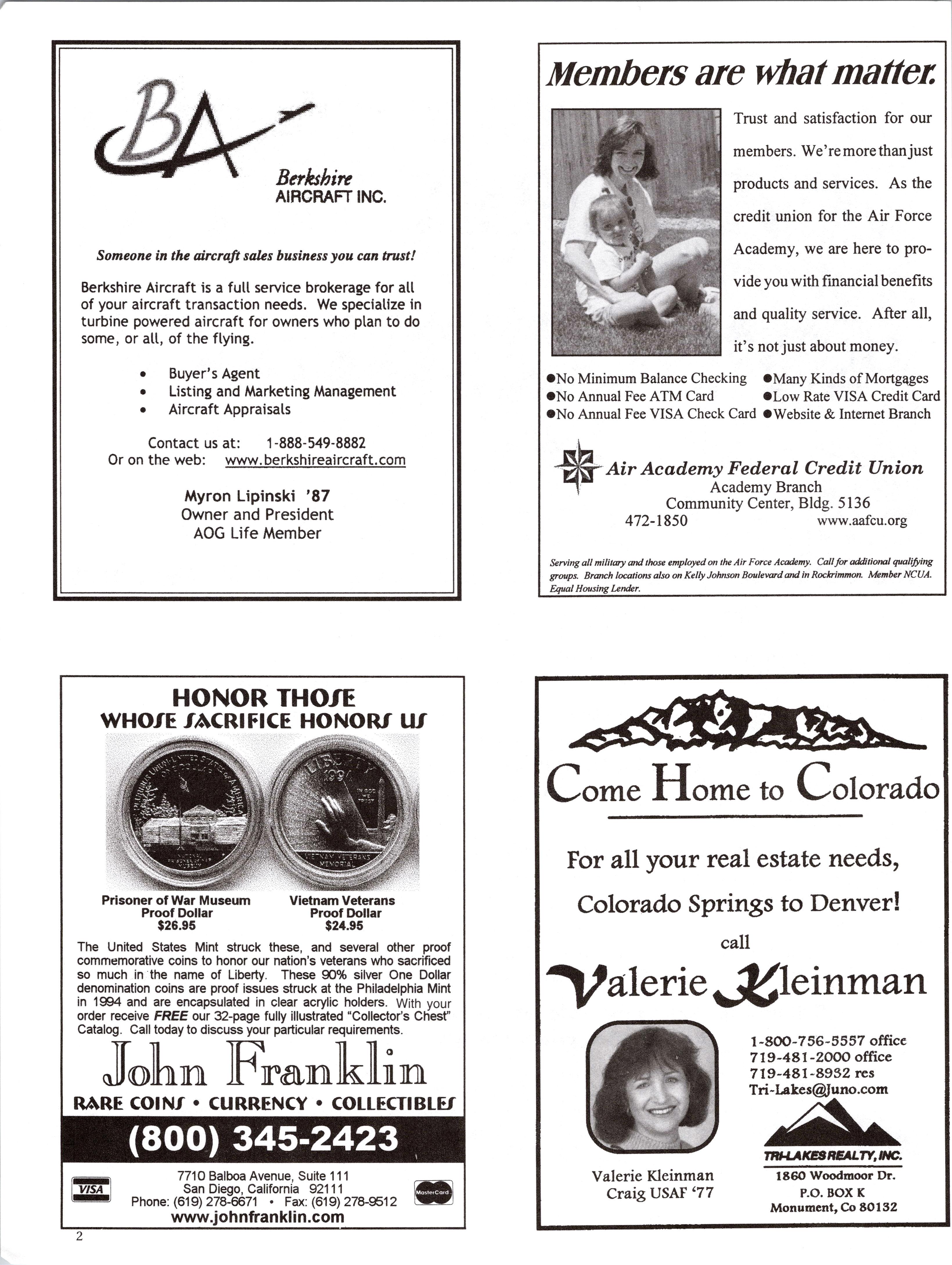 Members are whatmatter. Trust and satisfaction for our members. We’re more thanjust products and services. As the credit union for the Air Force Academy, we are here to provide you with financial benefits and quality service. After all, it’s not just about money. •No Minimum Balance Checking ©Many Kinds ofMortgages •No Annual Fee ATM Card •Low Rate VISA Credit Card •No Annual Fee VISA Check Card •Website & Internet Branch Air Academy Federal Credit Union Academy Branch Community Center, Bldg. 5136 472-1850 www.aafcu.org Serving all military and those employed on the Air Force Academy. Callfor additional qualifying groups. Branch locations also on Kelly Johnson Boulevard and in Rockrimmon. Member NCUA. EqualHousing Lender. HONOR THO/E WHO/E SACRIFICE HONORS US Prisoner of War Museum Proof Dollar $26.95 Vietnam Veterans Proof Dollar $24.95 The United States Mint struck these, and several other proof commemorative coins to honor our nation’s veterans who sacrificed so much in the name of Liberty. These 90% silver One Dollar denomination coins are proof issues struck at the Philadelphia Mint in 1994 and are encapsulated in clear acrylic holders. With your order receive FREE our 32-page fully illustrated “Collector’s Chest” Catalog. Call today to discuss your particular requirements. Jolm JRran RARE COIN/ CURRENCY • COLLECTIBLE/ (800) 345-2423 7710 Balboa Avenue, Suite 111 San Diego, California 92111 Phone:(619)278-6671 Fax:(619)278-9512 www.johnfranklin.com VISA For all your real estate needs, Colorado Springs to Denver! call ^/alerie^Jleinman l-SOO-756-5557 office 719-481-2000 office 719-481-8932 res Tri-Lakes@Juno.com TRI-LAKESREALTY,INC. 1860 Woodmoor Dr. P.O. BOX K Monument, Co 80132 Valerie Kleinman Craig USAF ‘77