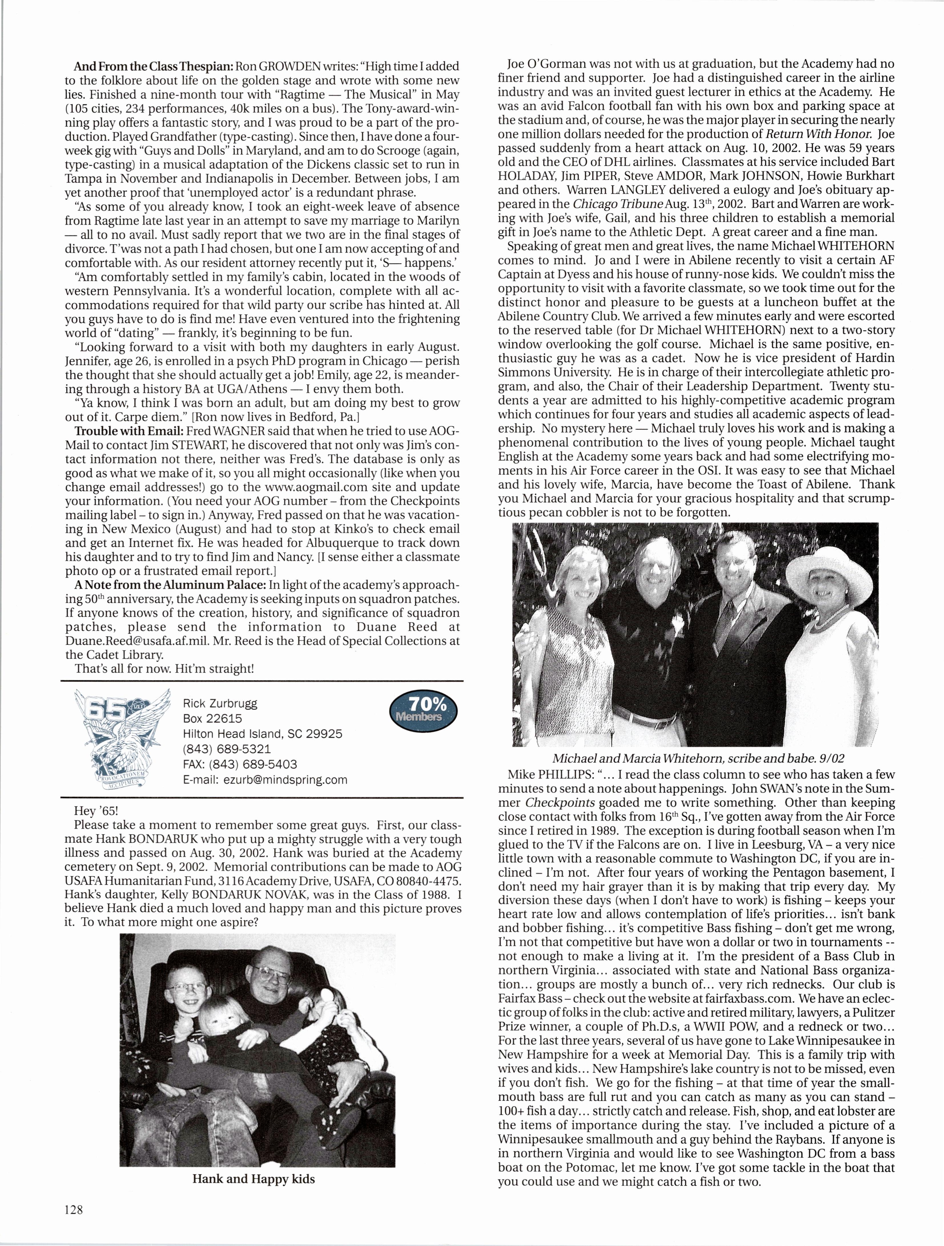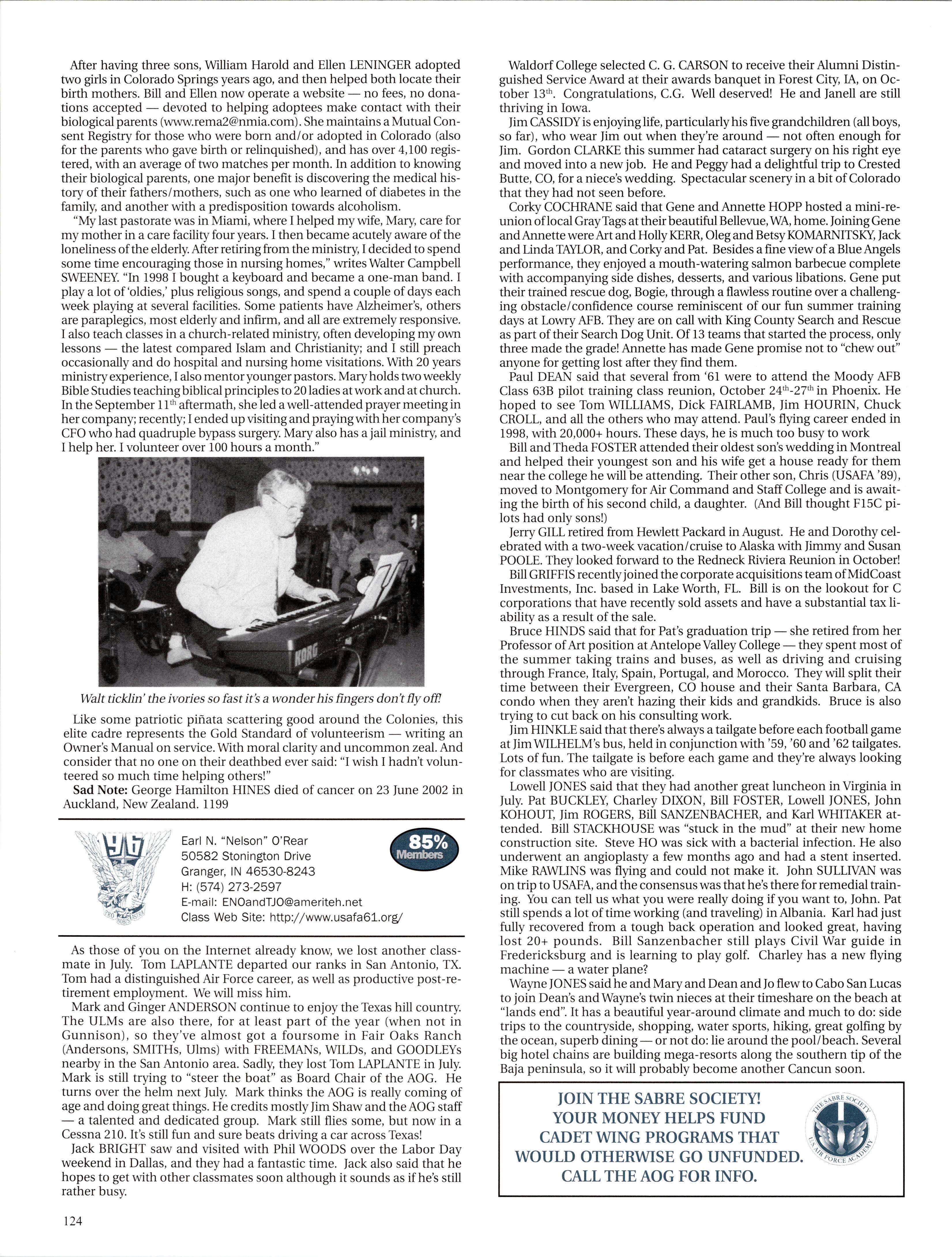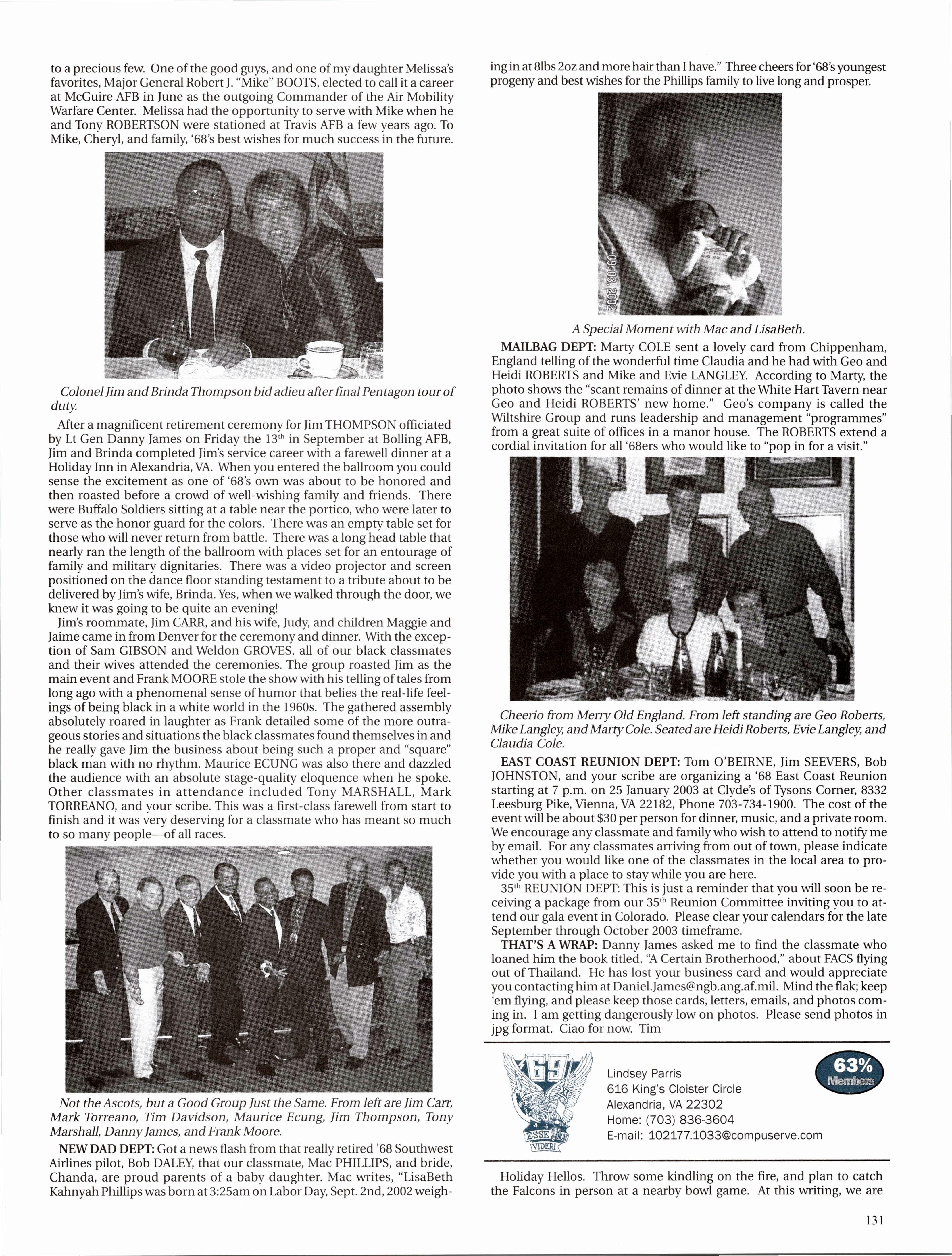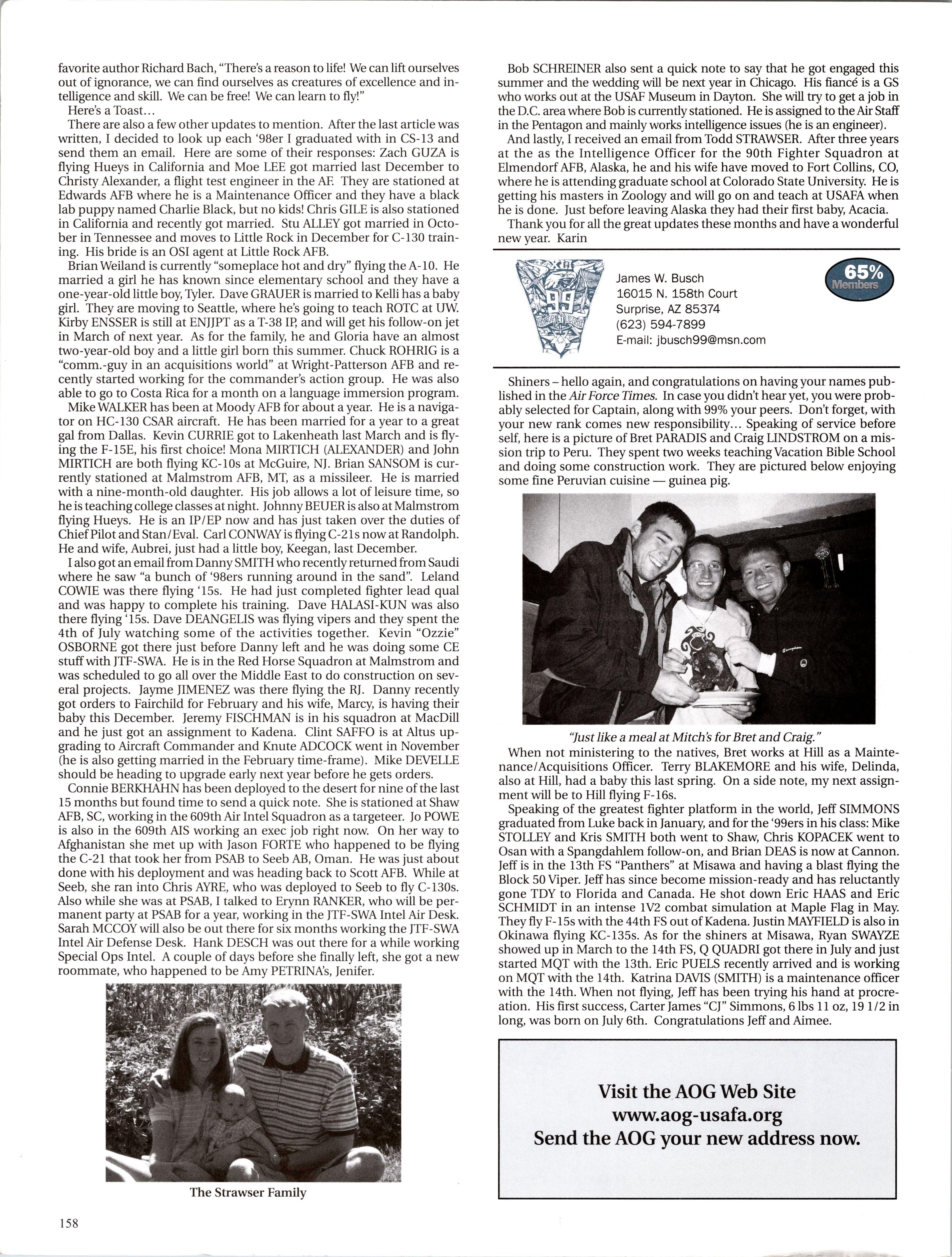And lastly, I received an email from Todd STRAWSER. After three years at the as the Intelligence Officer for the 90th Fighter Squadron at Elmendorf AFB, Alaska, he and his wife have moved to Fort Collins, CO, where he is attending graduate school at Colorado State University. He is getting his masters in Zoology and will go on and teach at USAFA when he is done. Just before leaving Alaska they had their first baby, Acacia.