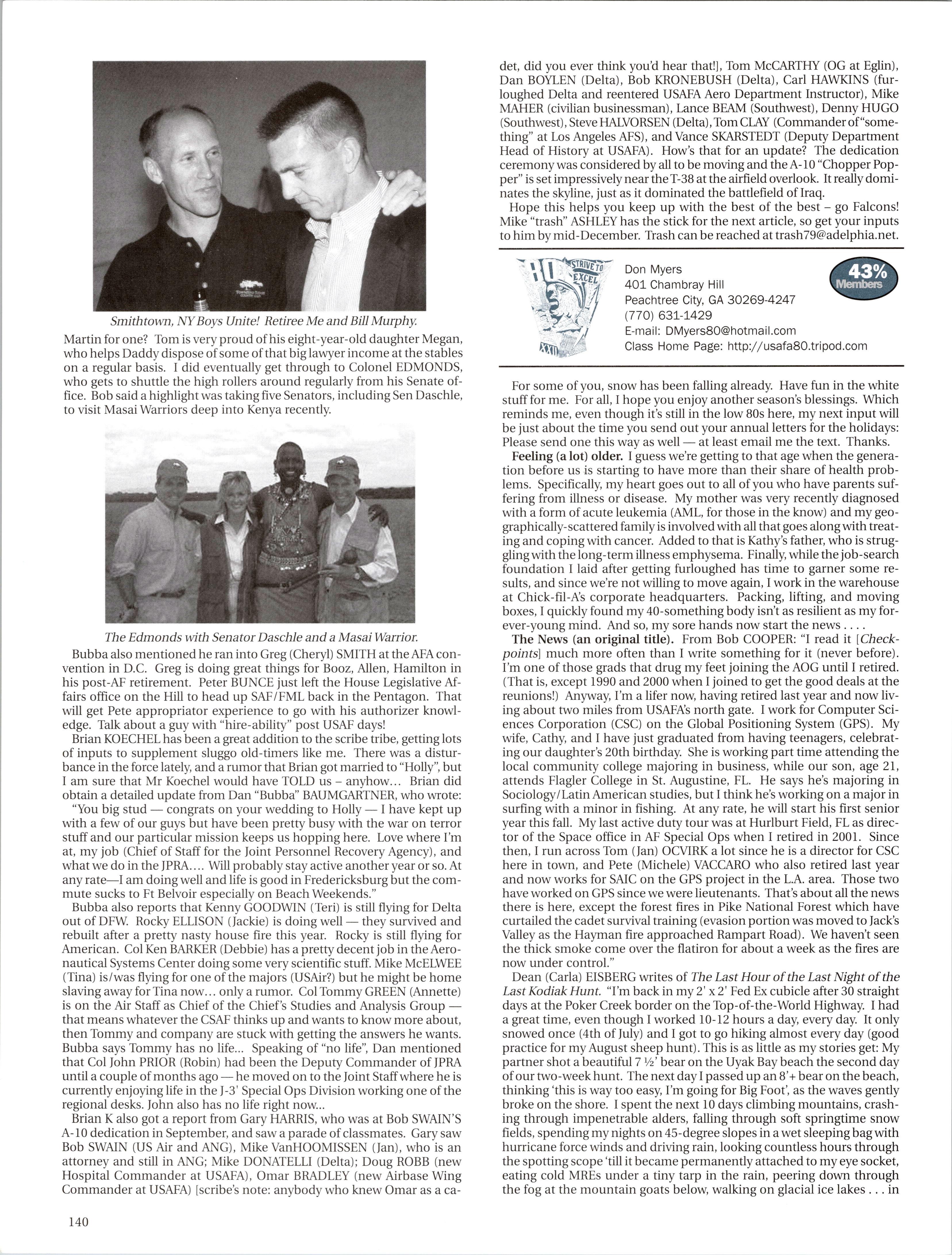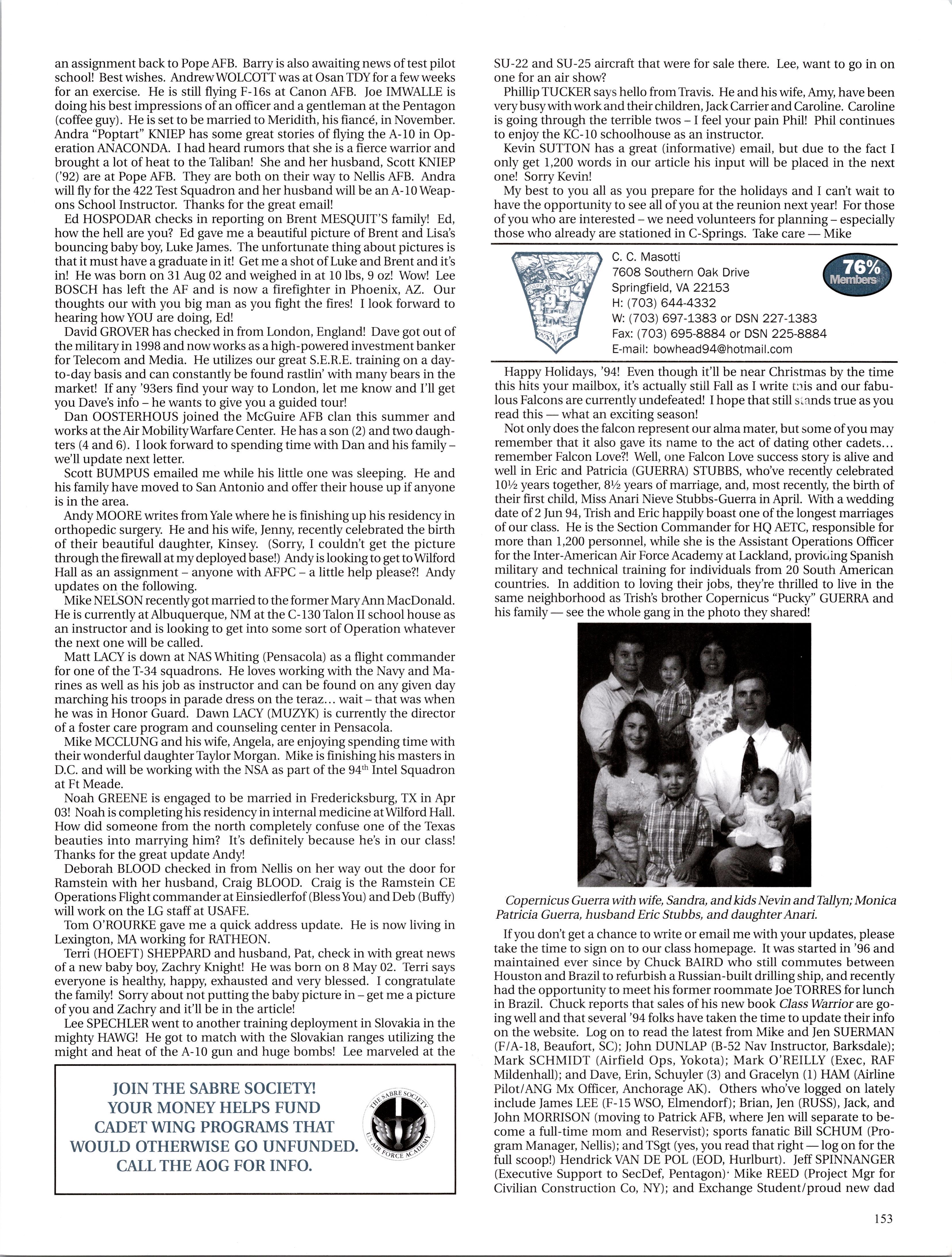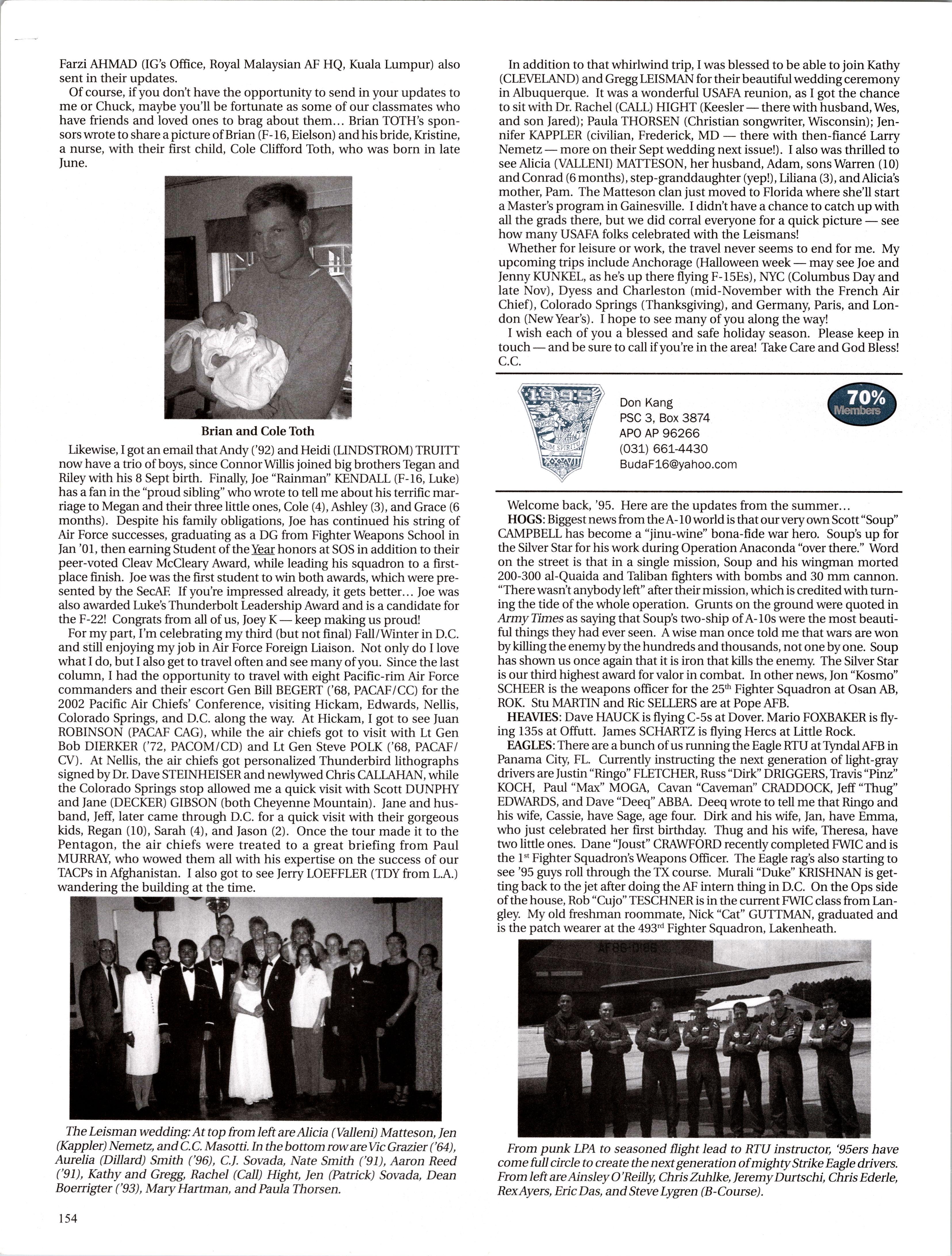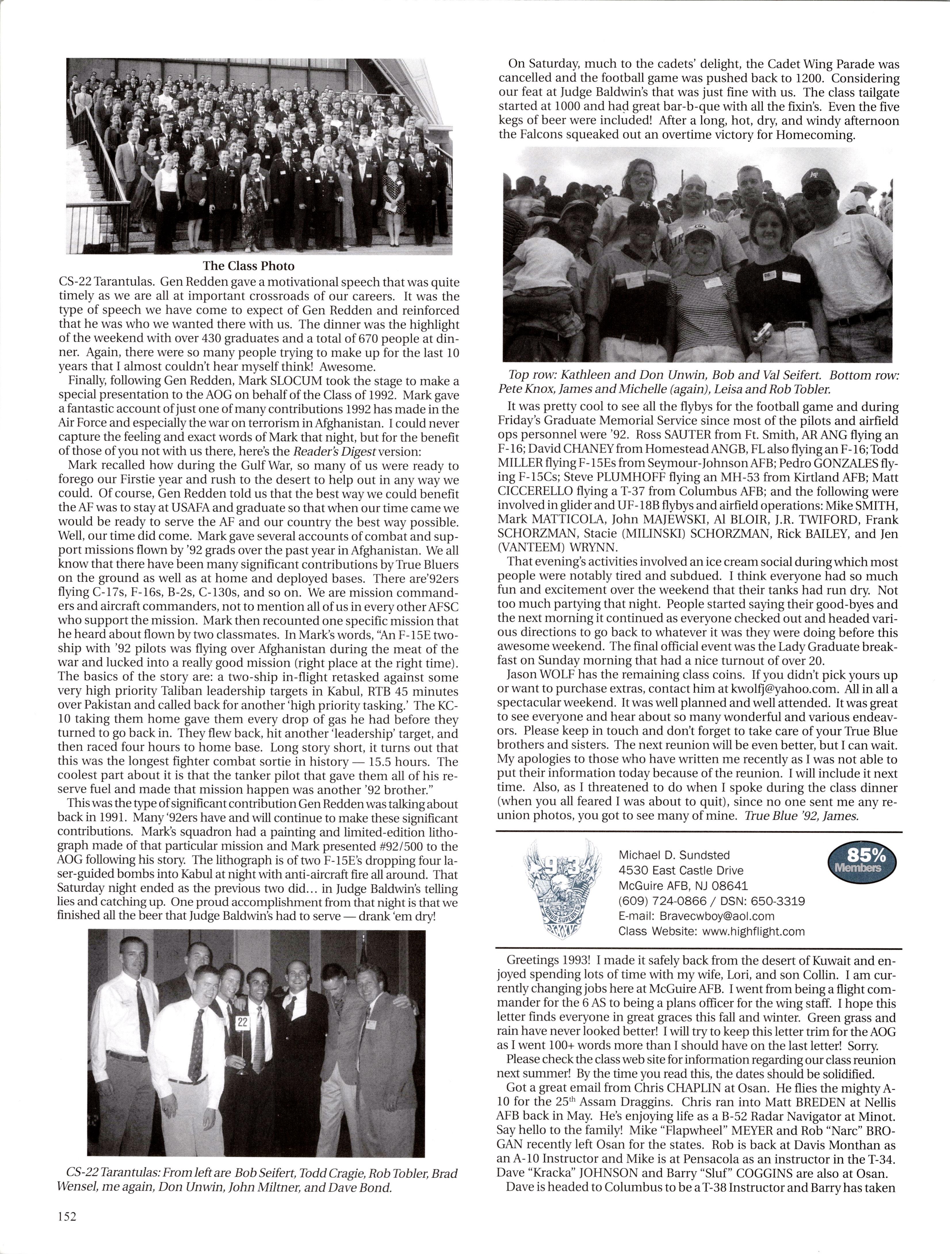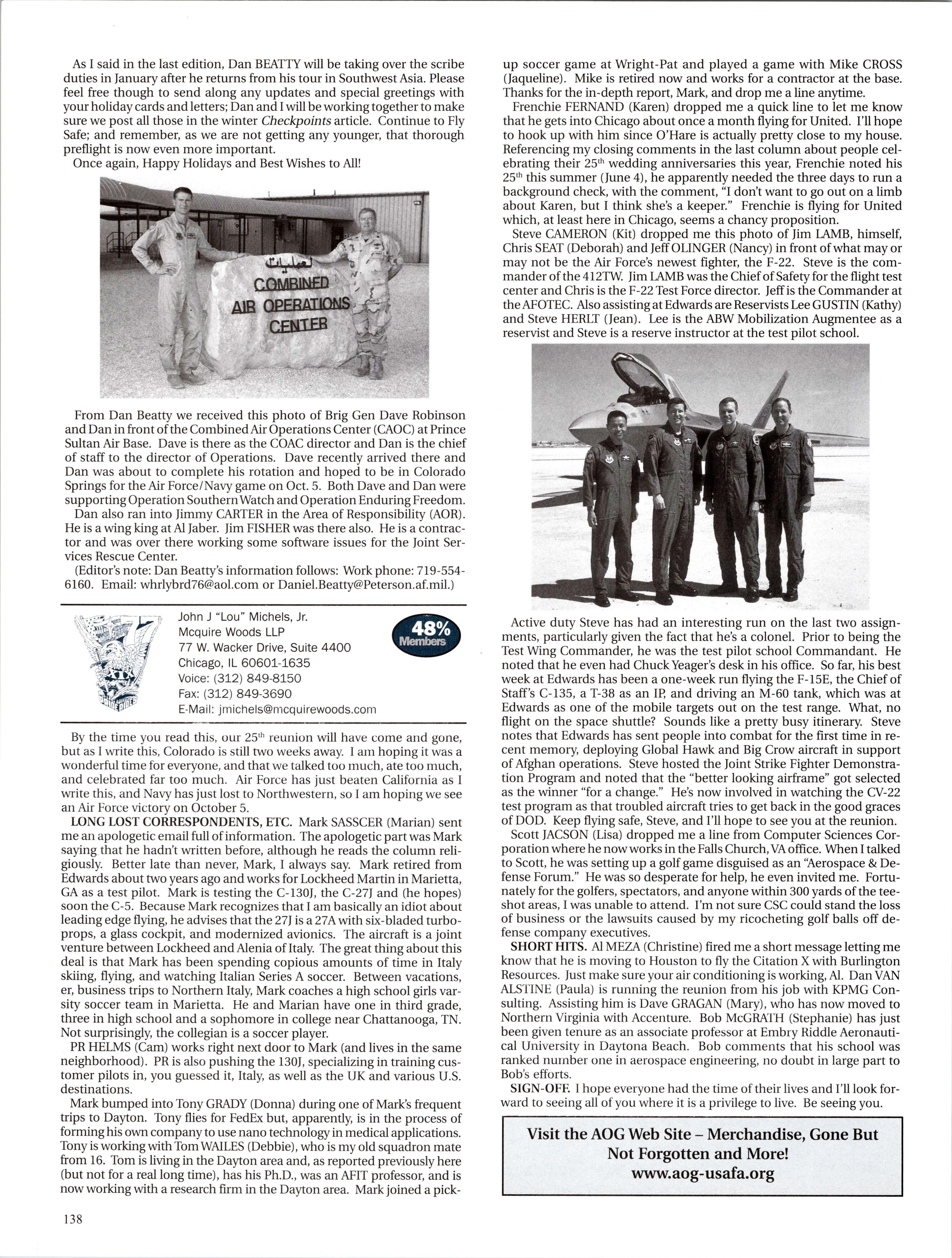 MattVAN HOOK wrote upon return from a 45-day deployment to “Base X” in the Middle East. He flies out of Grand Forks, which has been the lead tanker wing at one of primary undisclosed locations for Enduring Freedom. Fellow KC-135ers Luke BINDRIEFF, Dan HASLEY, JoshJENSEN, Scott RUSSELL, and Rob SLANGER have been flying lots of 01 combat sorties and receivingAir Medals. Currently Rob leads the medal race with five oak leaf clusters and working on his sixth (just like the old saying: “Wings of Blue...”). The price tag has been over 200 days TDY for these brave lads and their families. C-5 and C-17 airlift guys like Eric SWARTZWELDER, Ben JONSSON, Dave PETERS, and Matt BRANCATO have also been flying countless Enduring Freedom missions. A job well done, people. You have the respect and admiration of the rest of us. For all ofyou still over there, fly/be safe and God bless.