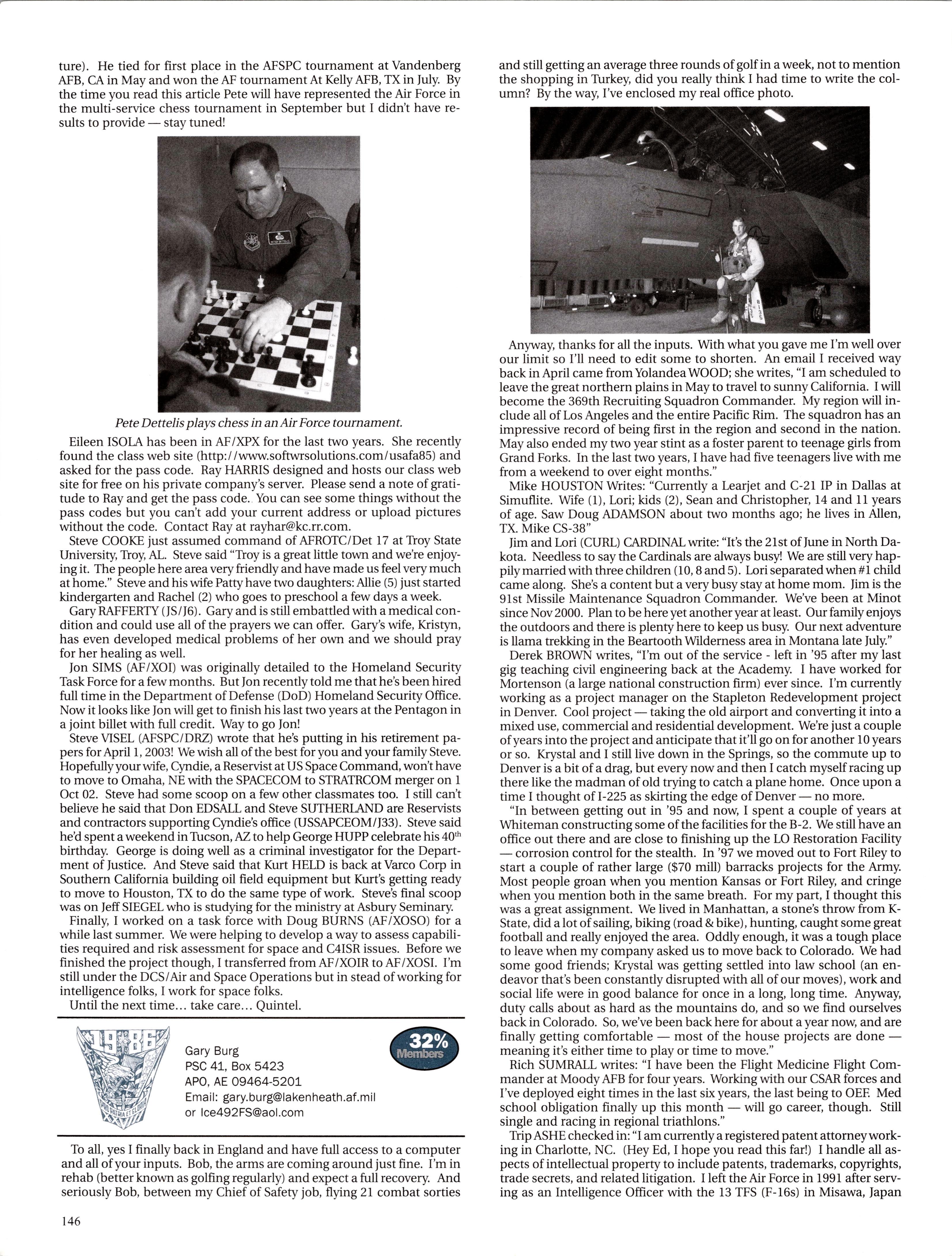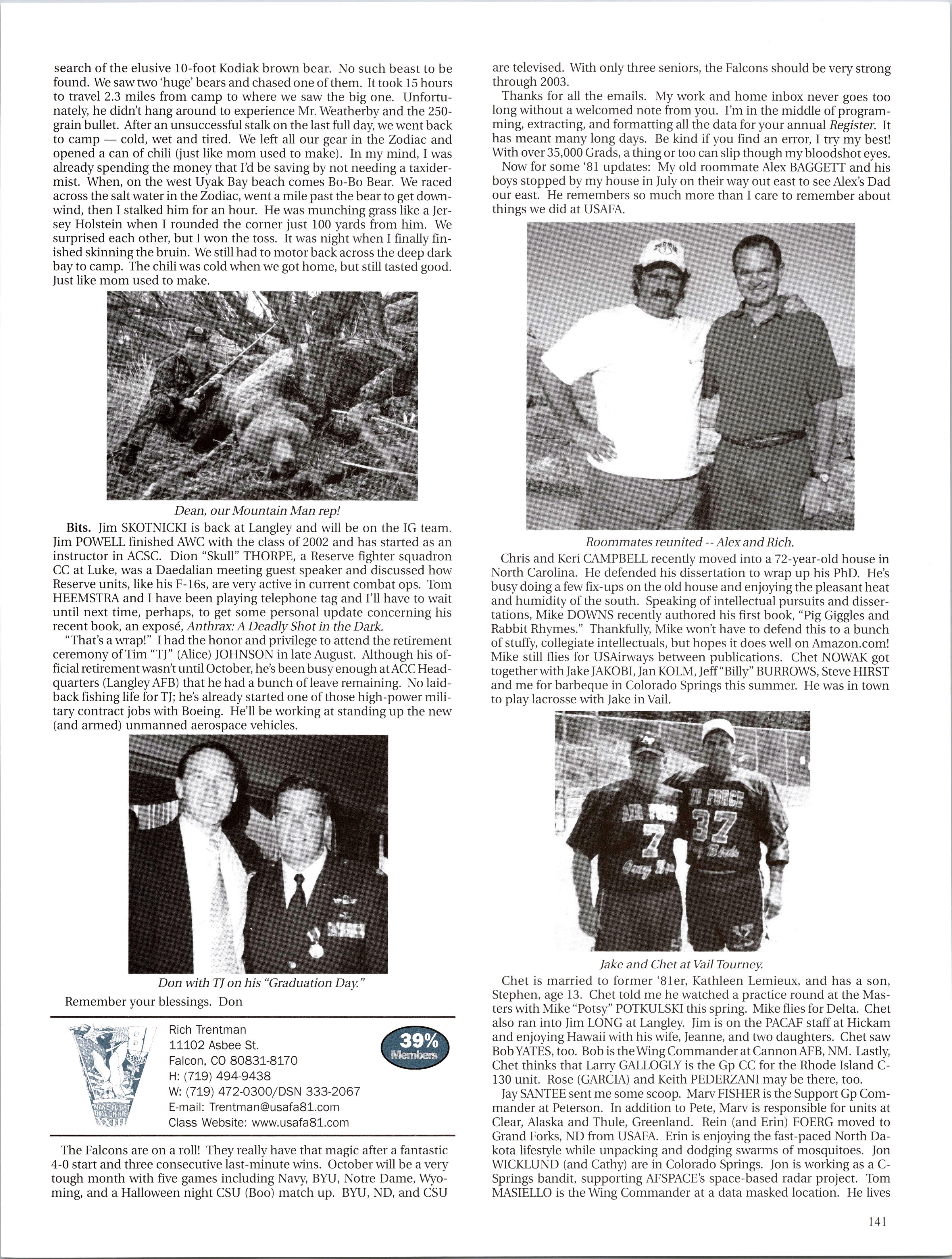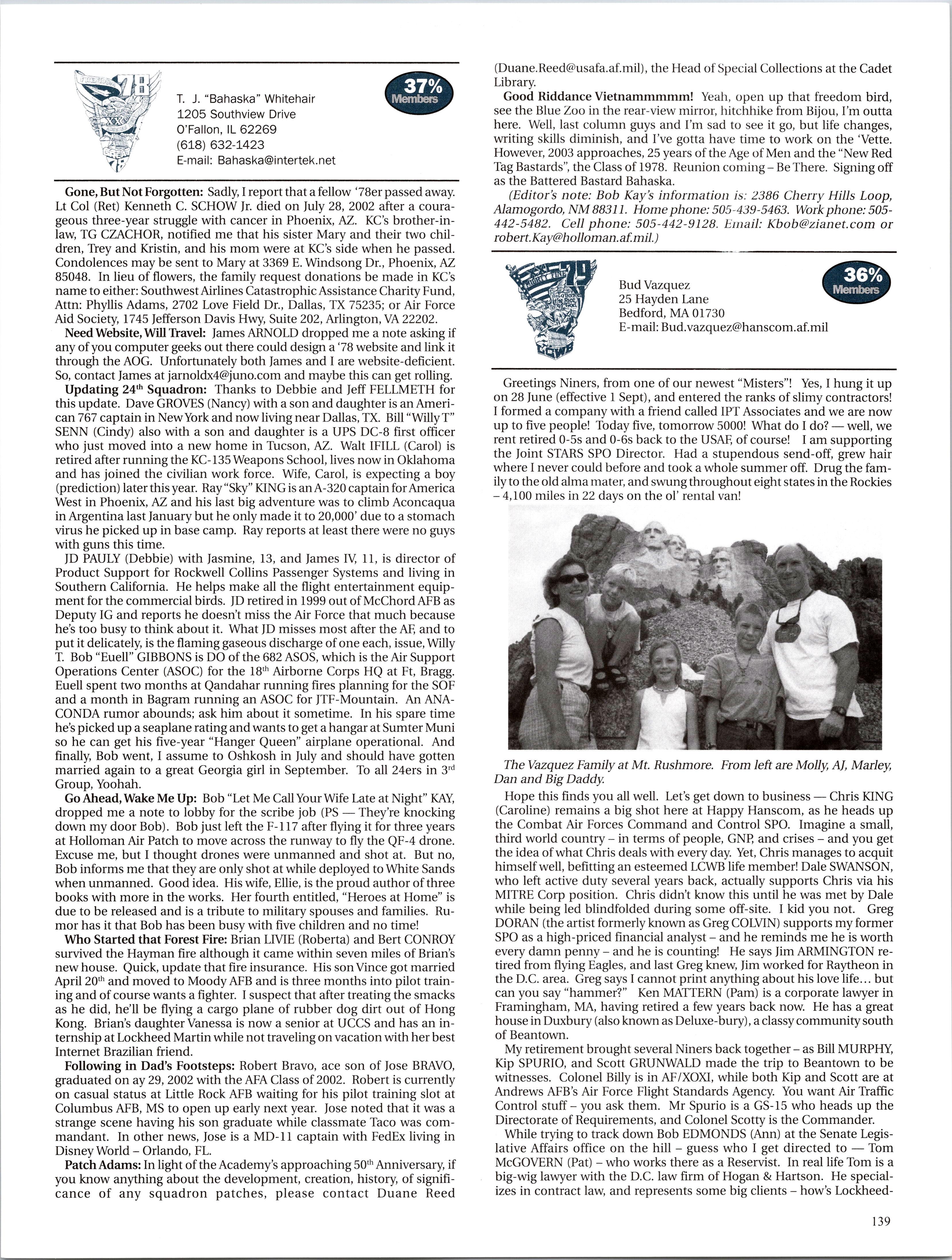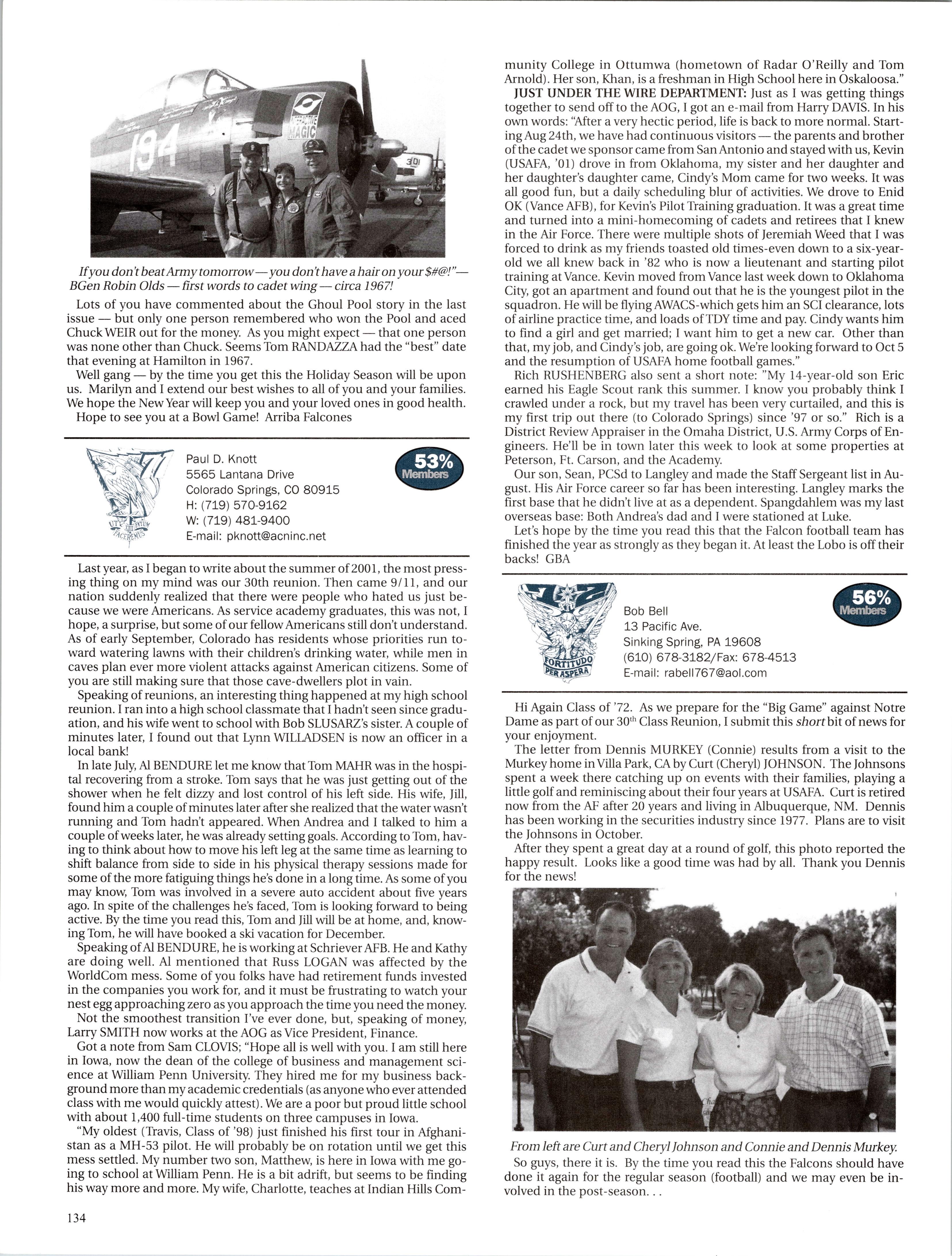 MattVAN HOOK wrote upon return from a 45-day deployment to “Base X” in the Middle East. He flies out of Grand Forks, which has been the lead tanker wing at one of primary undisclosed locations for Enduring Freedom. Fellow KC-135ers Luke BINDRIEFF, Dan HASLEY, JoshJENSEN, Scott RUSSELL, and Rob SLANGER have been flying lots of 01 combat sorties and receivingAir Medals. Currently Rob leads the medal race with five oak leaf clusters and working on his sixth (just like the old saying: “Wings of Blue...”). The price tag has been over 200 days TDY for these brave lads and their families. C-5 and C-17 airlift guys like Eric SWARTZWELDER, Ben JONSSON, Dave PETERS, and Matt BRANCATO have also been flying countless Enduring Freedom missions. A job well done, people. You have the respect and admiration of the rest of us. For all ofyou still over there, fly/be safe and God bless.