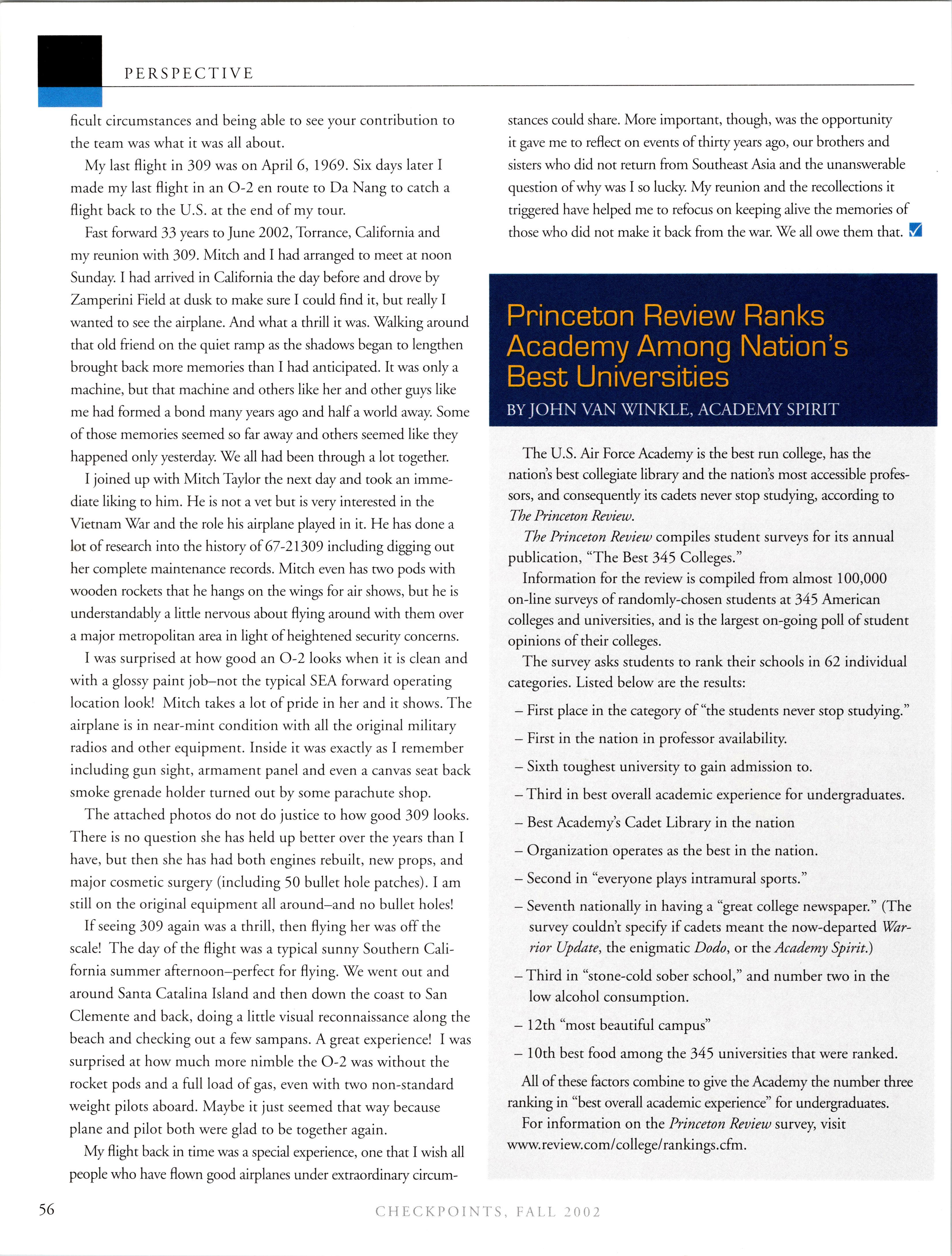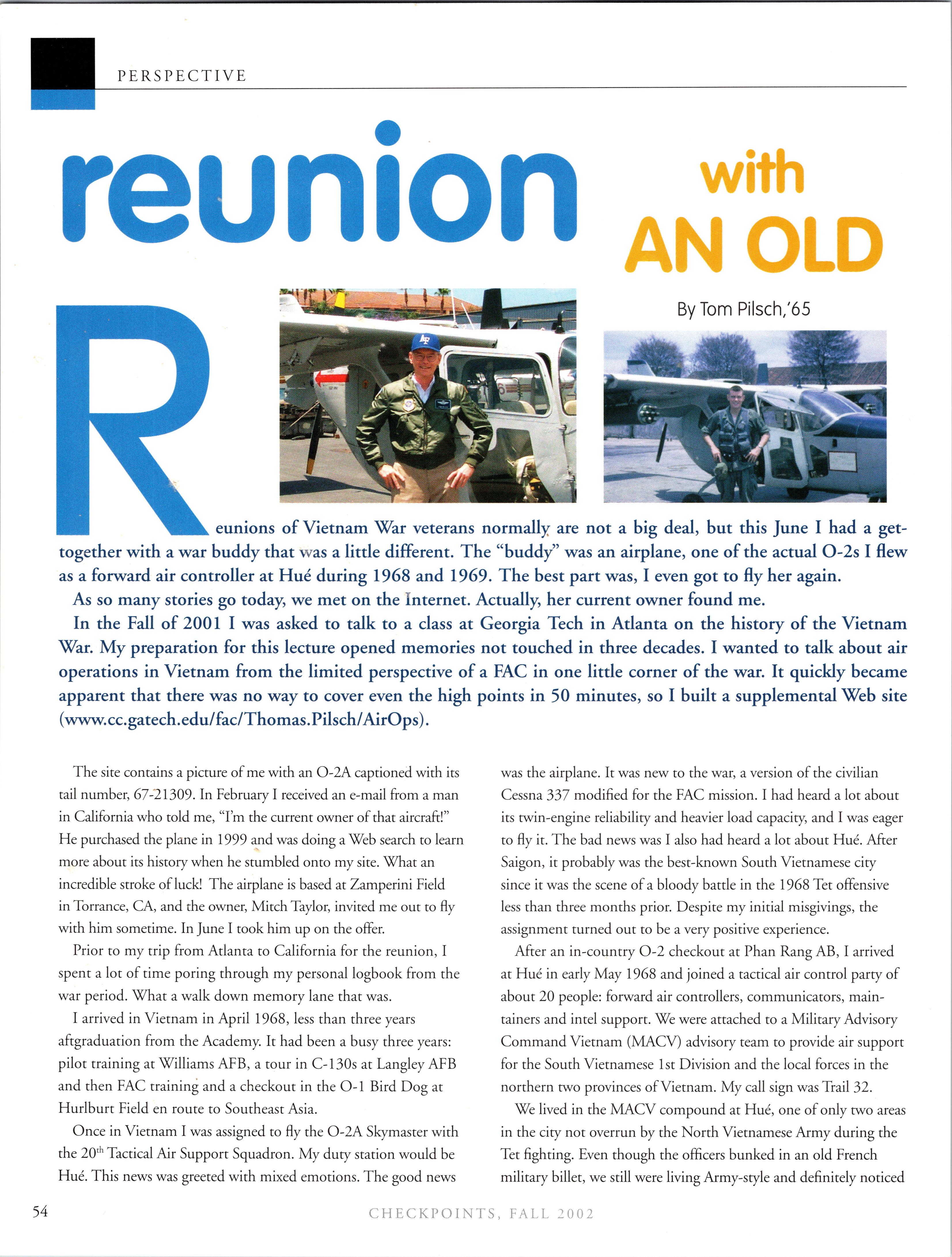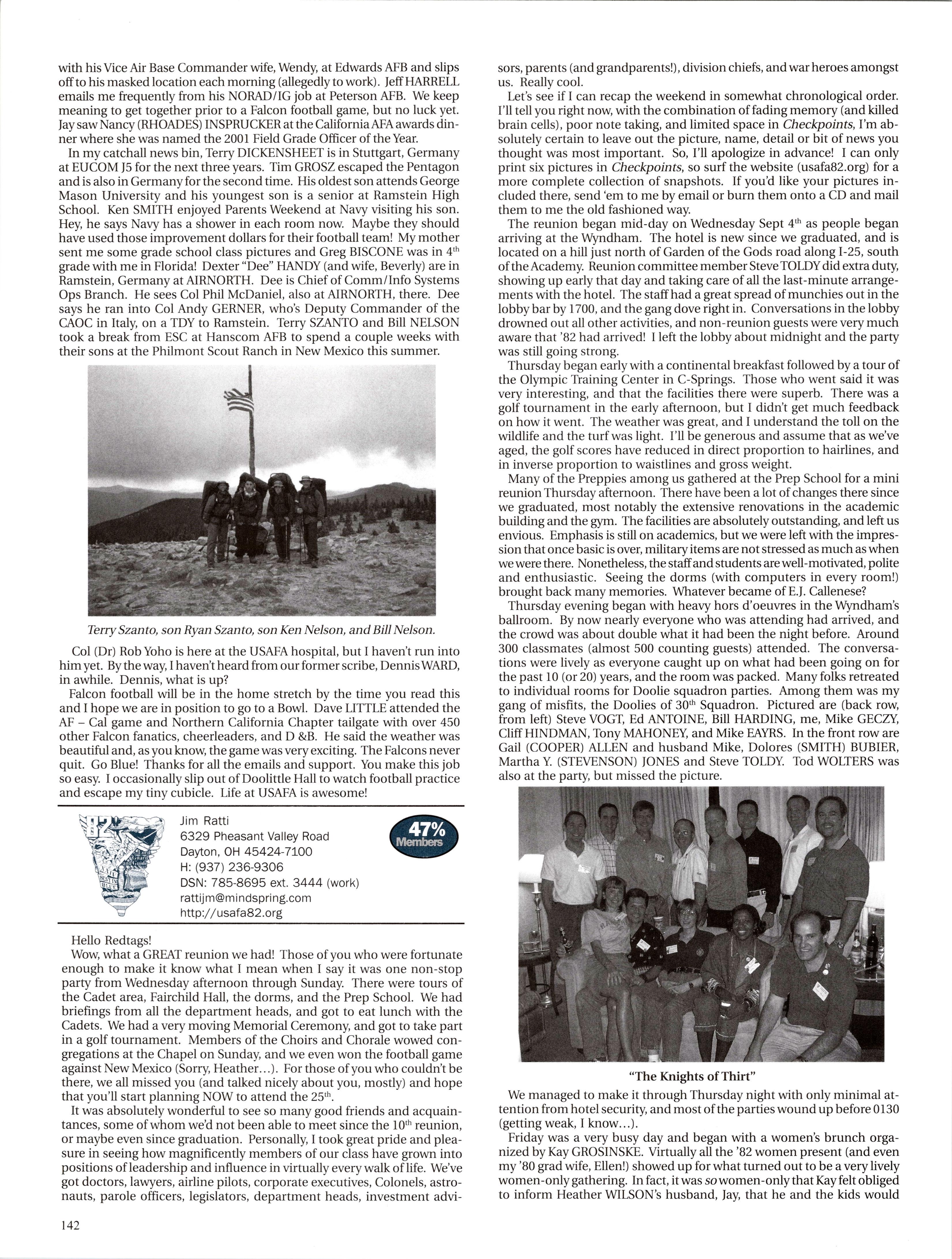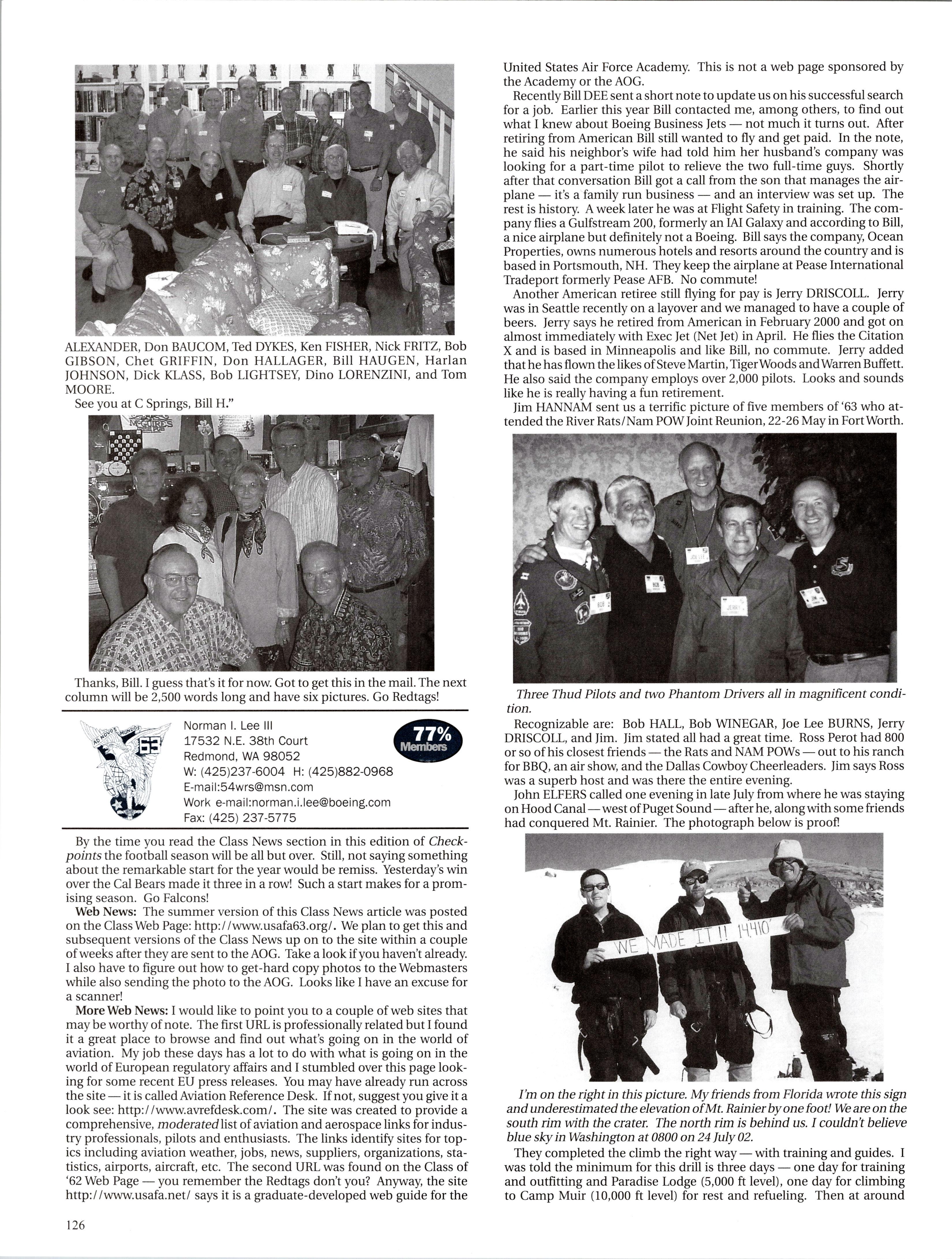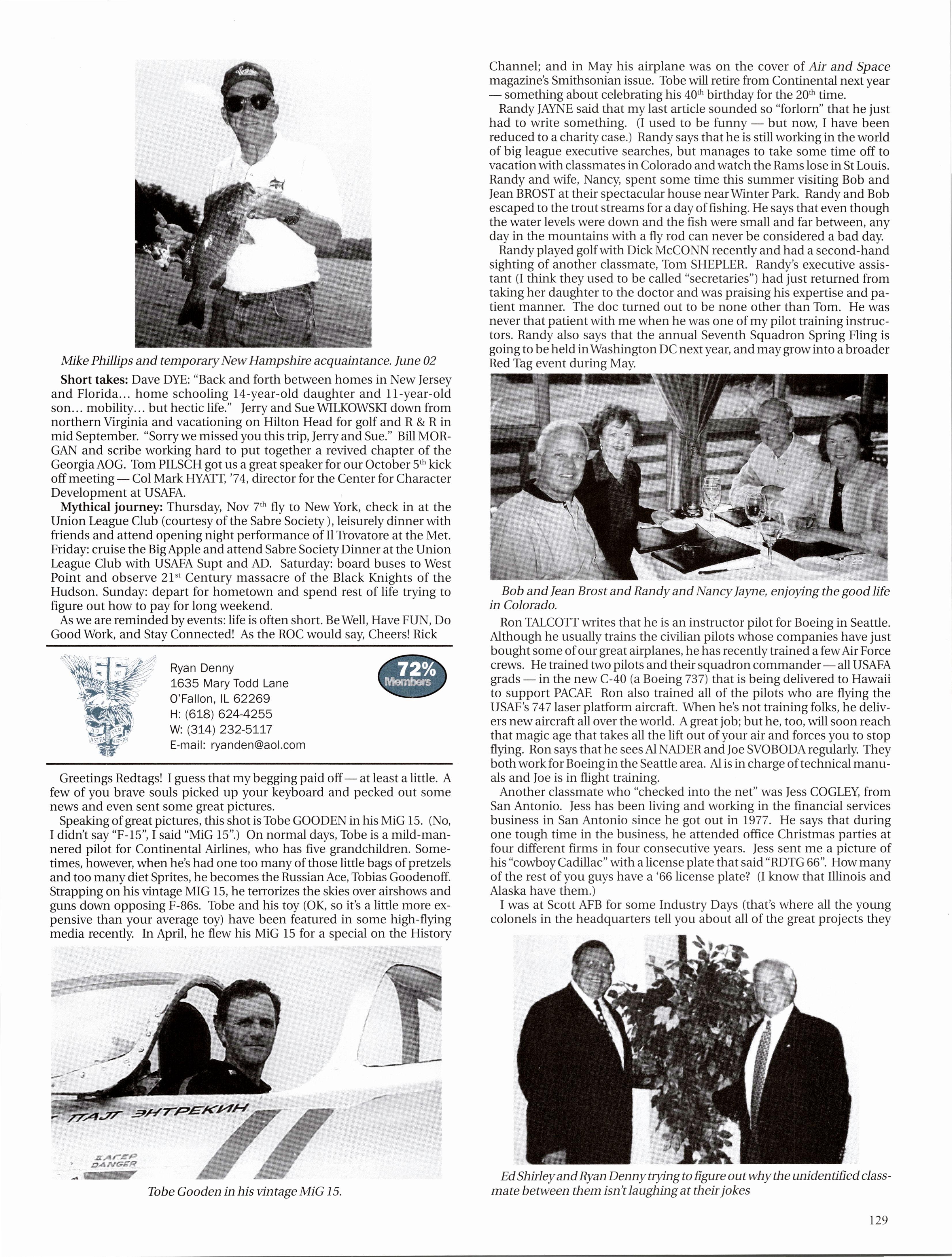 MattVAN HOOK wrote upon return from a 45-day deployment to “Base X” in the Middle East. He flies out of Grand Forks, which has been the lead tanker wing at one of primary undisclosed locations for Enduring Freedom. Fellow KC-135ers Luke BINDRIEFF, Dan HASLEY, JoshJENSEN, Scott RUSSELL, and Rob SLANGER have been flying lots of 01 combat sorties and receivingAir Medals. Currently Rob leads the medal race with five oak leaf clusters and working on his sixth (just like the old saying: “Wings of Blue...”). The price tag has been over 200 days TDY for these brave lads and their families. C-5 and C-17 airlift guys like Eric SWARTZWELDER, Ben JONSSON, Dave PETERS, and Matt BRANCATO have also been flying countless Enduring Freedom missions. A job well done, people. You have the respect and admiration of the rest of us. For all ofyou still over there, fly/be safe and God bless.