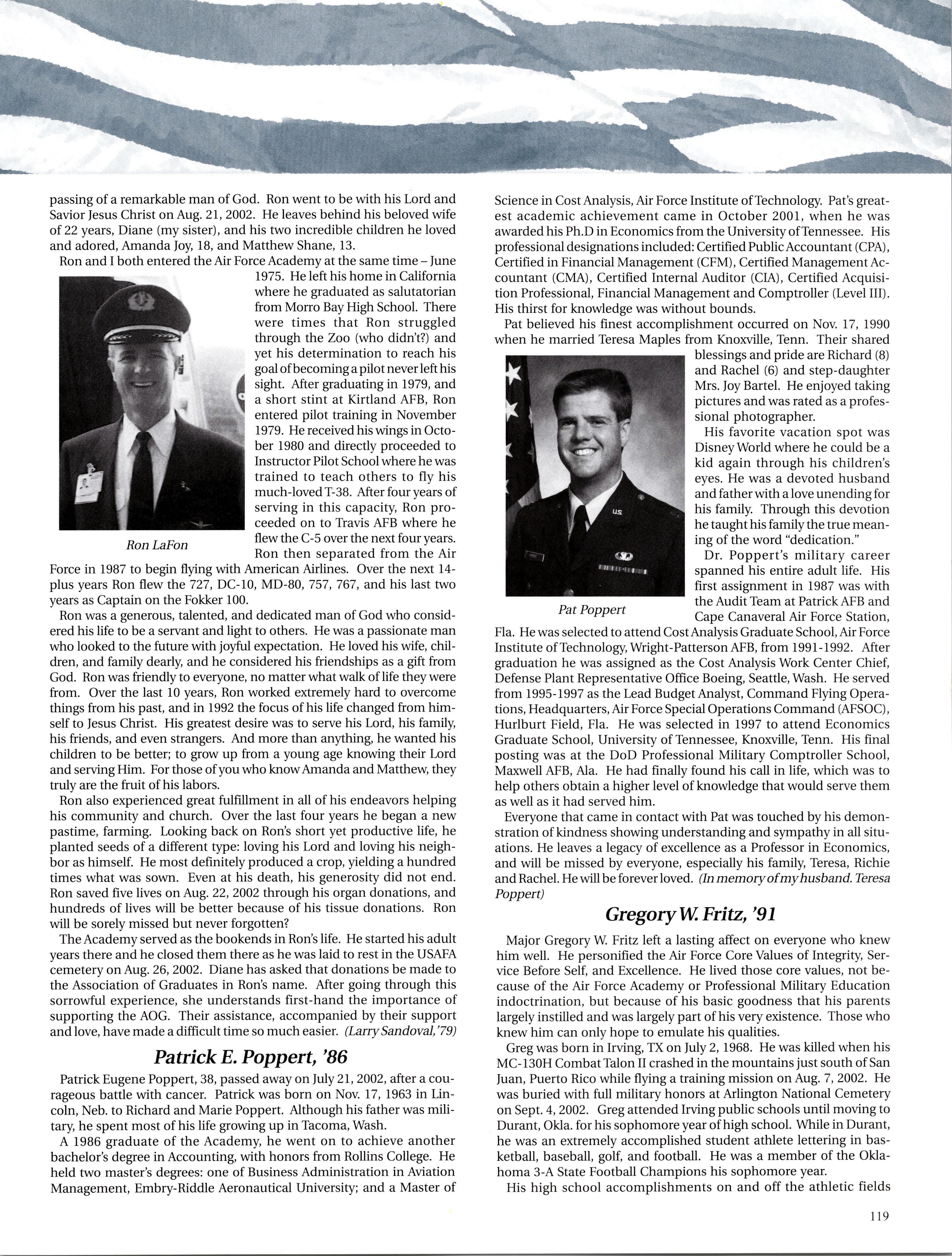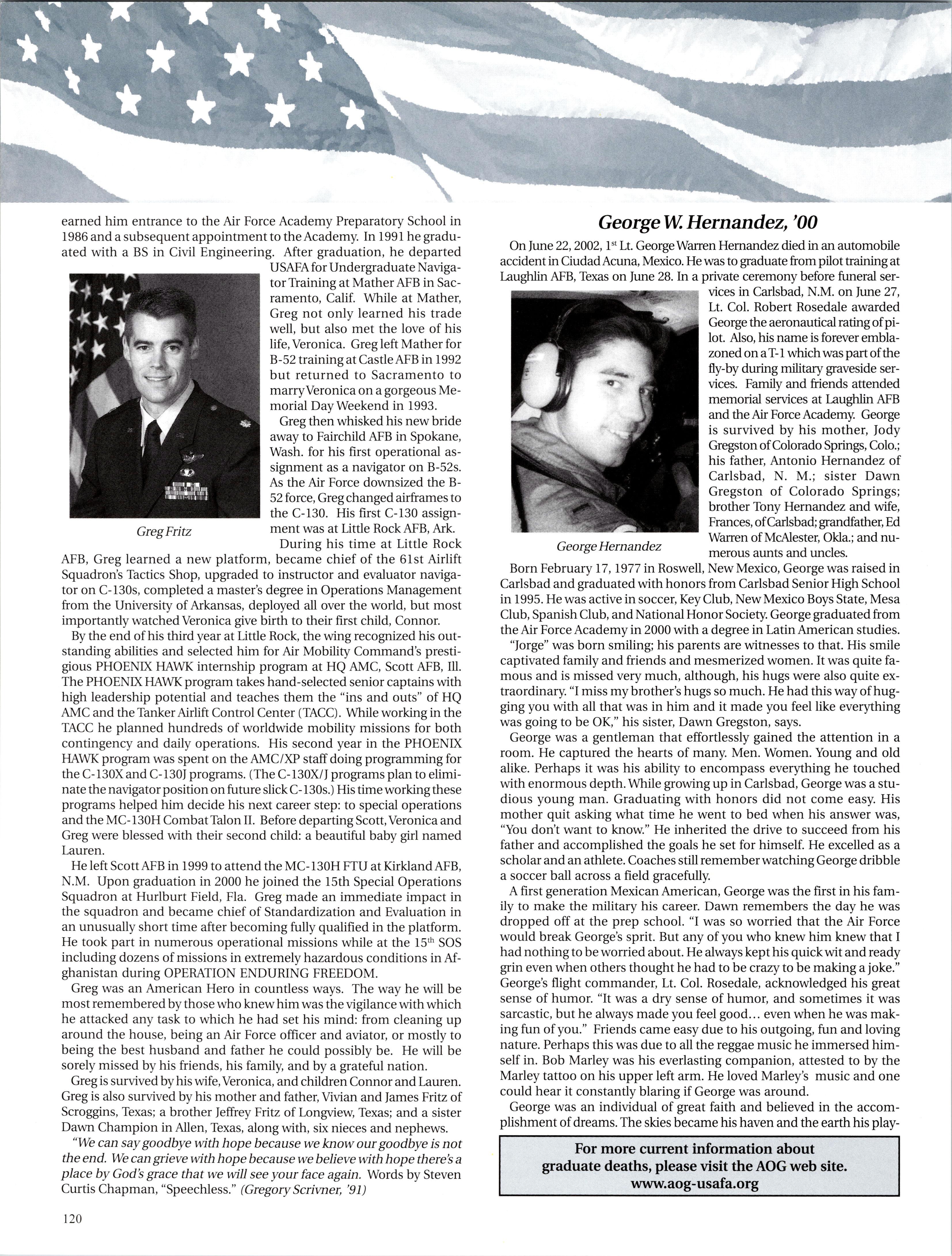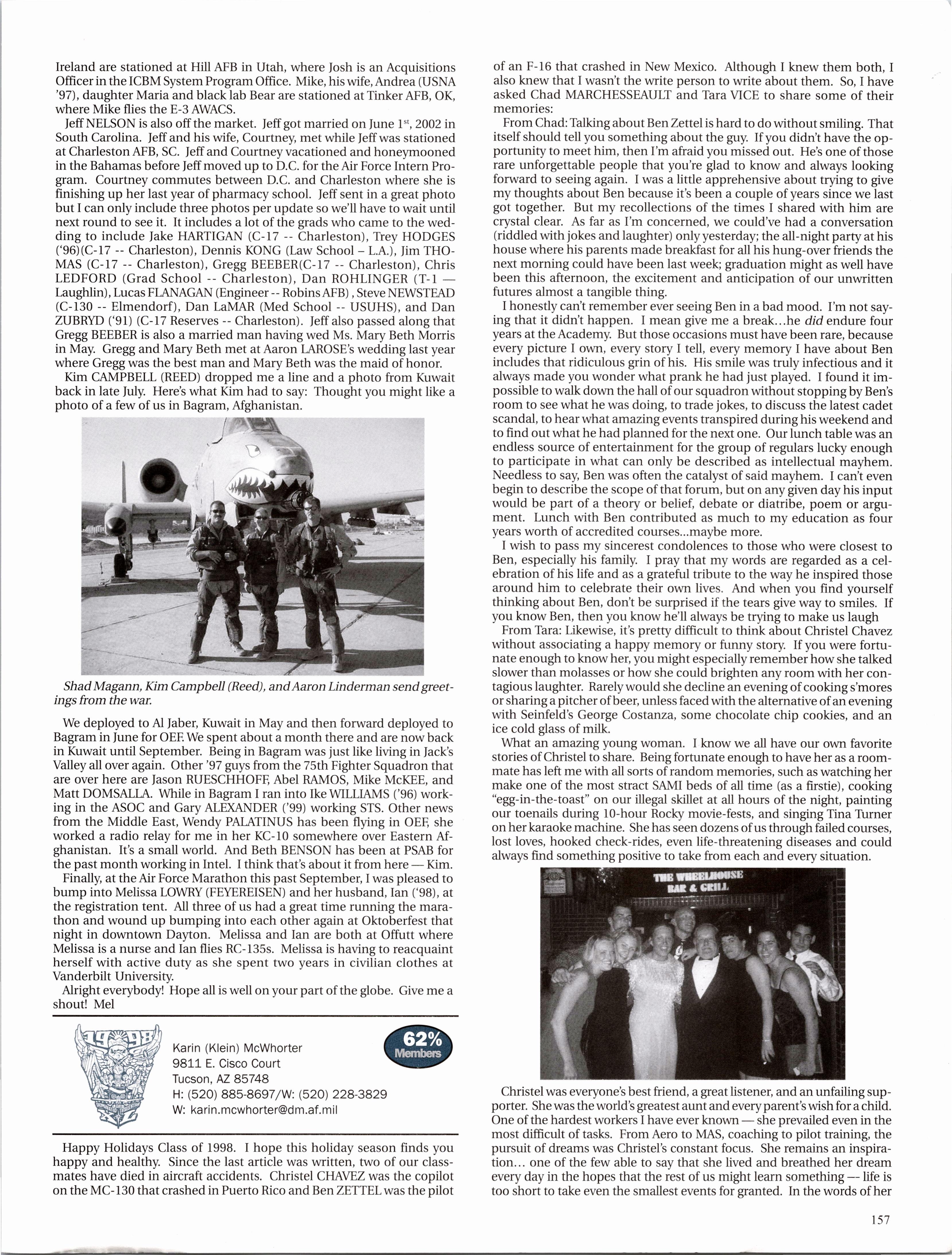 Happy Holidays Class of 1998. I hope this holiday season finds you happy and healthy. Since the last article was written, two of our classmates have died in aircraft accidents. Christel CHAVEZ was the copilot on the MC-130 that crashed in Puerto Rico and Ben ZETTEL was the pilot