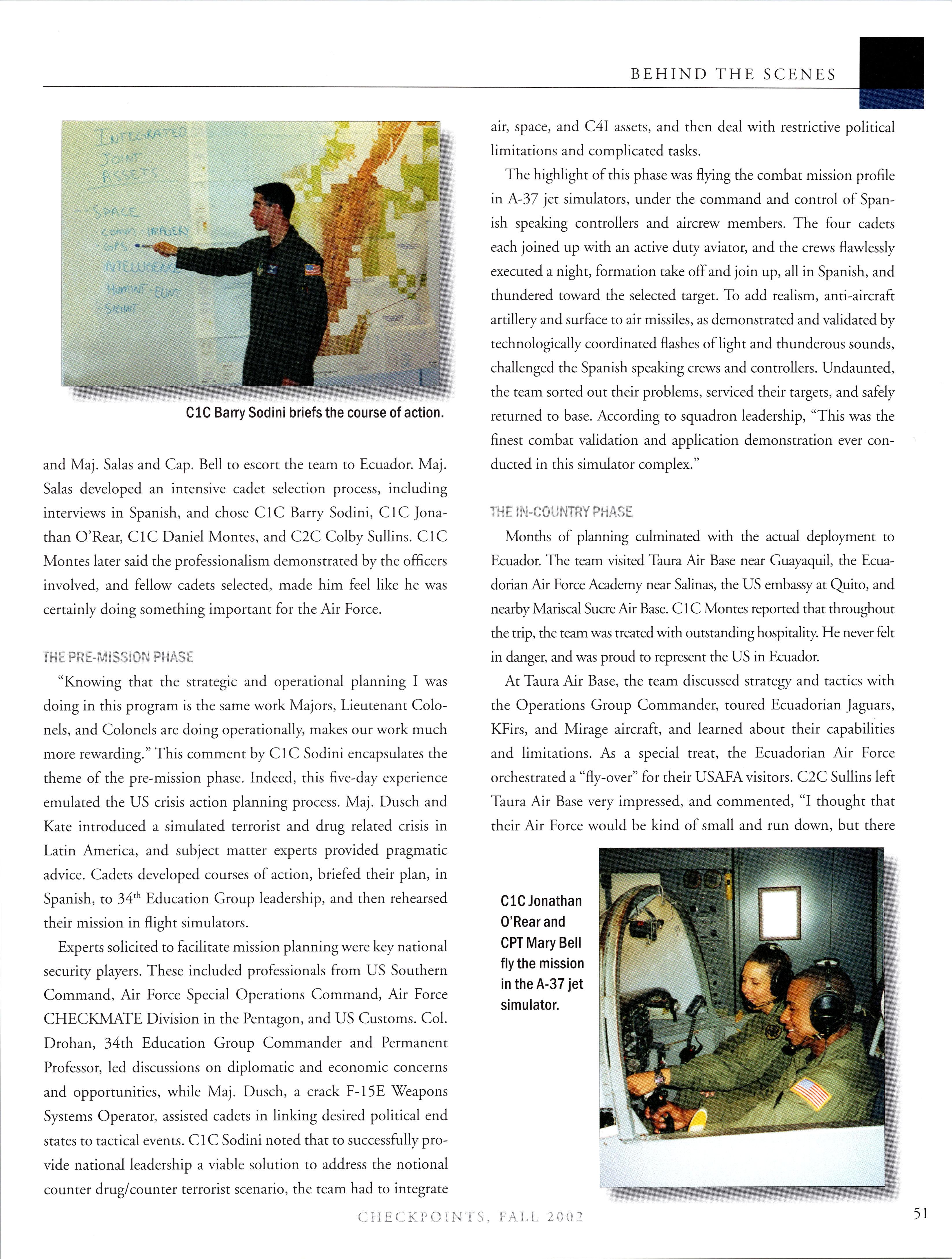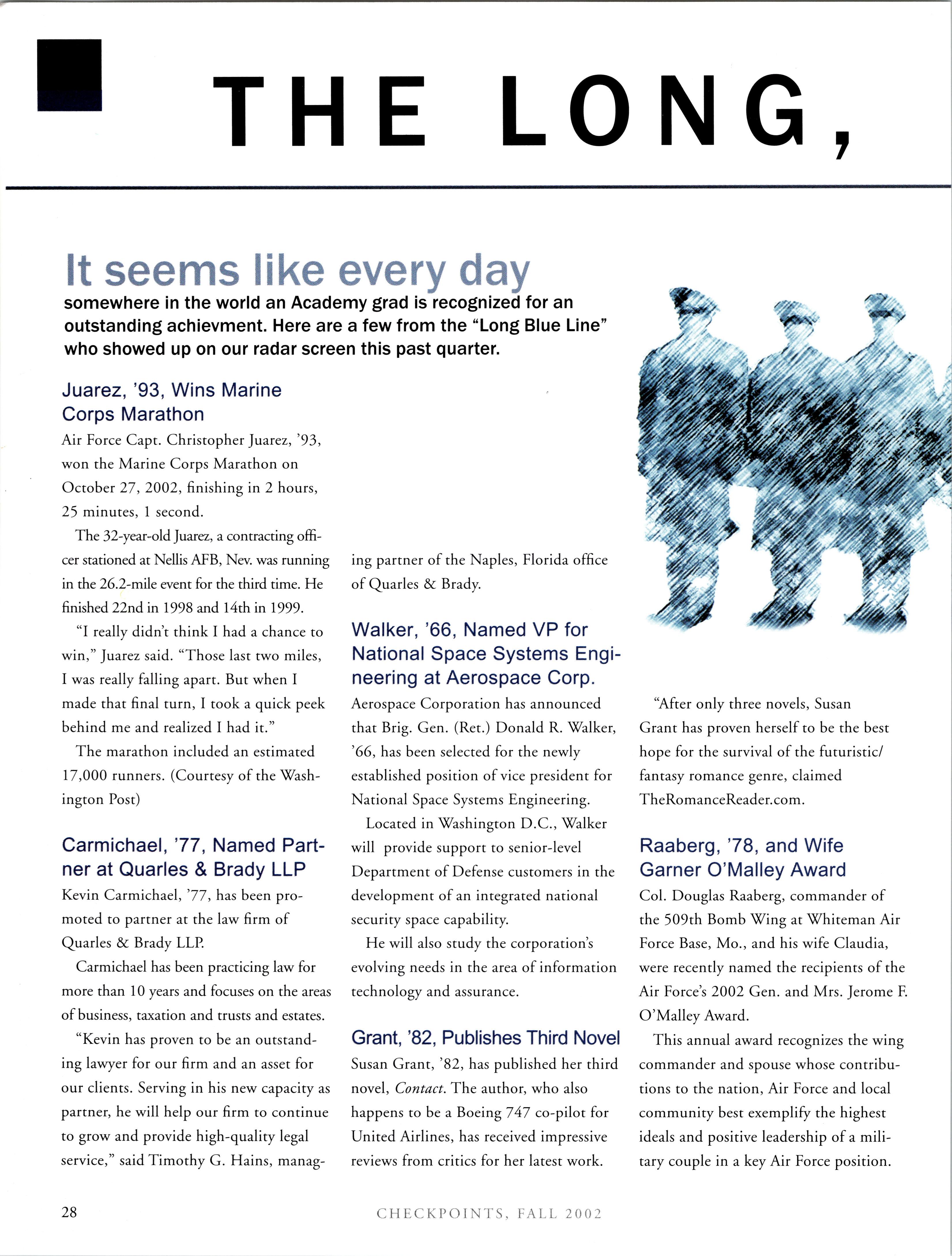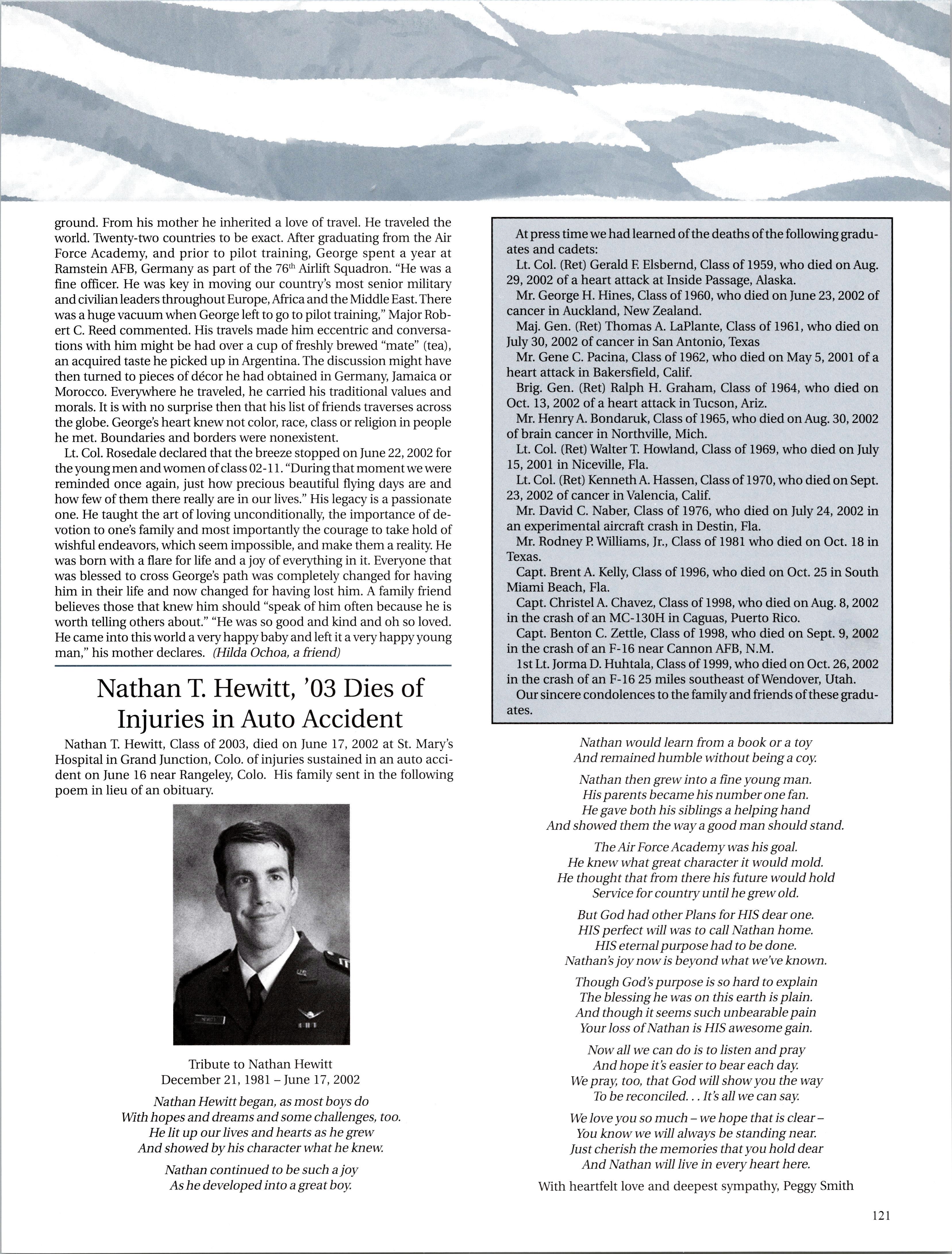 Happy Holidays Class of 1998. I hope this holiday season finds you happy and healthy. Since the last article was written, two of our classmates have died in aircraft accidents. Christel CHAVEZ was the copilot on the MC-130 that crashed in Puerto Rico and Ben ZETTEL was the pilot