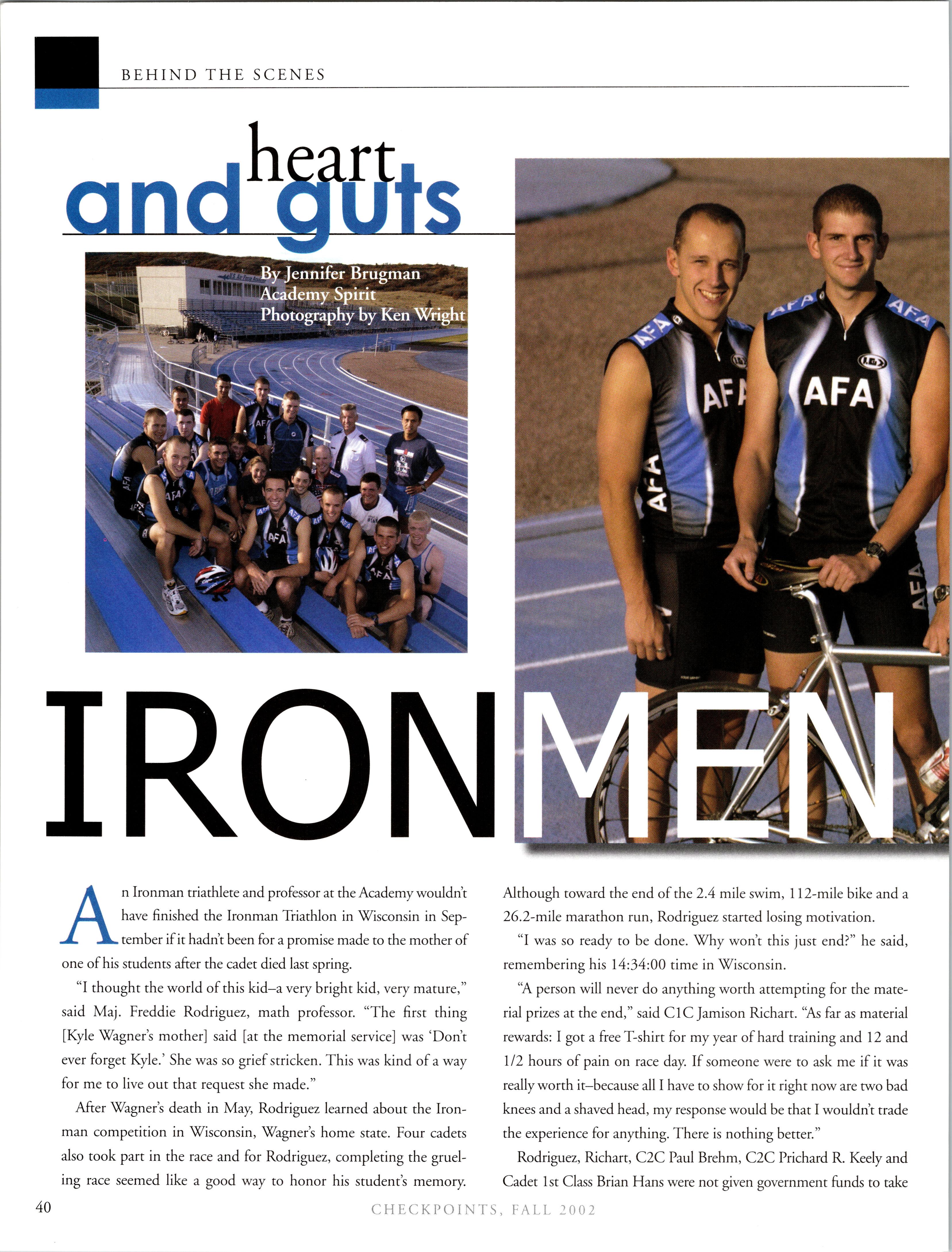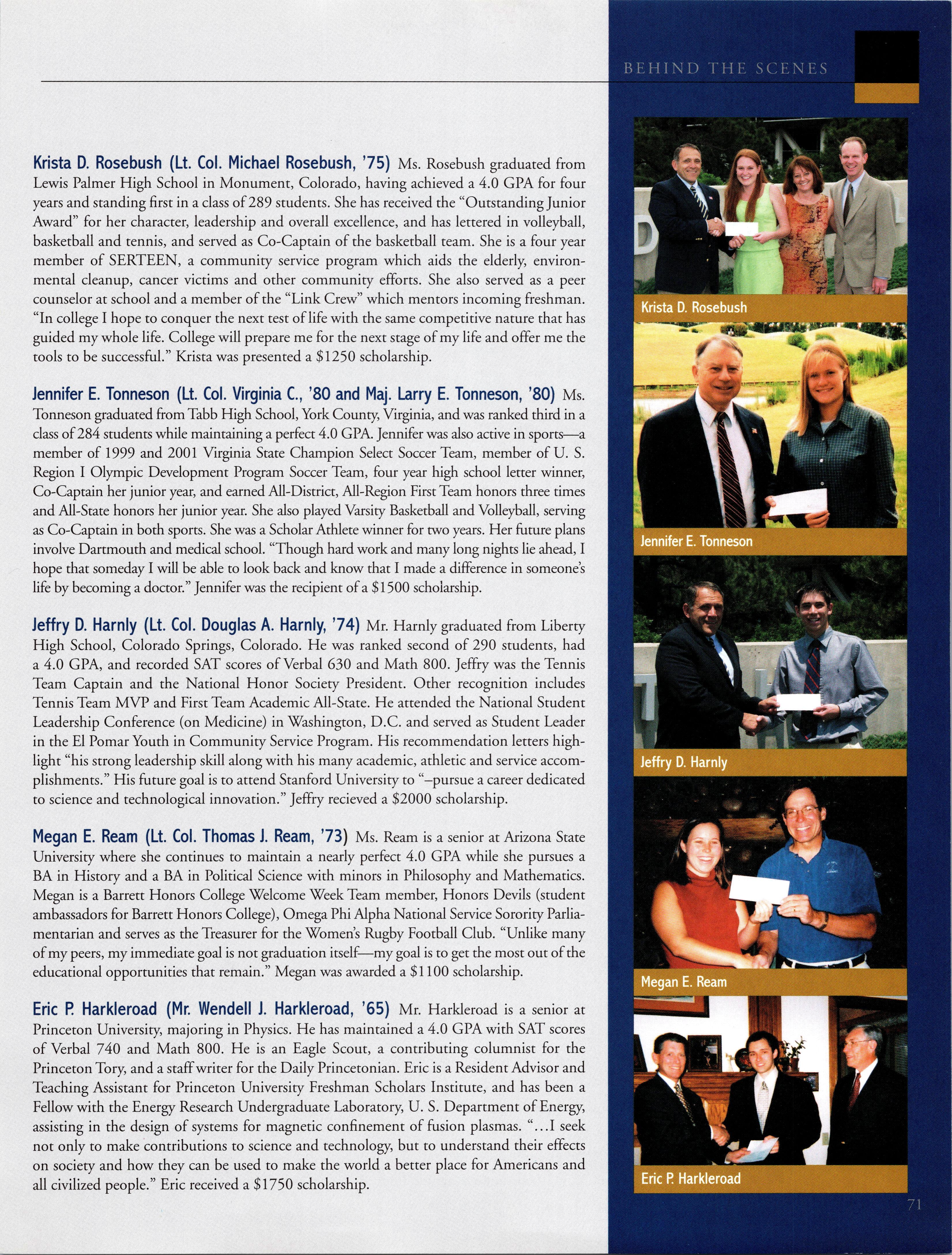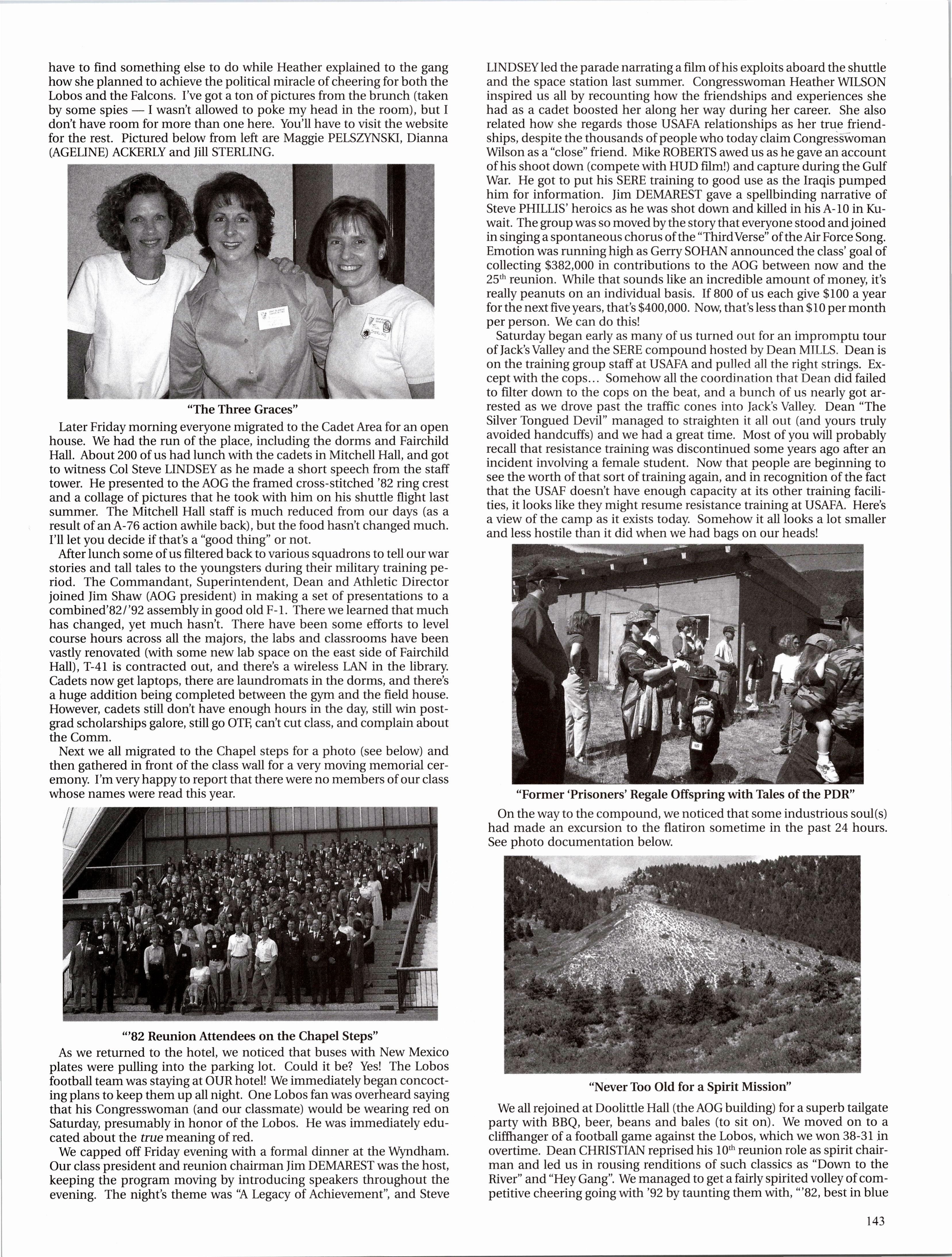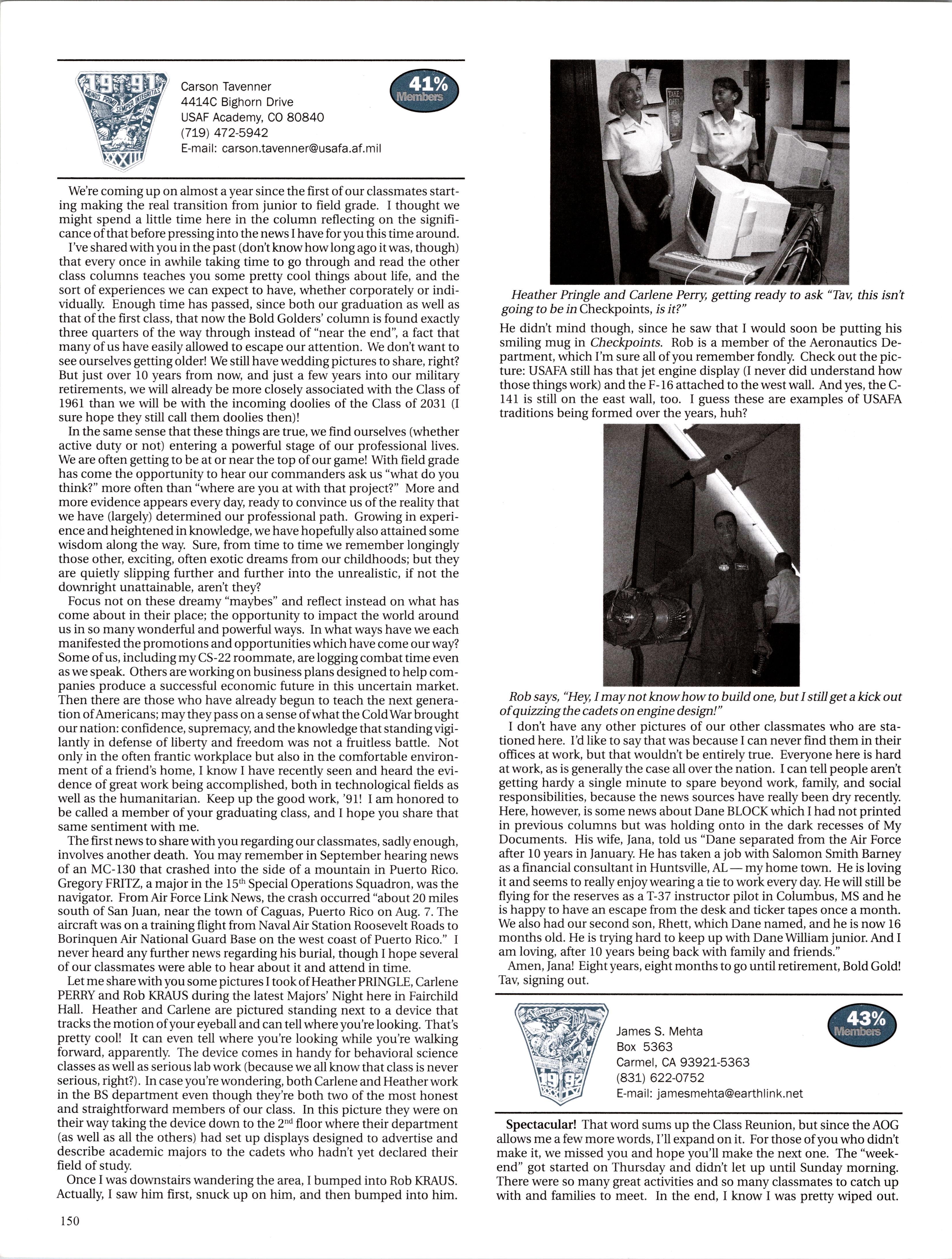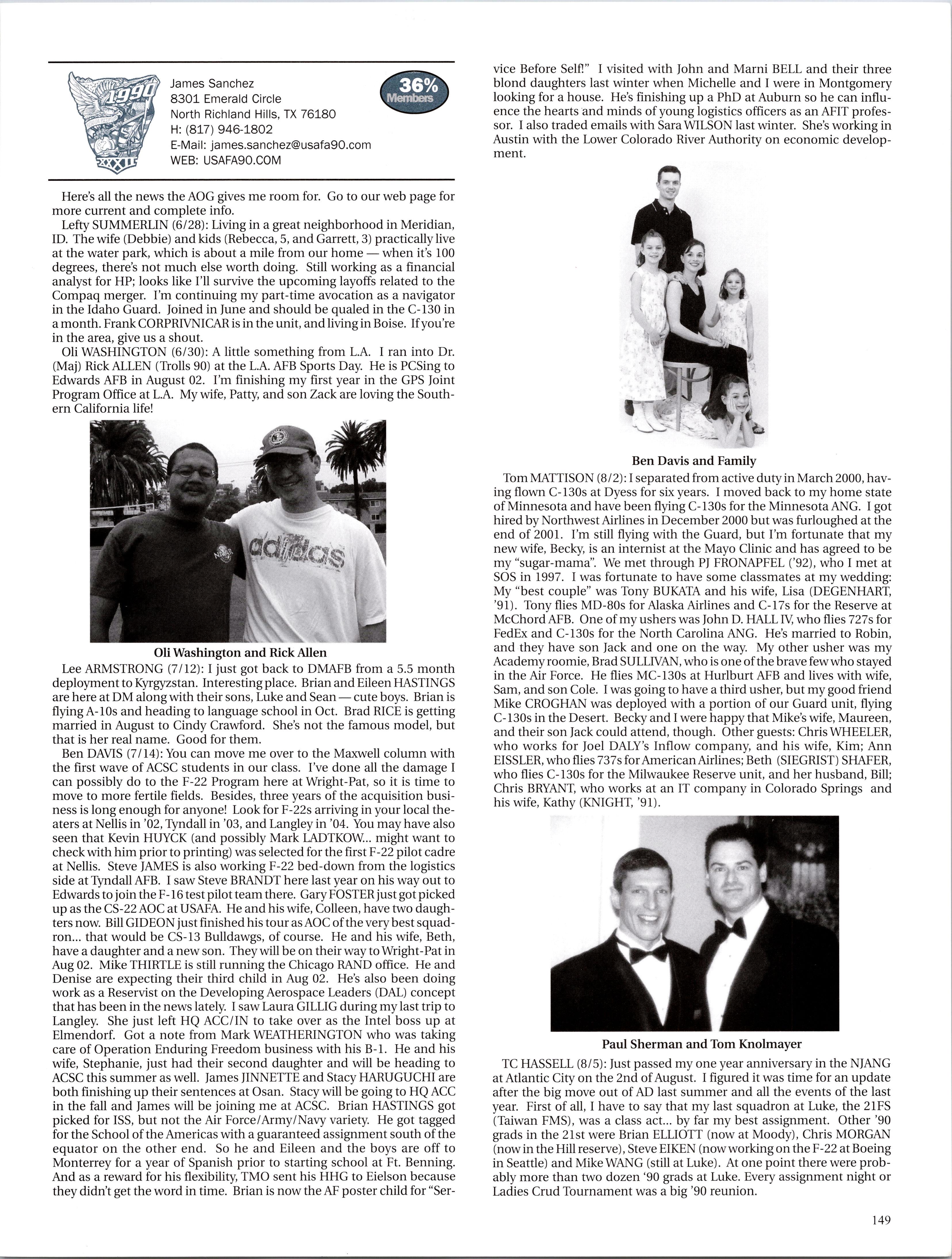 Brian Weiland is currently “someplace hot and dry” flying the A-10. He married a girl he has known since elementary school and they have a one-year-old little boy, Tyler. Dave GRAUER is married to Kelli has a baby girl. They are moving to Seatde, where he’s going to teach ROTC at UW. Kirby ENSSER is still at ENJJPT as a T-38 IR and will get his follow-on jet in March of next year. As for the family, he and Gloria have an almost two-year-old boy and a little girl born this summer. Chuck ROHRIG is a “comm.-guy in an acquisitions world” at Wright-Patterson AFB and recently started working for the commander’s action group. He was also able to go to Costa Rica for a month on a language immersion program.