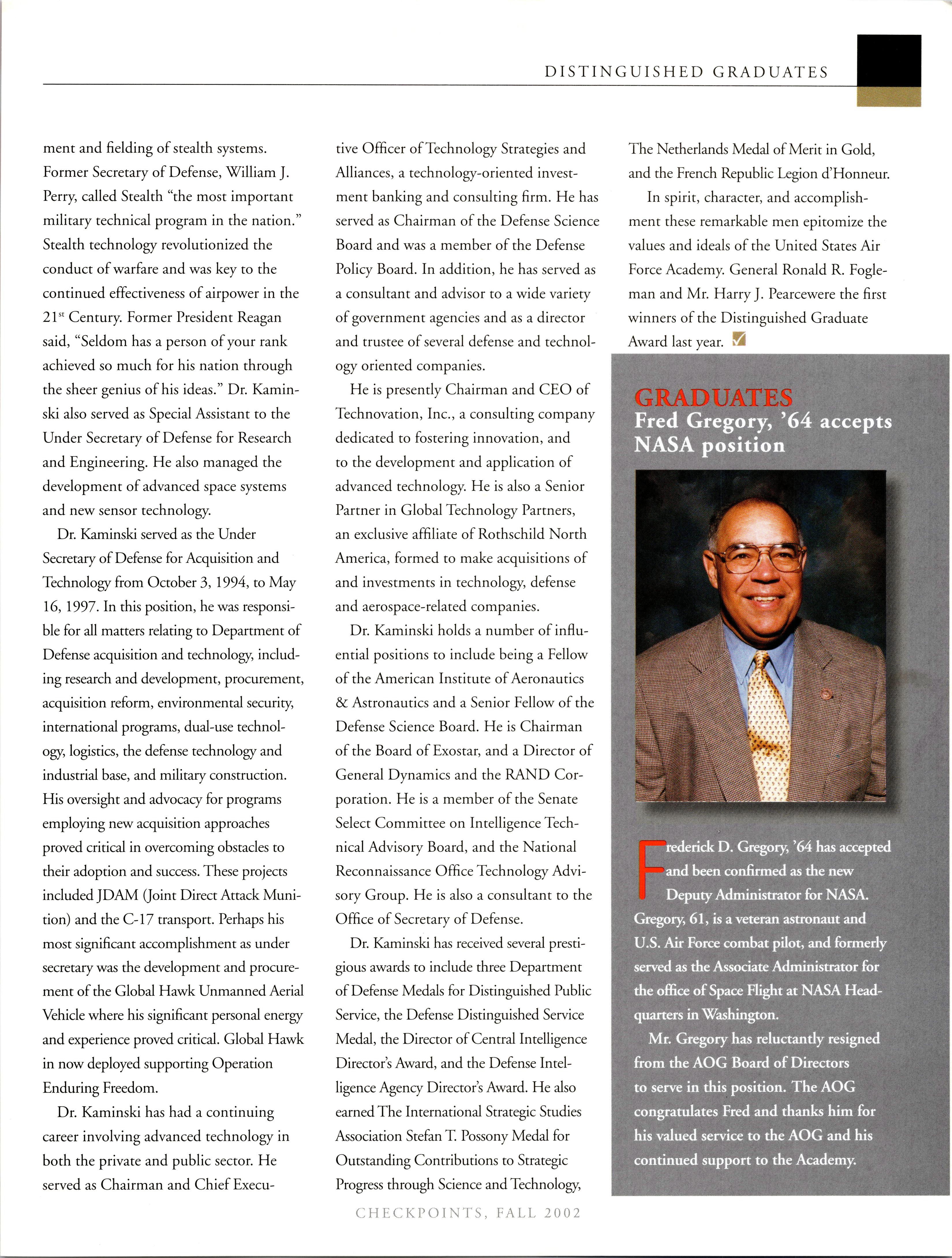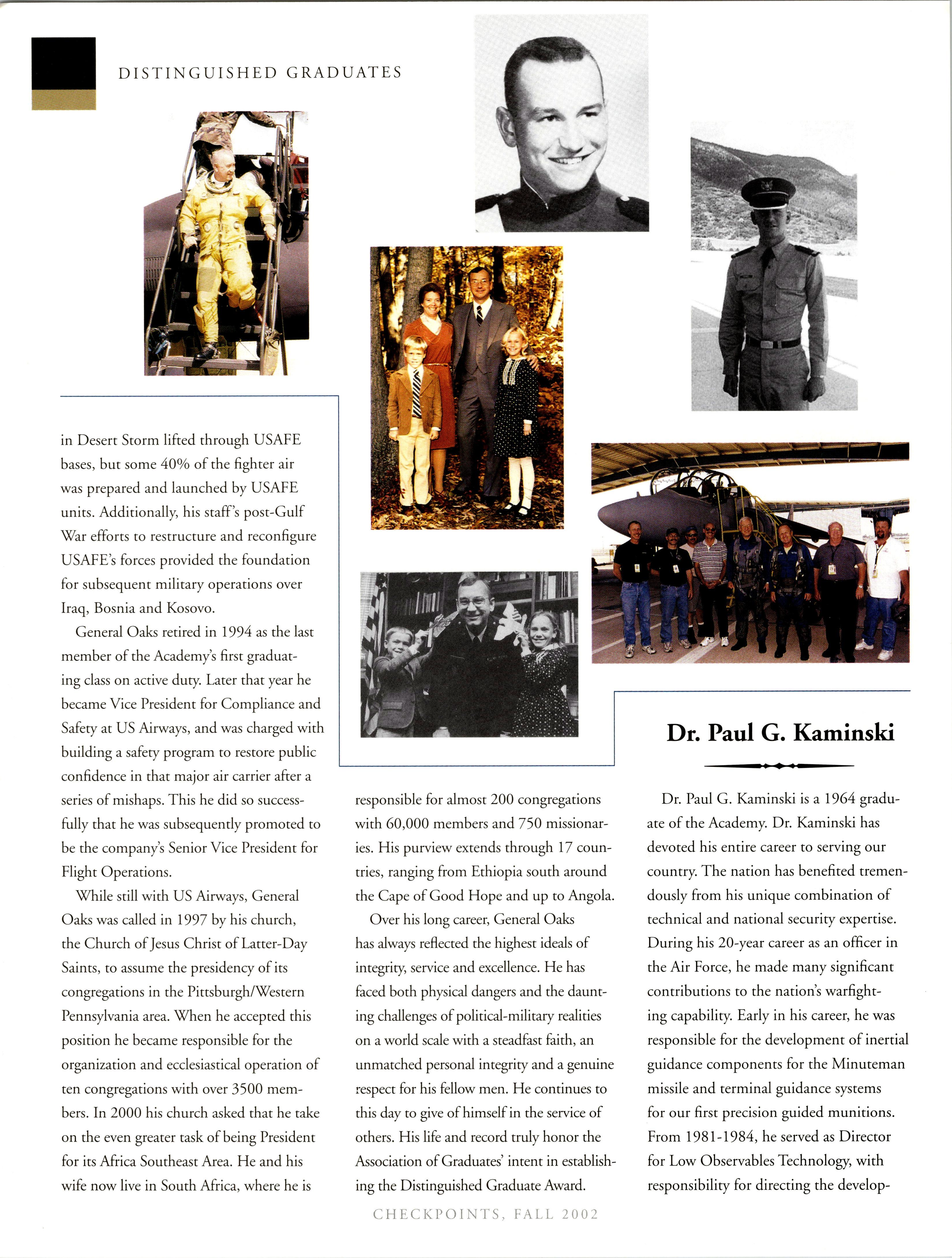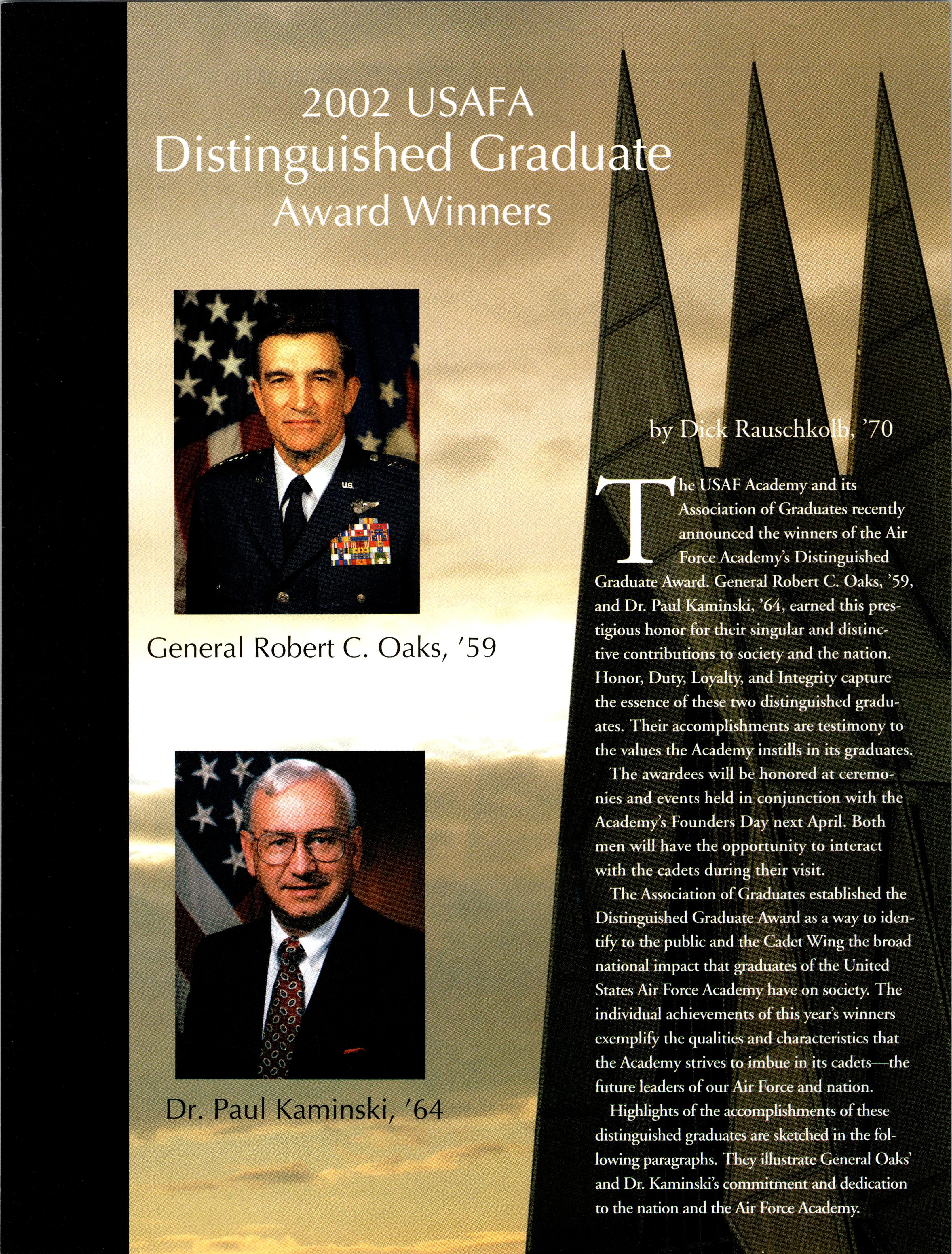 The 2002 Distinguished Graduates are Gen. (Ret.) Robert C. Oaks, ’59, and Dr. Paul Kaminski, ’64.