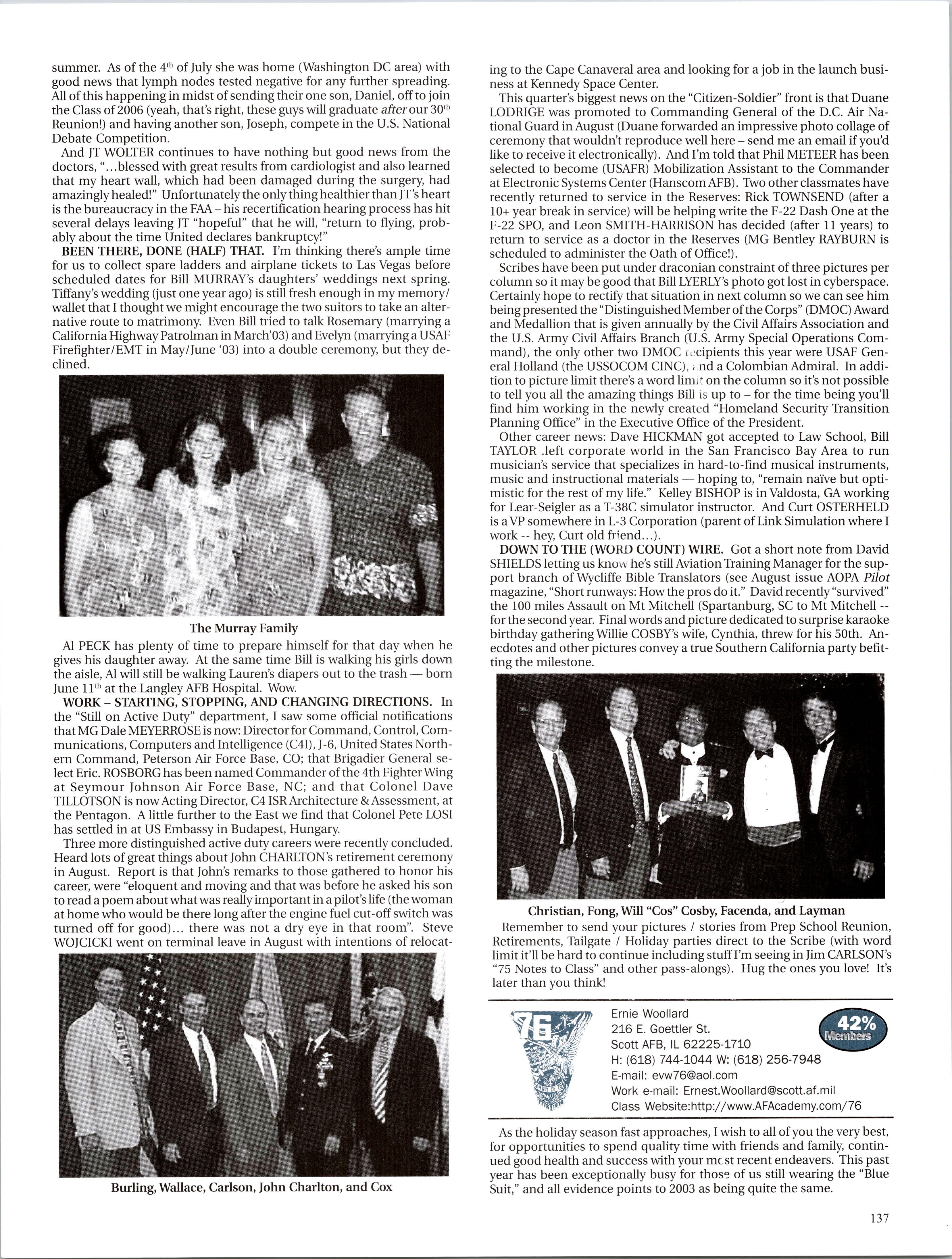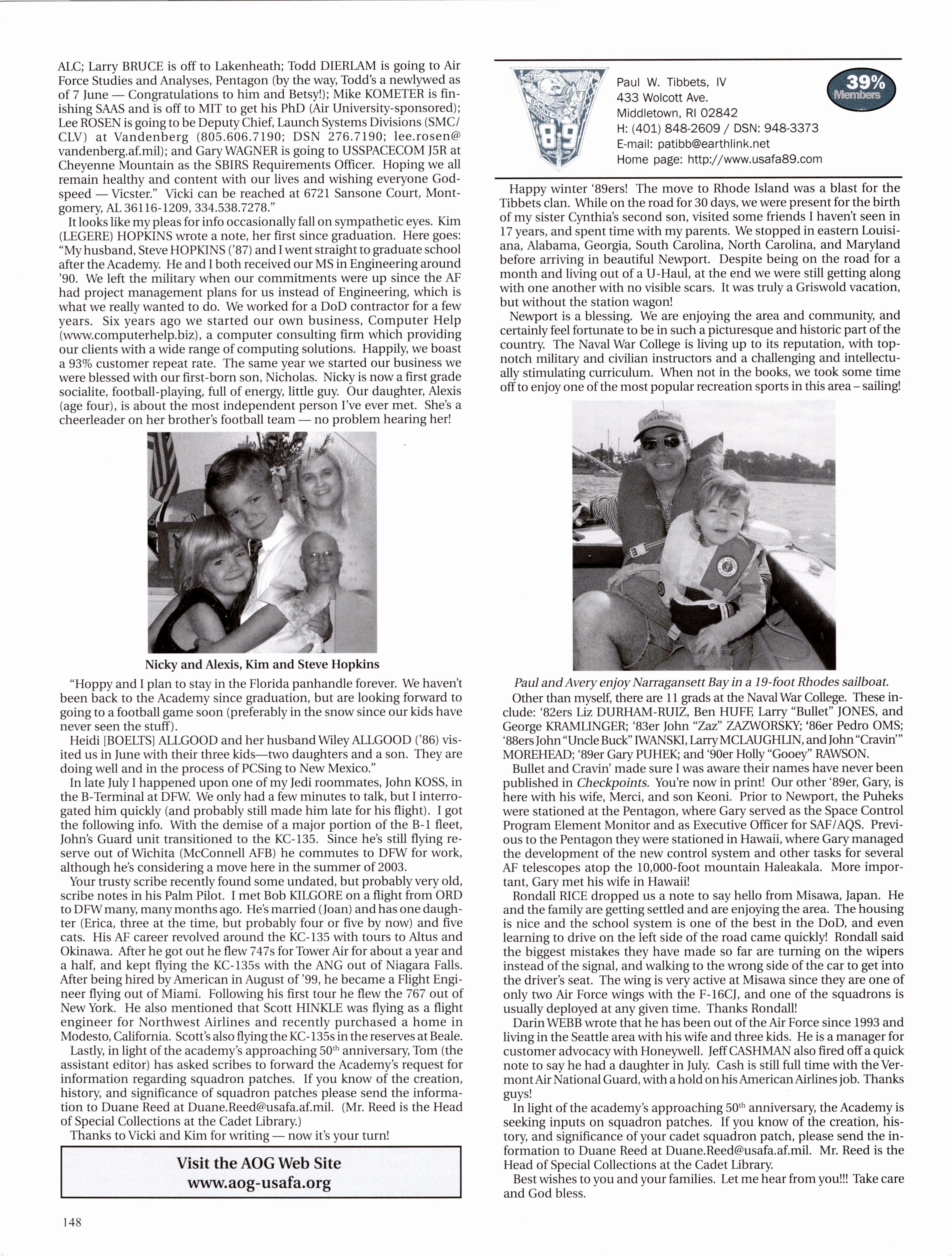 Wes GLISSON was struggling for some reading material in the Saudi john, so he borrowed the AOG mag off a ‘74 grad doing some civilian work out there! He said it’s DAMN HOT over there, and I quote. He said Amy’s (HULTIN) doing well back home - taking good care of the cat and dog. Abe CUDDEBACK is staying on as a ‘37 FAIP and might even fly “those big ass planes” as he put it! Kristi DELCOUR got hitched this summer to Matt CONTARDO (‘00) in Tahoe. Jason HARRIS is in T-ls at Columbus said he ran into Steph SOLTIS on an out-and-back to Louisiana. Jason is getting married in 2004 - congrats!