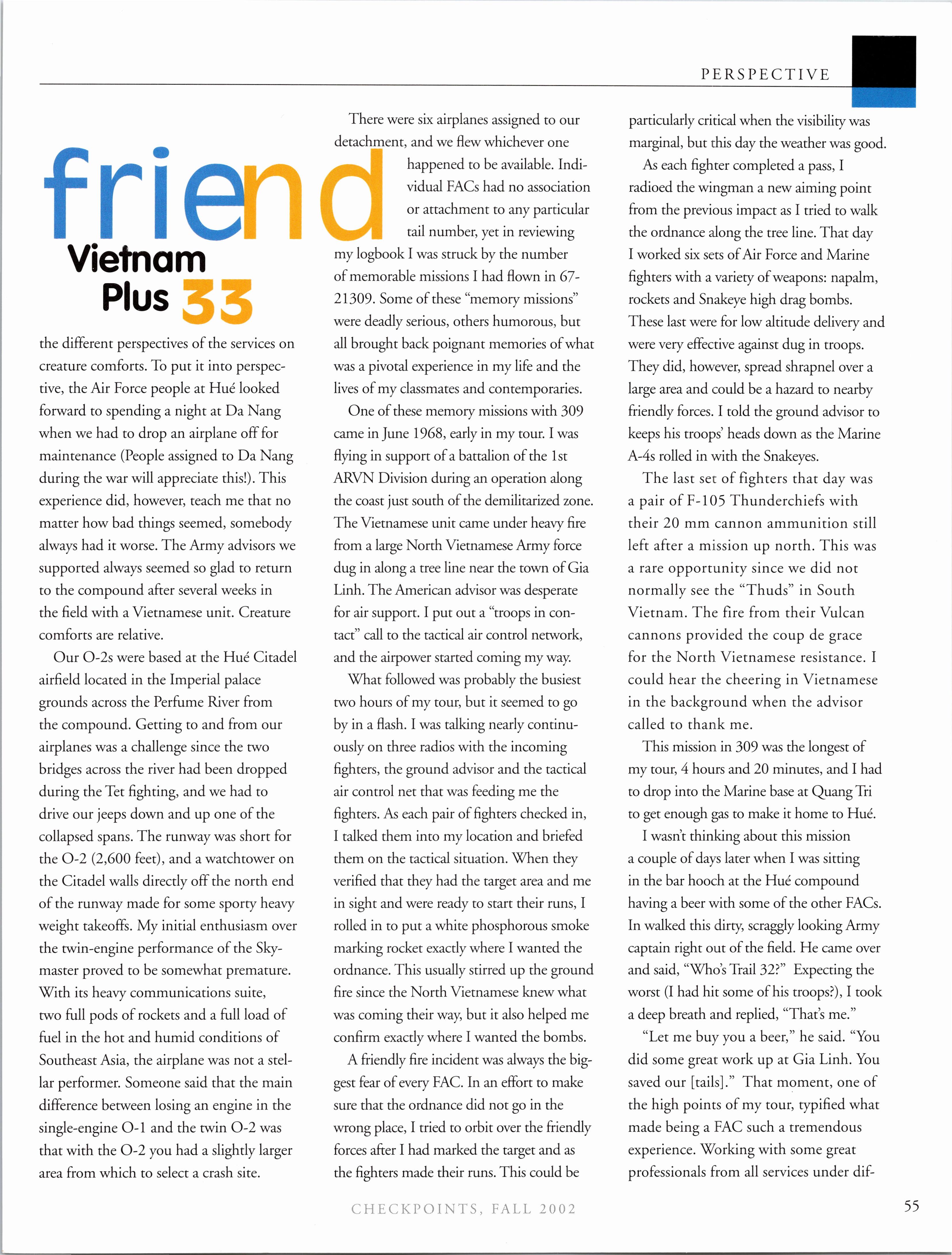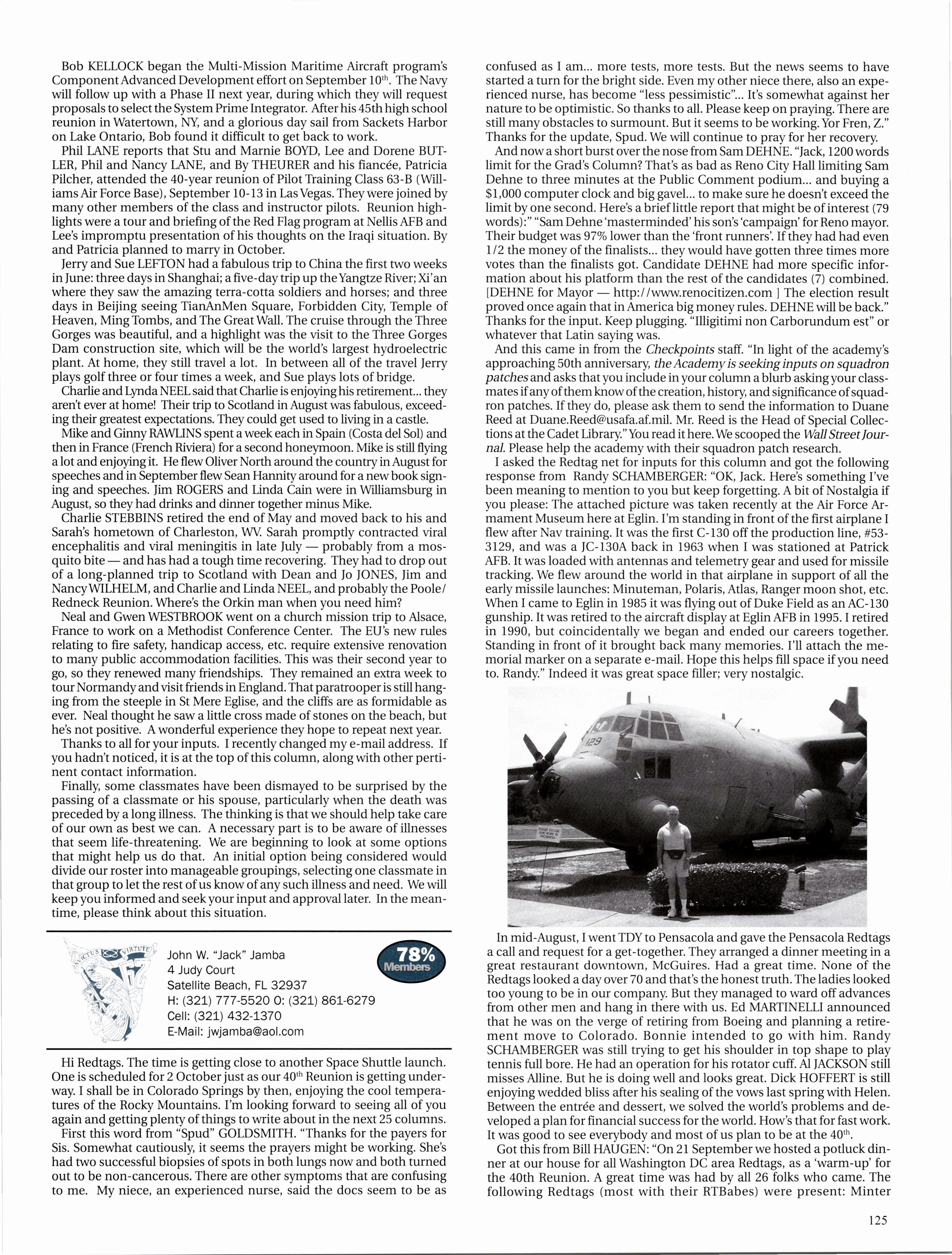 I got a note from Bryan JANDORF at Columbus the daythey graduated... Bryan andJeffBURLEY are going to A- 10s at Davis-Monthan. John FOWLER is moving to Germany to fly C-9s. Eric JOURET will be at Barksdale with a BUFF. Brian URBAN at Seymour-Johnson in the F-15E. Brandon ZUERCHER is off to Tyndall for F- 15Cs. Ryan CARVILLE is going to Dover forC-5s. DanHOAKwillflytheRC-135outofOffuttAFB. RickSWENGROS wins T-37s for three more years as a FAIR Ryan MIKSELL is coming to gorgeous Grand Forks for the KC-135. Ryan, the mosquito is the state bird - don’t bother bringing OFF, it’s like a marinade for them. We are actually wishing for snow so they will all die! Chris SEAMAN also took a break from Survival to say he graduated a few weeks before Jandorf’s clan... Chris got C-5s out ofTravis and Mike “Jelly” KAWAN is going to F-16Cs down at Luke. I heard from Jeb BLAIR at Vance - this was just a quality clip ifyou don’t mind me including it... “I did great in the program, had my pick of any of the four tracks, tho I was being encouraged to do T-38s. I chose T-44s cuz I wanna go fly AC-130s or MC-130s and do Special Operations stuff.” Sweet - I’m loving the hell out ofGrand Forks, by the way. Ryan MENATH and Peter GROSSENBACH are heading to T-ls, and Jad DITLOW is almost done down there. In the drop before that, Dustin BRISSON got a C17 and Josh CADICE is going to Mildenhall with a KC-135.