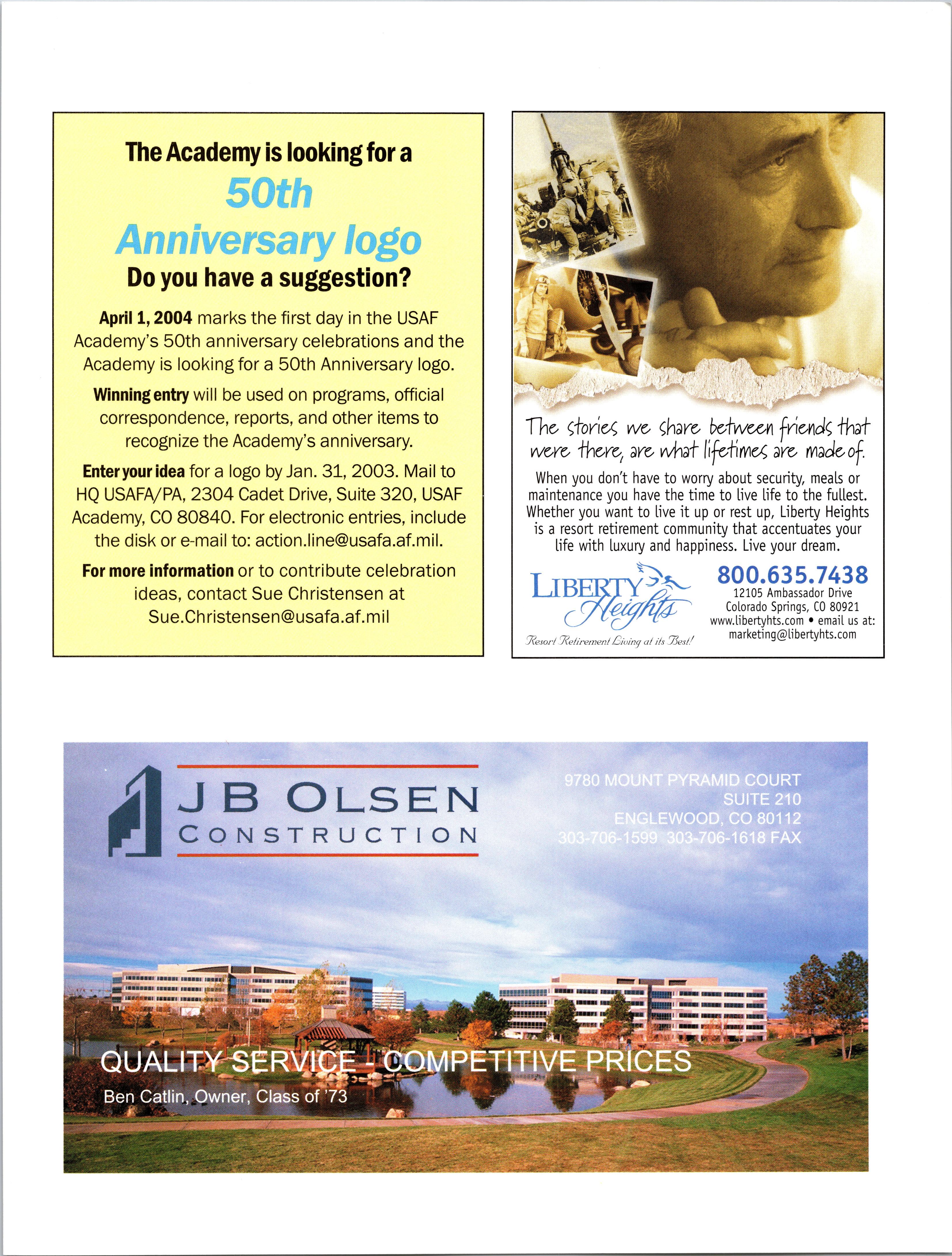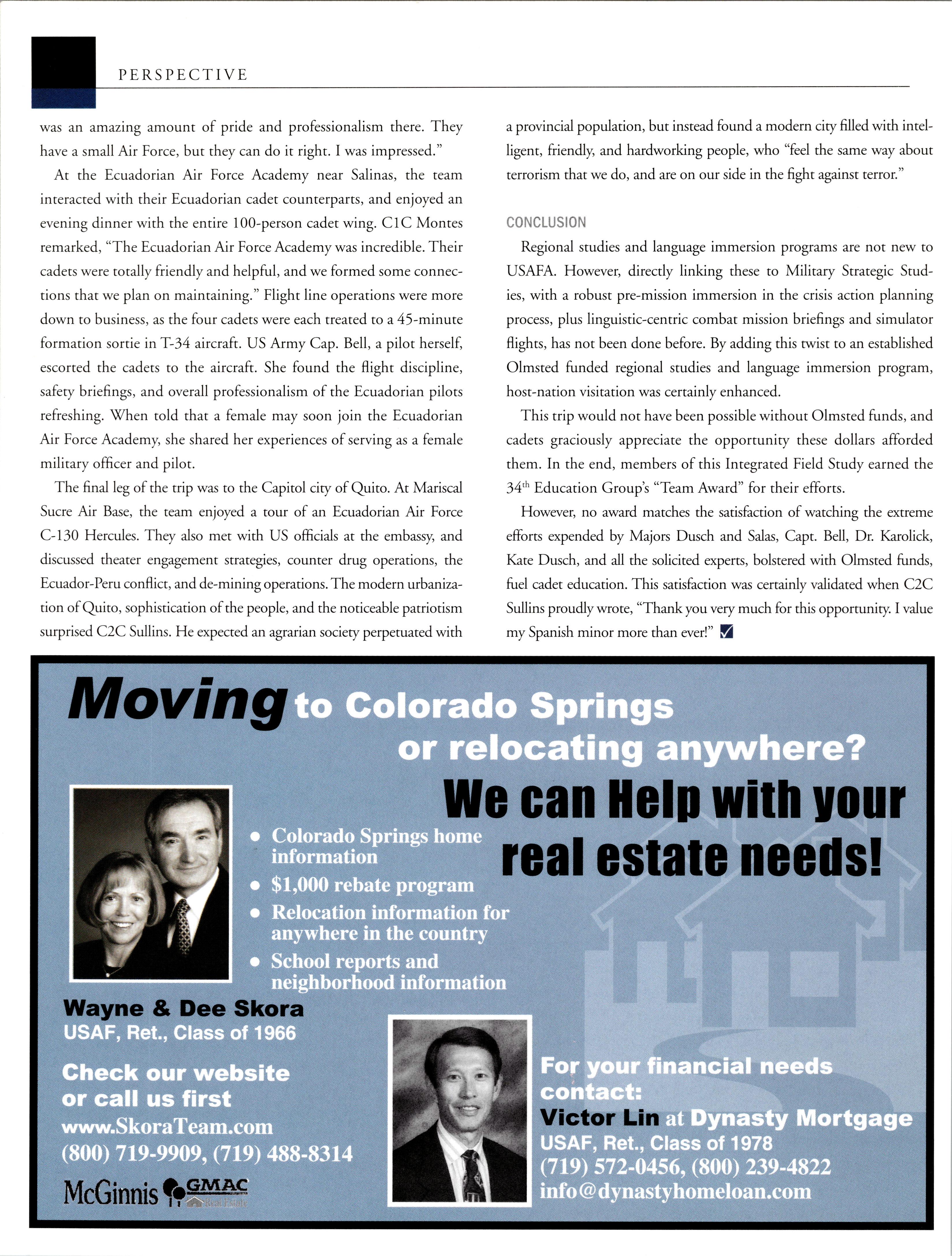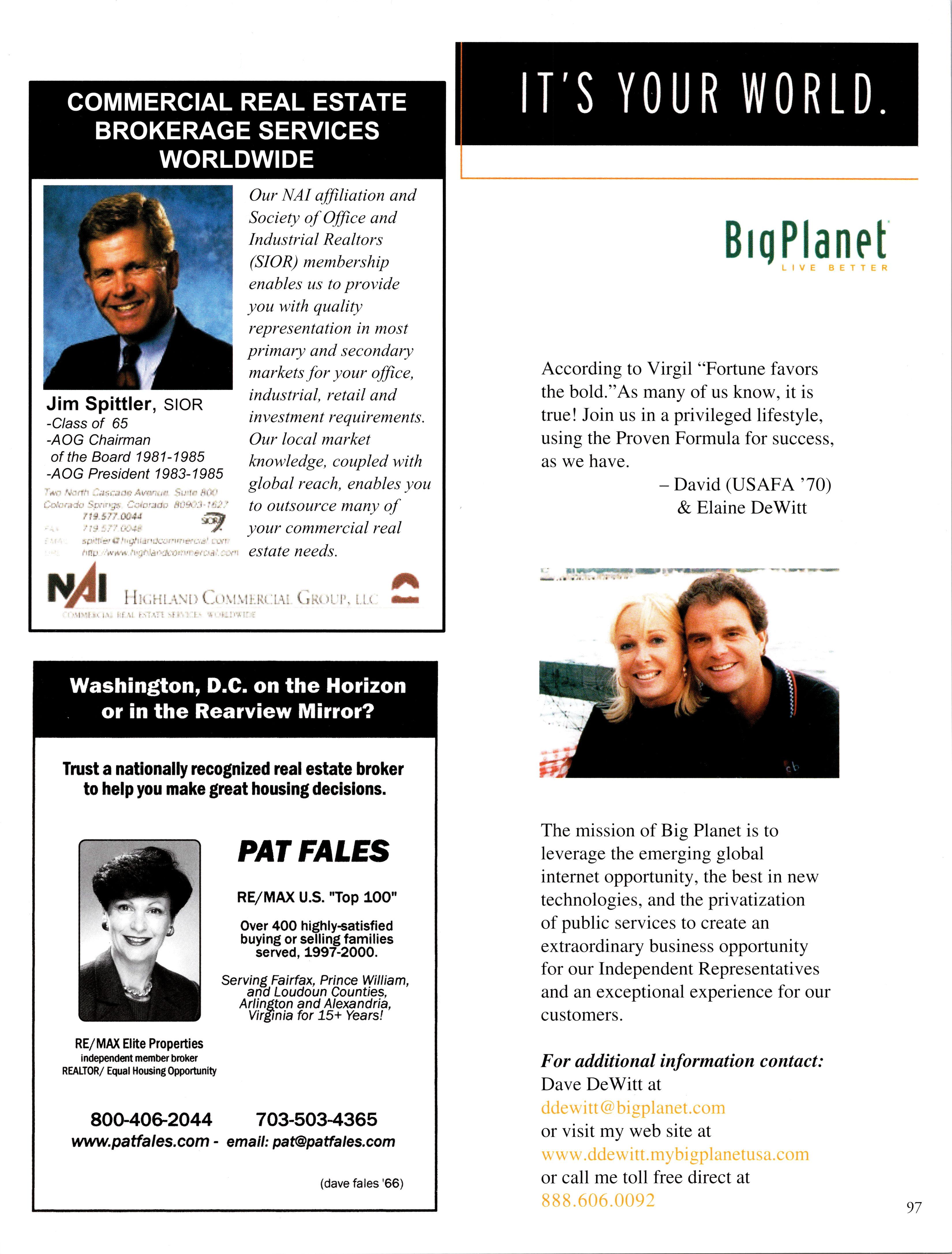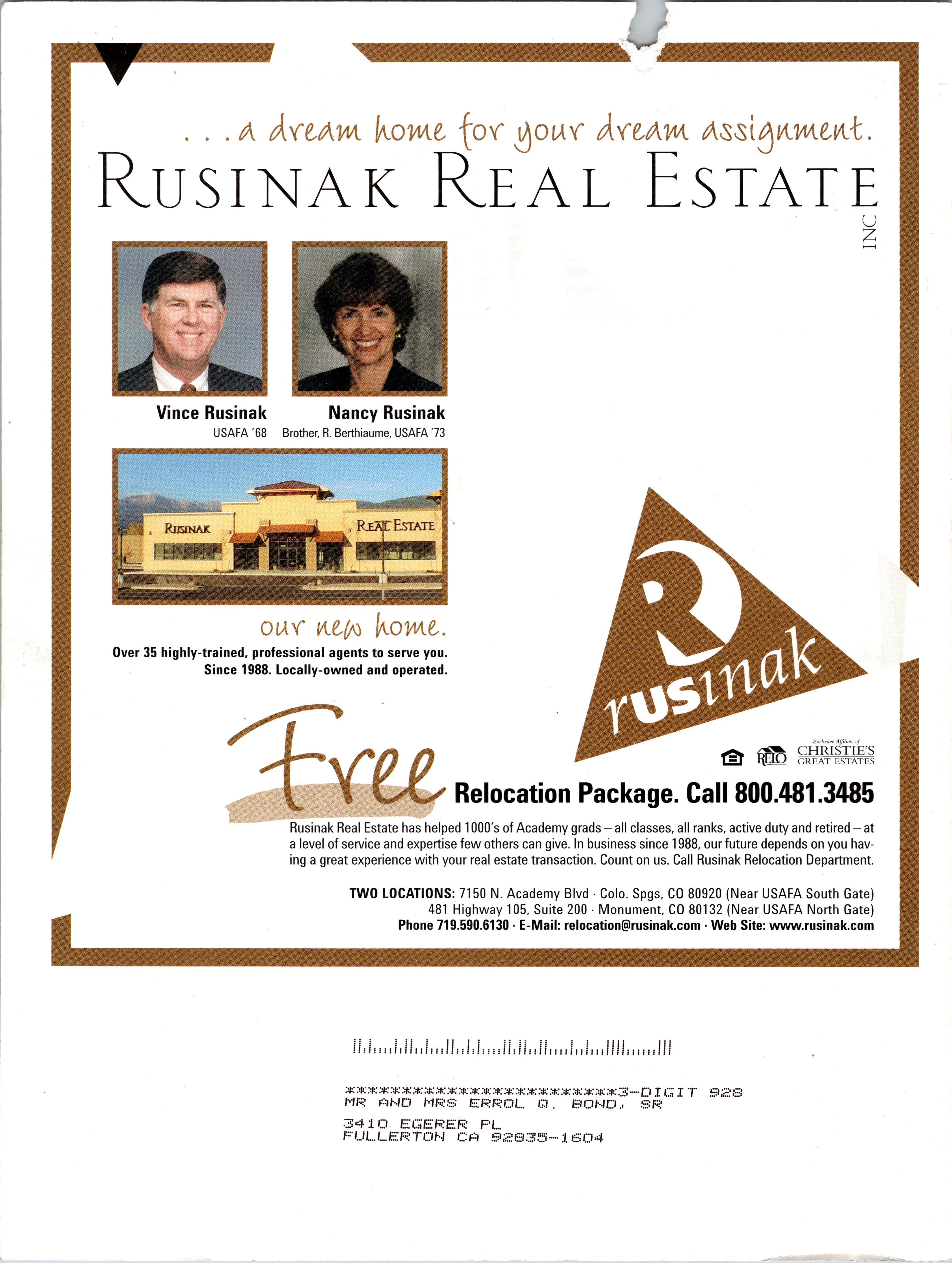a Aycaw. Rome for ^our Ayiayk AsstAnwe.H.'fc. Rusinak Real Estate Vince Rusinak USAFA '68 Nancy Rusinak Brother, R. Berthiaume, USAFA 73 \ Relocation Package. Call 800.481.3485 Rusinak Real Estate has helped 1000's of Academy grads - all classes, all ranks, active duty and retired - at a level of service and expertise few others can give. In business since 1988, our future depends on you having a great experience with your real estate transaction. Count on us. Call Rusinak Relocation Department. TWO LOCATIONS: 7150 N. Academy Blvd Colo. Spgs, CO 80920 (Near USAFA South Gate) 481 Highway 105, Suite 200 Monument, CO 80132 (Near USAFA North Gate) Phone 719.590.6130 E-Mail: relocation@rusinak.com Web Site: www.rusinak.com 1111 i Hi 1111111 i 111 i!!!i!!ii!il ■*: .:c: ;.t: 3—p j g i j qpq MR FiWD MRS ERROL Q. BOND.. SR 3410 EGERER PL FULLERTON OR 92S35 1604