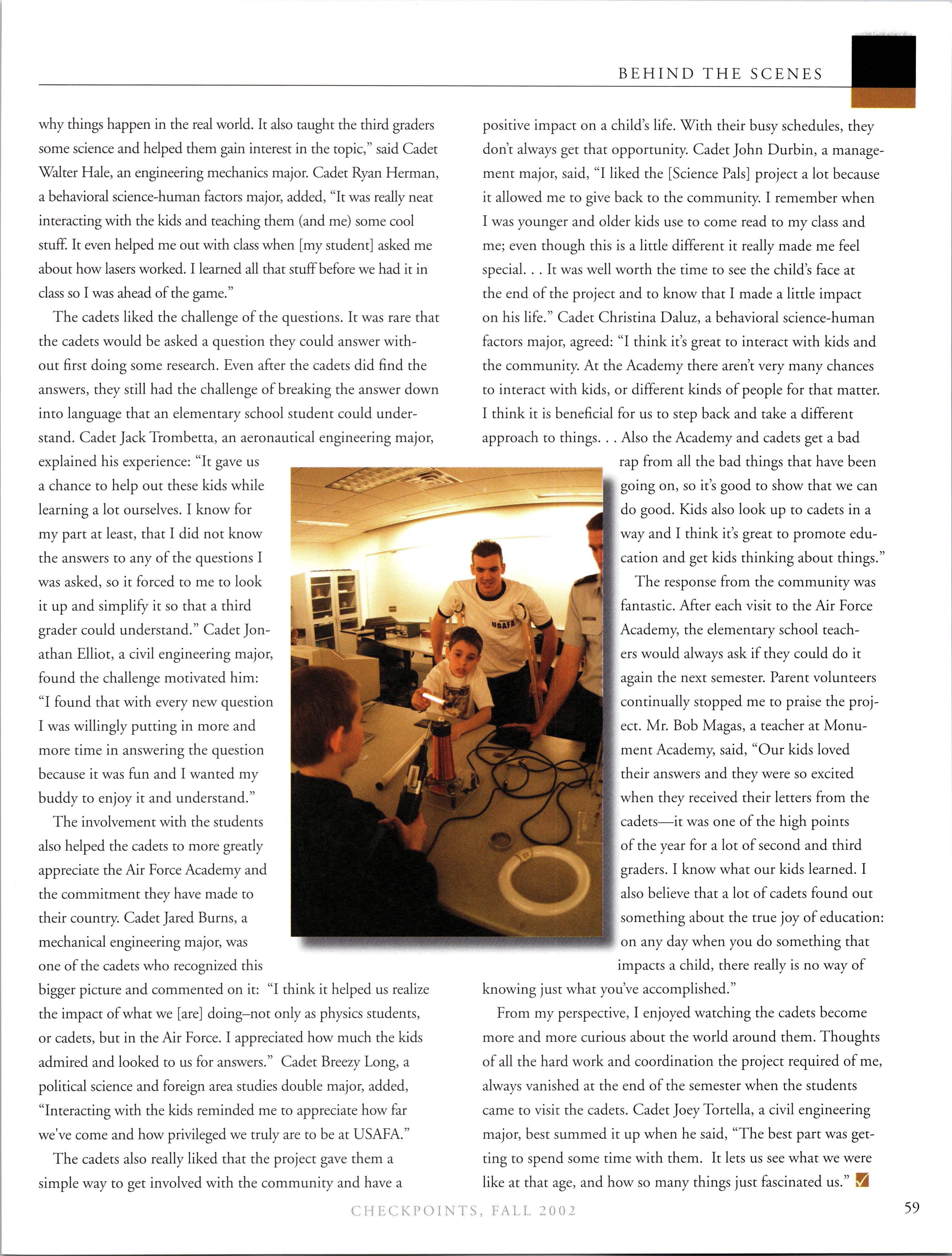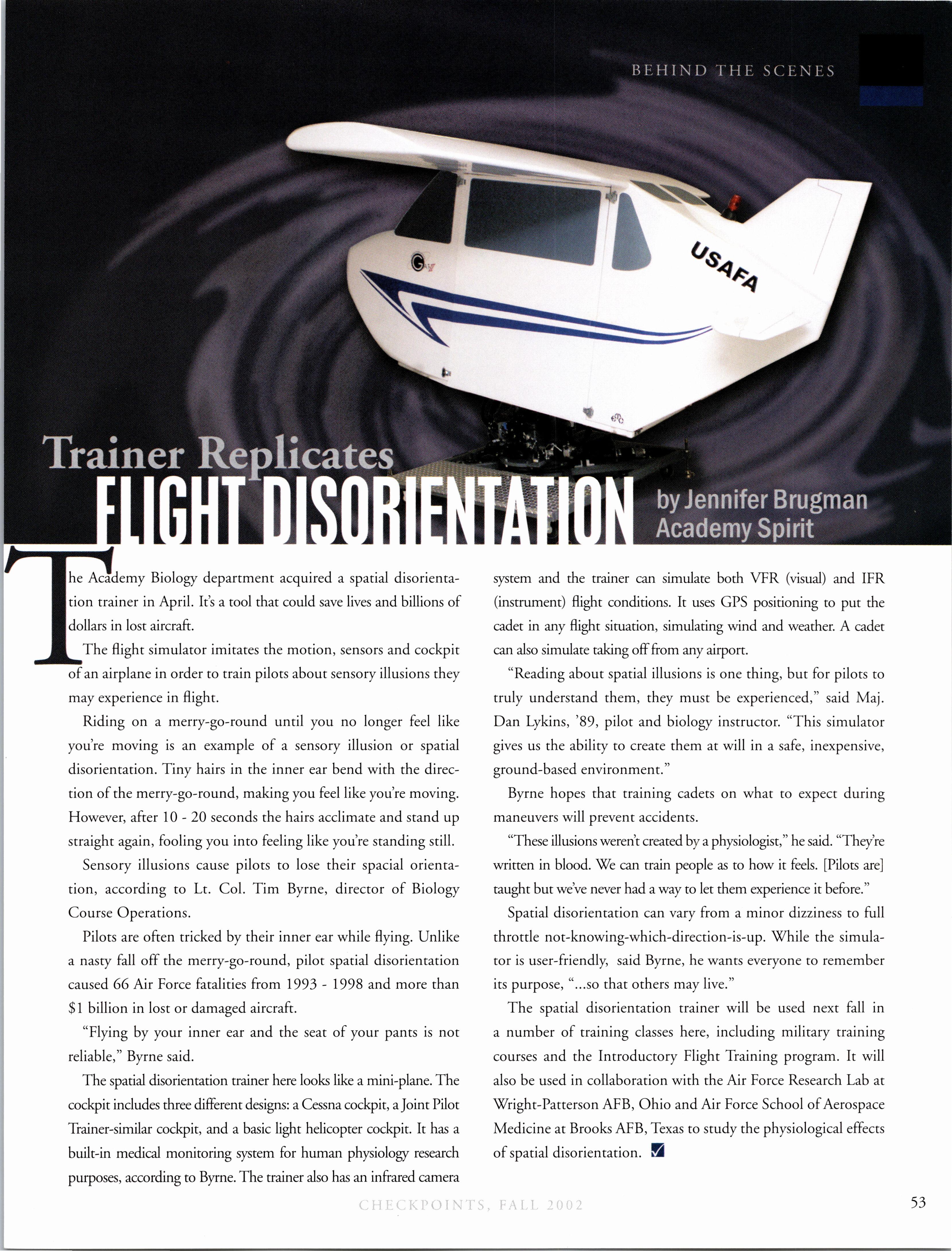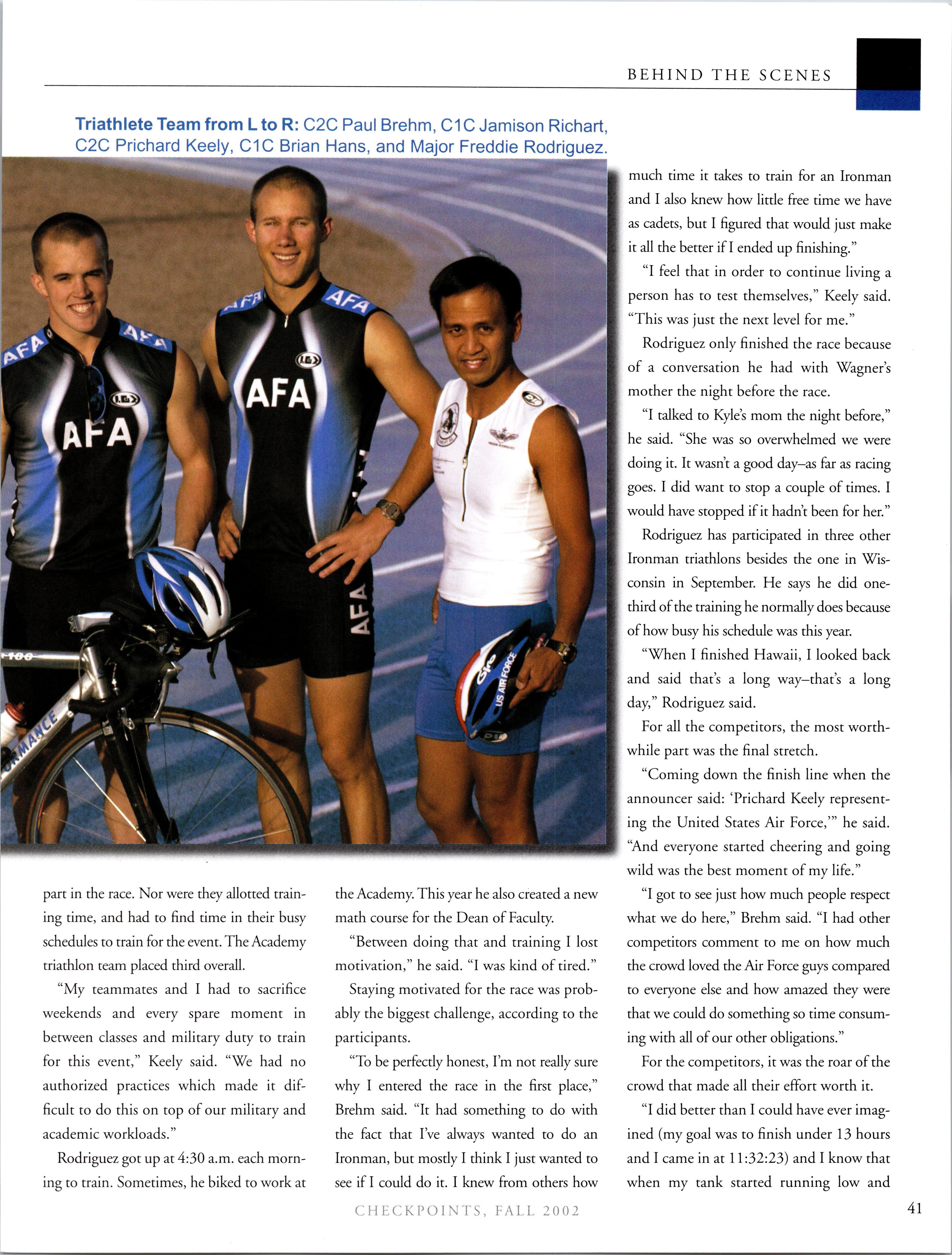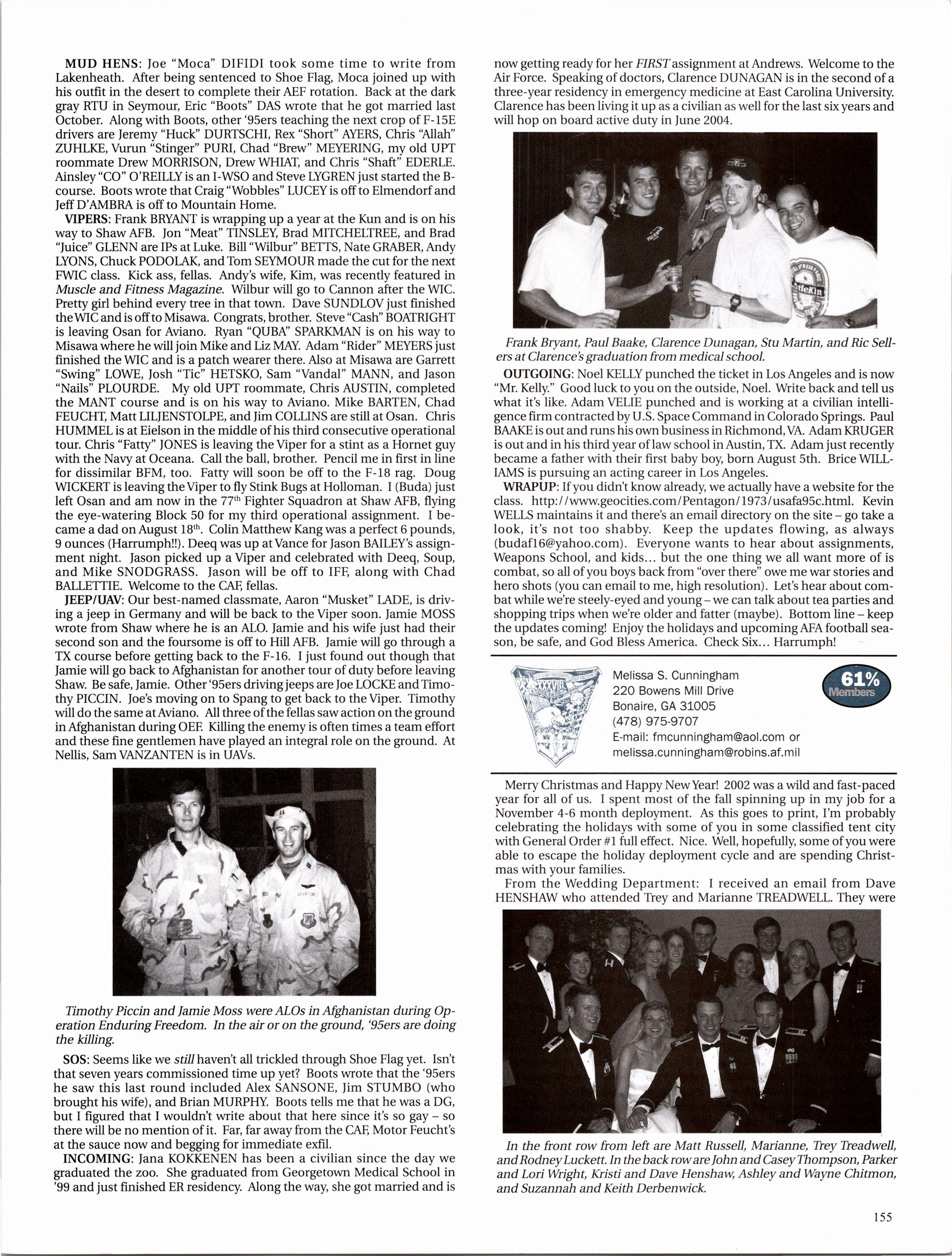 As for me, I am working in an F-15 squadron at Eglin and trying to dodge hurricanes to finish IFT. I love living in Florida; the warm sun, white sand, and clear water are definitelythings I can get used to; the hurricanes, tornados, and floods.. .not so much. Siobhan COUTURIER is my roommate, and she is working in one ofthe flight test squadrons at Eglin and also doing IFT. Tony STRAW, Scott BEUSCH, Jim GEORGE, and Adrienne DEWITT are at Hurlburt Field; the boys are training the special ops guys until they go to UPT, and Adrienne is doing Comm. Ryan VANMAARTH is doing Comm at Eglin and living with Benny STAATS. Benny and Shane ALFAR are working up at Duke Field while they await pilottraining. Nate KOSS, Mike GARROTT, and Chris MUNGER are renting a house together and working in the F-15 squadrons over at Eglin until theygo to pilottraining inApril. There are even more ‘02 grads down here, but since I can’t remember exactly where everyone else is working/living, I’ll have to give you an update on them in the