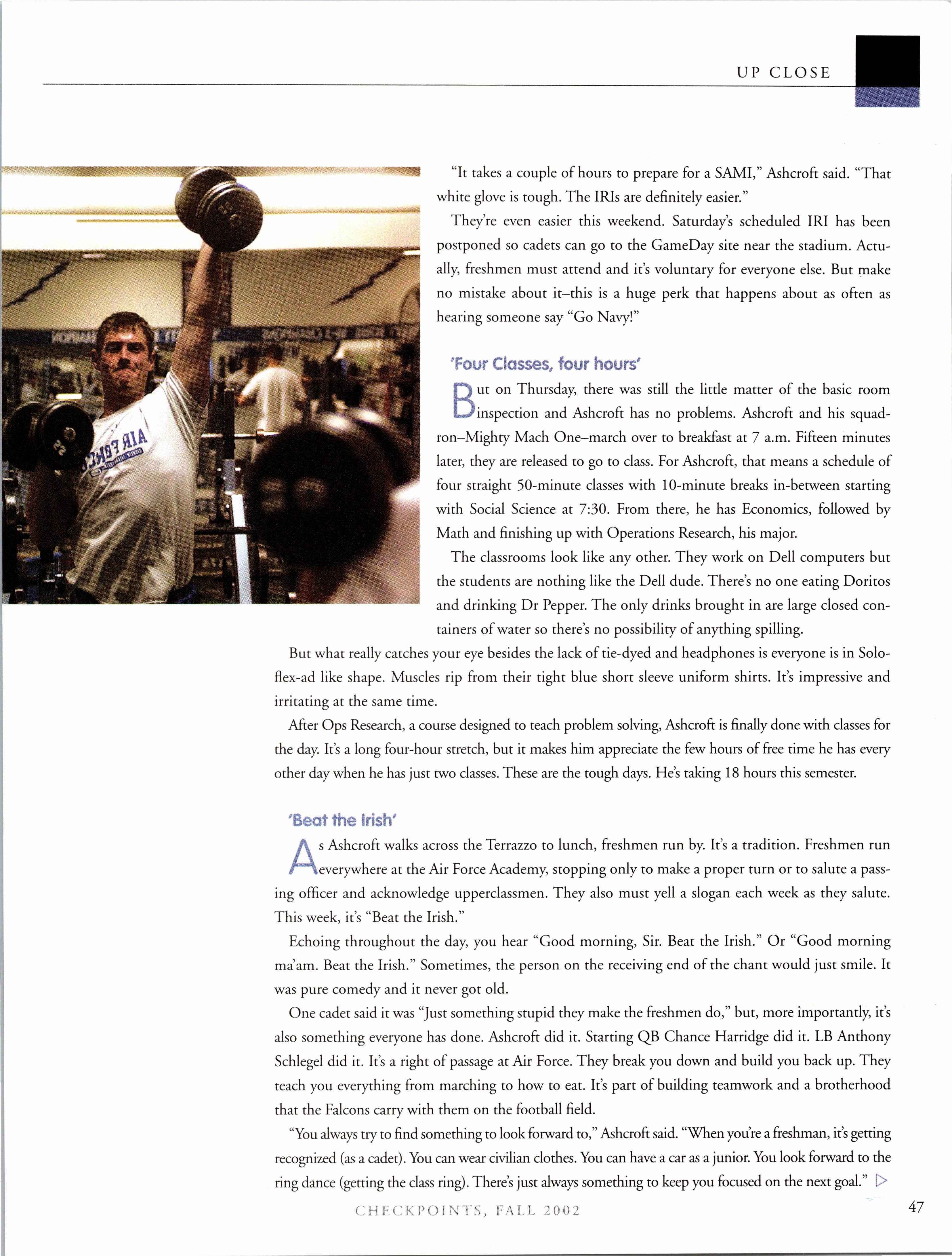 I honestly can’t remember ever seeing Ben in a bad mood. I’m not saying that it didn’t happen. I mean give me a break...he did endure four years at the Academy. But those occasions must have been rare, because every picture I own, every story I tell, every memory I have about Ben includes that ridiculous grin of his. His smile was truly infectious and it always made you wonder what prank he had just played. I found it impossible to walk down the hall of our squadron without stopping by Ben’s room to see what he was doing, to trade jokes, to discuss the latest cadet scandal, to hear what amazing events transpired during his weekend and to find out what he had planned for the next one. Our lunch table was an endless source of entertainment for the group of regulars lucky enough to participate in what can only be described as intellectual mayhem. Needless to say, Ben was often the catalyst of said mayhem. I can’t even begin to describe the scope of that forum, but on any given day his input would be part of a theory or belief, debate or diatribe, poem or argument. Lunch with Ben contributed as much to my education as four years worth of accredited courses...maybe more.