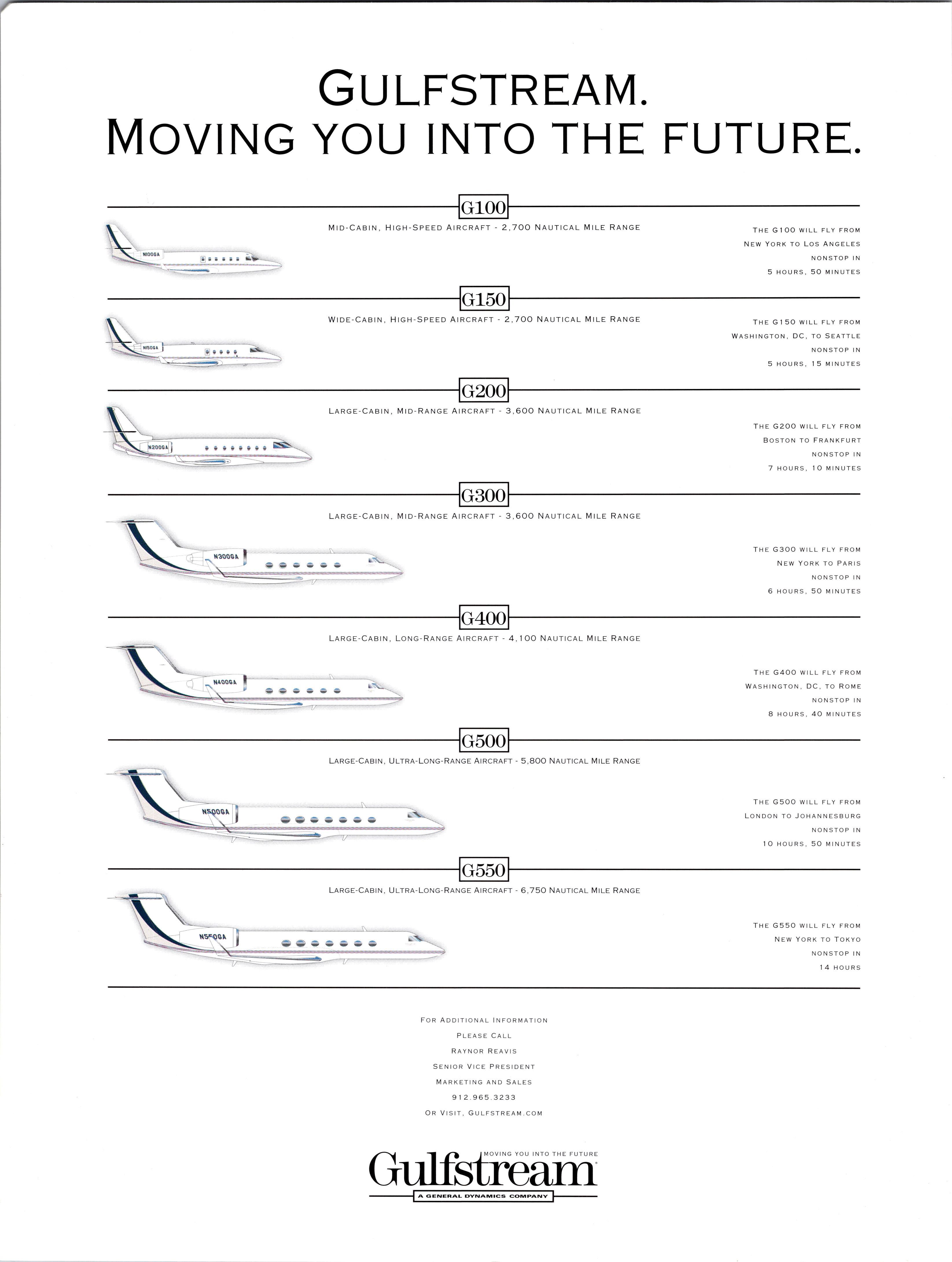 Gulfstream. MOVING YOU INTO THE FUTURE. G100 Mid-Cabin, High-Speed aircraft - 2,700 Nautical mile range The G 1 00 WILL FLY FROM NEW YORK TO LOS ANGELES NONSTOP IN 5 HOURS, 50 MINUTES G150 wide-Cabin, high-speed Aircraft - 2,700 nautical mile range The G 1 50 WILL FLY FROM WASHINGTON, DC, TO SEATTLE NONSTOP IN 5 HOURS, 15 Ml NUTES G200 6 HOURS, 50 MINUTES G400 Large-Cabin, Long-Range Aircraft - 4,100 Nautical Mile Range THE G400 WILL FLY FROM WASHINGTON, DC, TO ROME NONSTOP IN 8 HOURS, 40 MINUTES G50Q Large-Cabin, Ultra-Long-Range aircraft - 5,800 nautical mile Range G550 THE G 500 WILL FLY FROM London to Johannesburg NONSTOP IN 10 HOURS, 50 MINUTES THE G 5 50 WILL FLY FROM NEW YORK TO TOKYO NONSTOP IN 14 HOURS FOR ADDITIONAL INFORMATION Please Call RAYNOR REAVIS Senior Vice President MARKETING AND SALES 9 2.965.3233 Or Visit, Gulfstream.com j moving you into the future Gulfstream