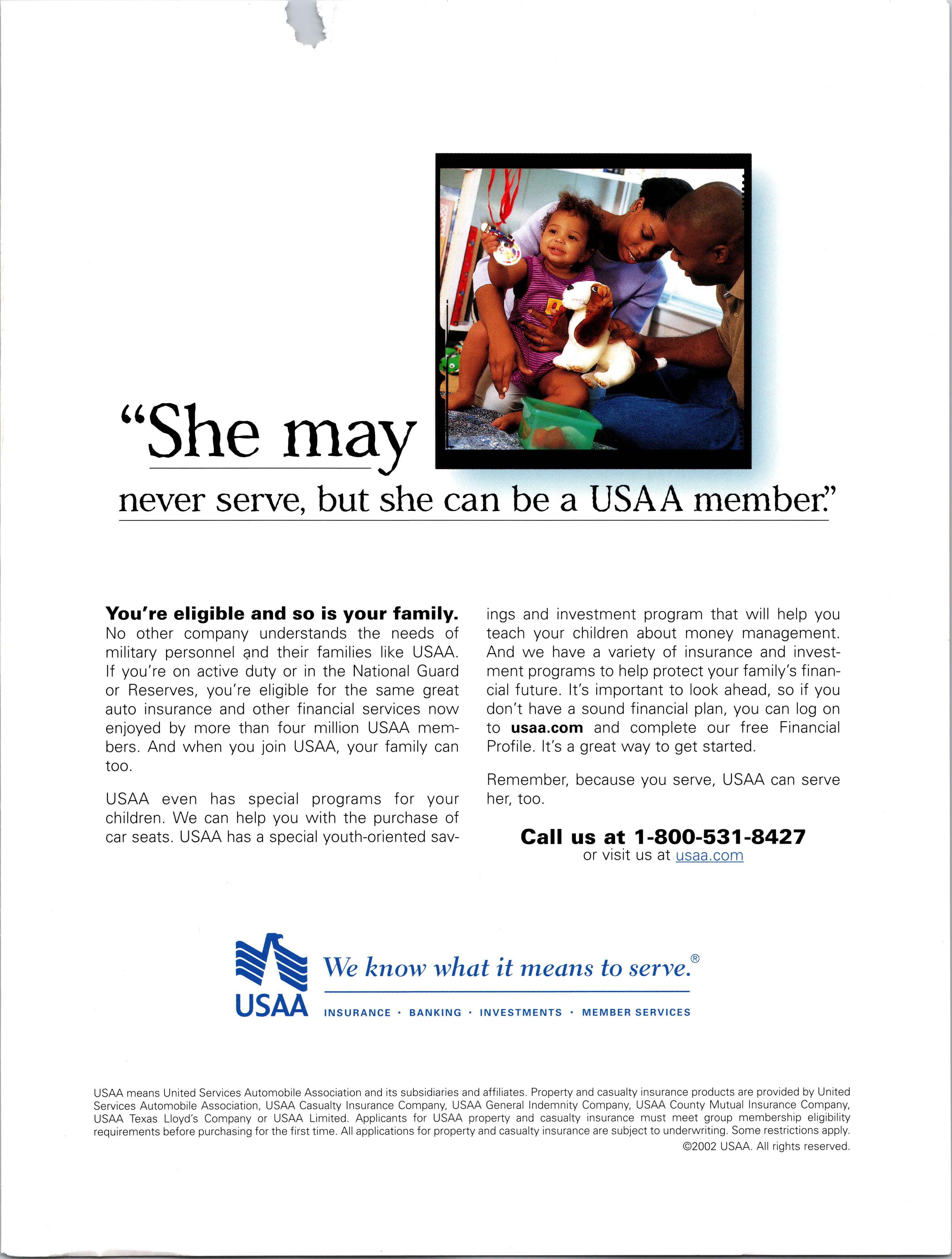 USAA We know what it means to serve! INSURANCE BANKING INVESTMENTS MEMBER SERVICES USAA means United Services Automobile Association and its subsidiaries and affiliates. Property and casualty insurance products are provided by United Services Automobile Association, USAA Casualty Insurance Company, USAA General Indemnity Company, USAA County Mutual Insurance Company, USAA Texas Lloyd's Company or USAA Limited. Applicants for USAA property and casualty insurance must meet group membership eligibility requirements before purchasing for the first time. All applications for property and casualty insurance are subject to underwriting. Some restrictions apply. ©2002 USAA. All rights reserved.