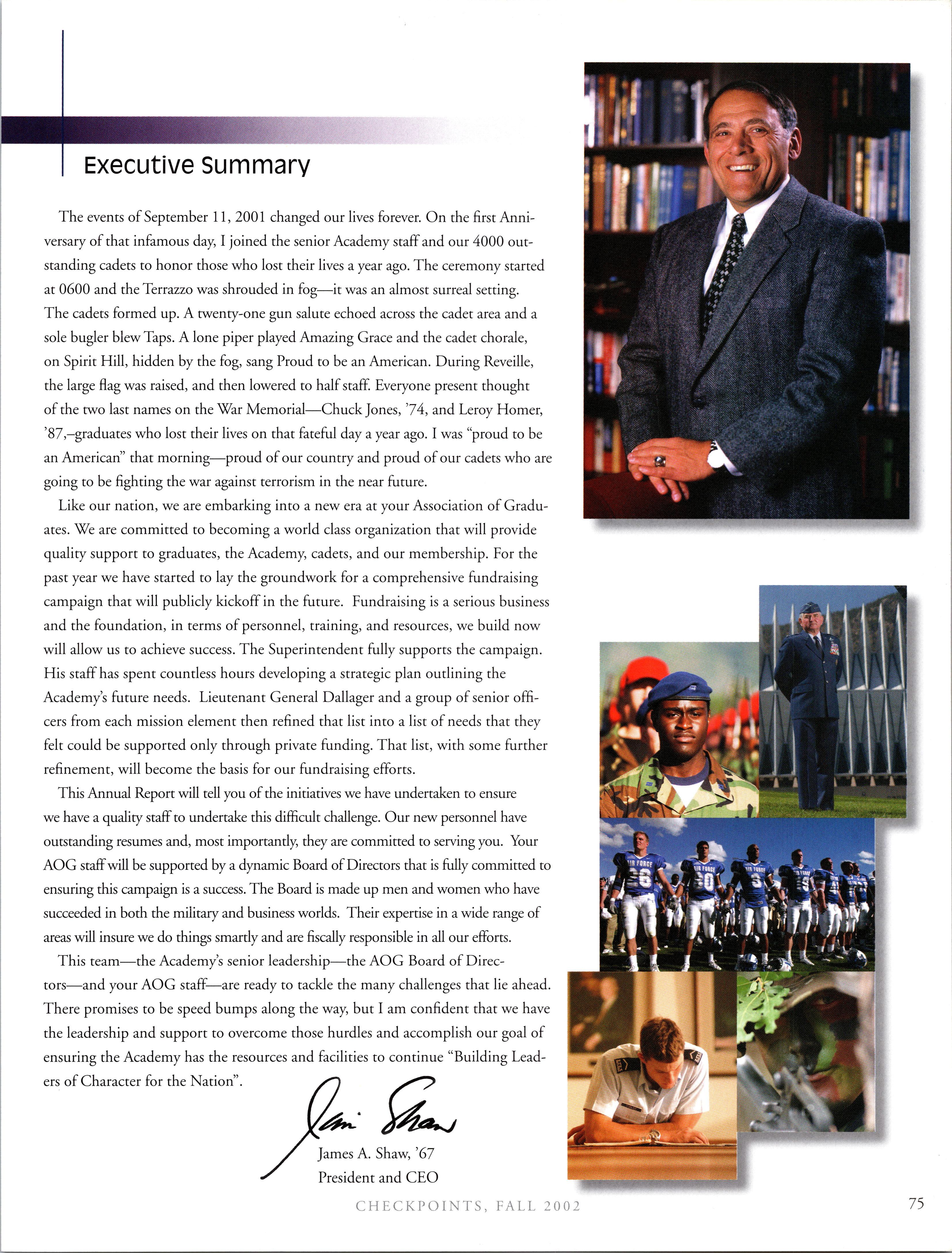 Executive President/CEO: Col. (Ret.) James A. Shaw, ’67