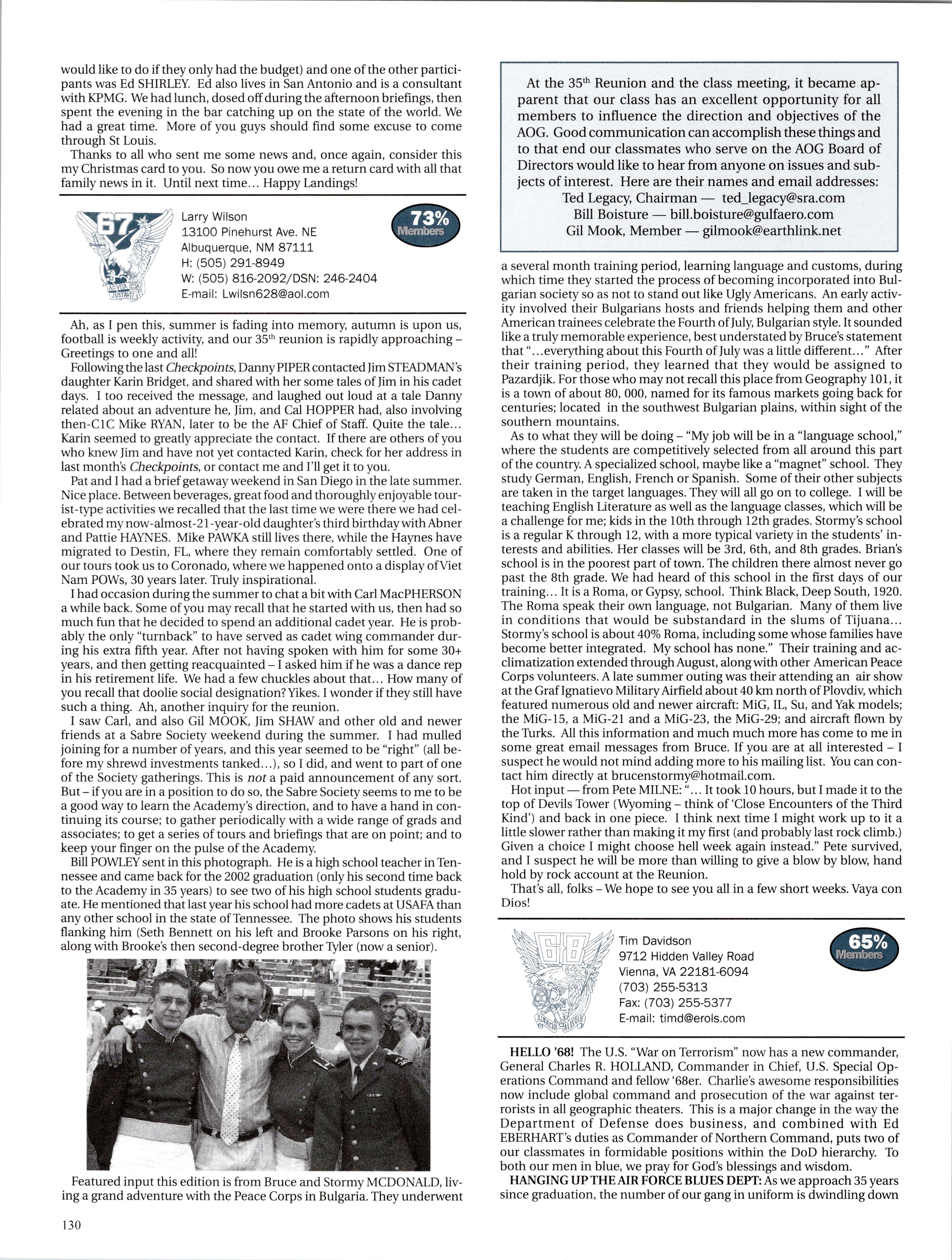Marie McCLELLAN (MAREFAT) is in Services at Moody, and had lots of notes. She got married to Pete McCLELLAN (‘00/’02) and they’re expecting a baby in April on tax day. Matt LUND is back in the states after being in Romania for a year under the Fulbright Scholarship. He’s expecting his first child, too - sometime in Feb 03. Trevor HALL got married a while ago and is in UPT at Columbus. Evan PALMER’S wife had their first baby, a boy, and he’s also off to UPT at Columbus. Wes MILLARD had a baby boy with his wife Jen (ENGLER, ‘00/’02). McKay MORGAN got back from being stationed in Italy - he’s at Laughlin for UPT. Dallas THOMPSON’S putting down some roots at Hill AFB he bought a house there.