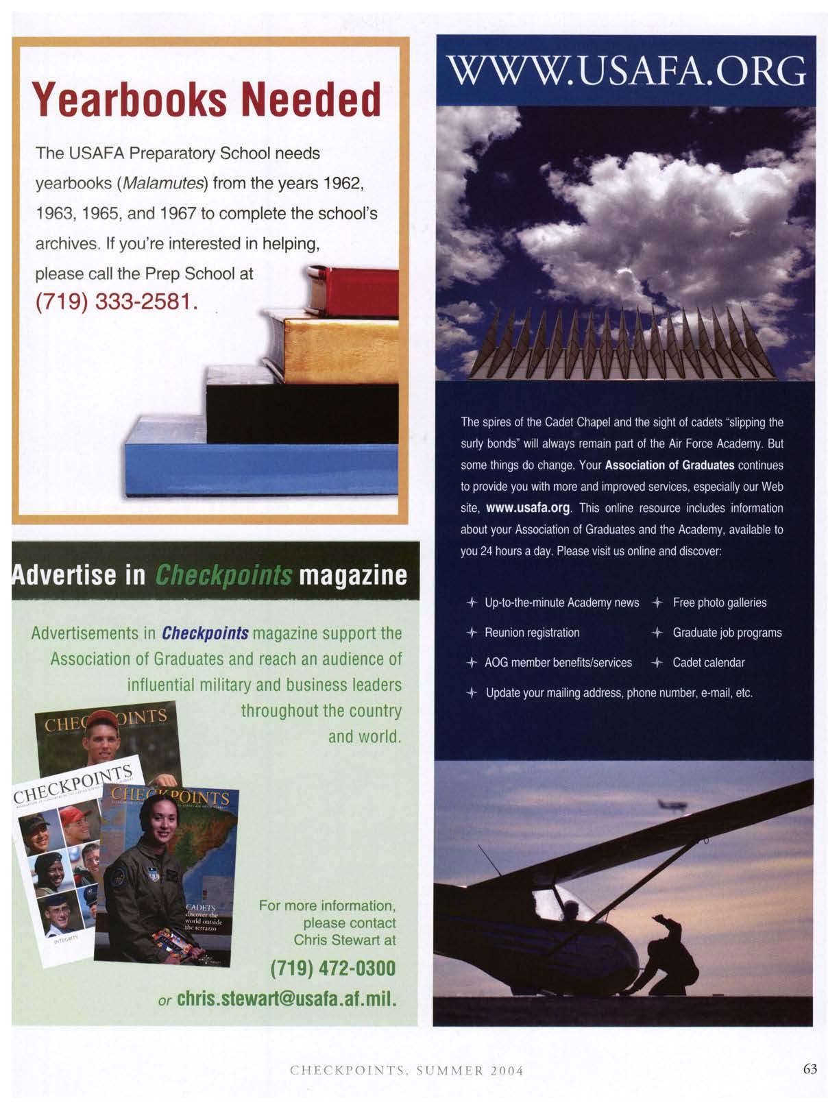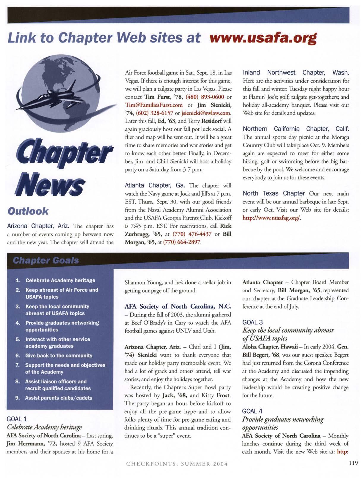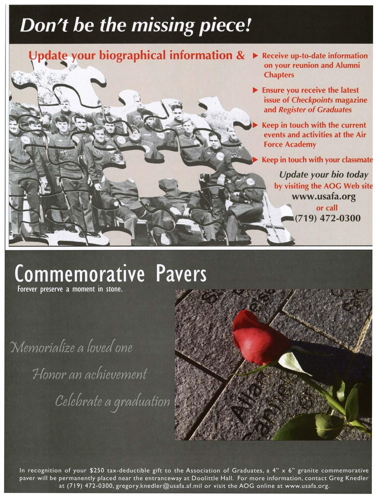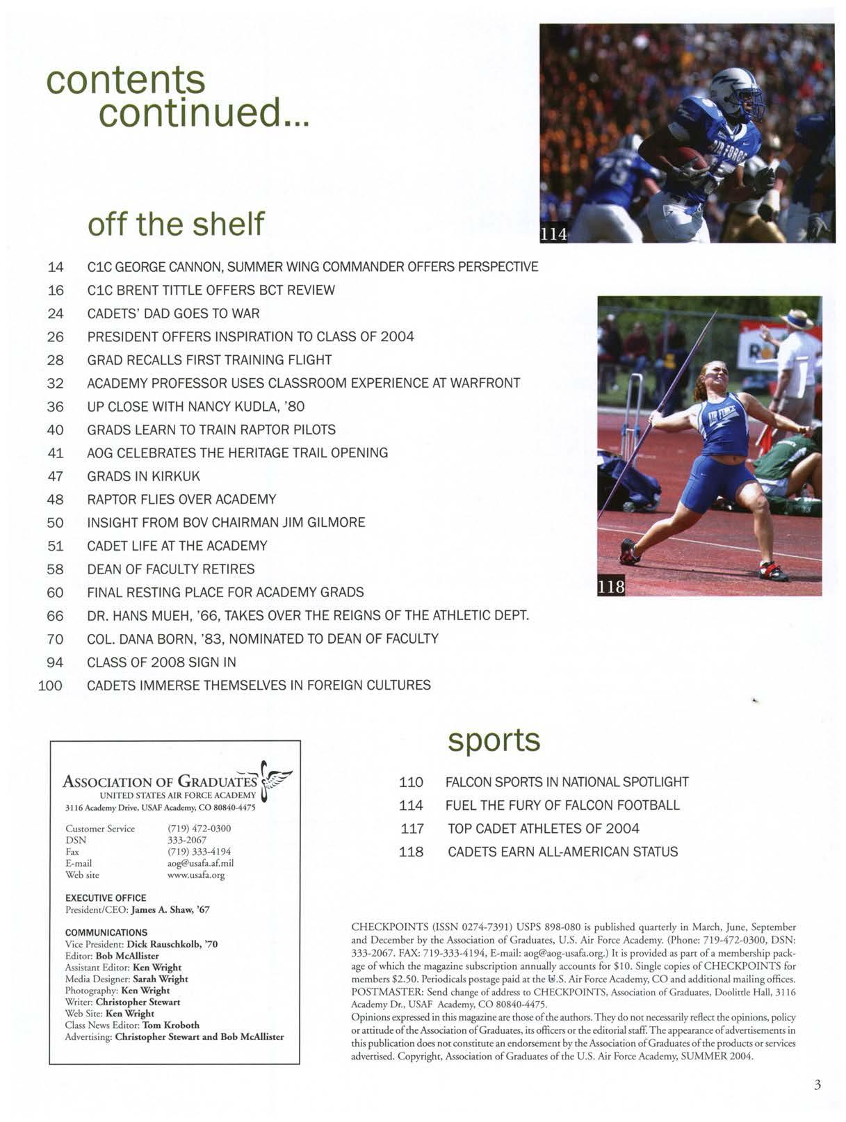Christopher Stewart and Bob McAllister sports 110 FALCON SPORTS IN NATIONAL SPOTLIGHT 114 FUEL THE FURY OF FALCON FOOTBALL 117 TOP CADETATHLETES OF 2004 118 CADETS EARN ALL-AMERICAN STATUS CHECKPOINTS (ISSN 0274-7391) USPS 898-080 is published quarterly in March, June, September and December by the Association of Graduates, U.S. Air Force Academy. (Phone: 719-472-0300, DSN: 333-2067. FAX: 719-333-4194, E-mail: aog@aog-usafa.org.) It is provided as part of a membership package ofwhich the magazine subscription annually accounts for $10. Single copies of CHECKPOINTS for members $2.50. Periodicals postage paid at the U.S. Air Force Academy, CO and additional mailing offices. POSTMASTER: Send change of address to CHECKPOINTS, Association of Graduates, Doolittle Hall, 3116 Academy Dr., USAF Academy, CO 80840-4475. Opinionsexpressed in this magazine are those ofthe authors. They do not necessarily reflect the opinions, policy or attitude oftheAssociation ofGraduates, its officers or the editorial staff. The appearance ofadvertisements in this publication does not constitute an endorsement by theAssociation ofGraduates ofthe products or services advertised. Copyright, Association of Graduates ofthe U.S. Air Force Academy, SUMMER 2004.