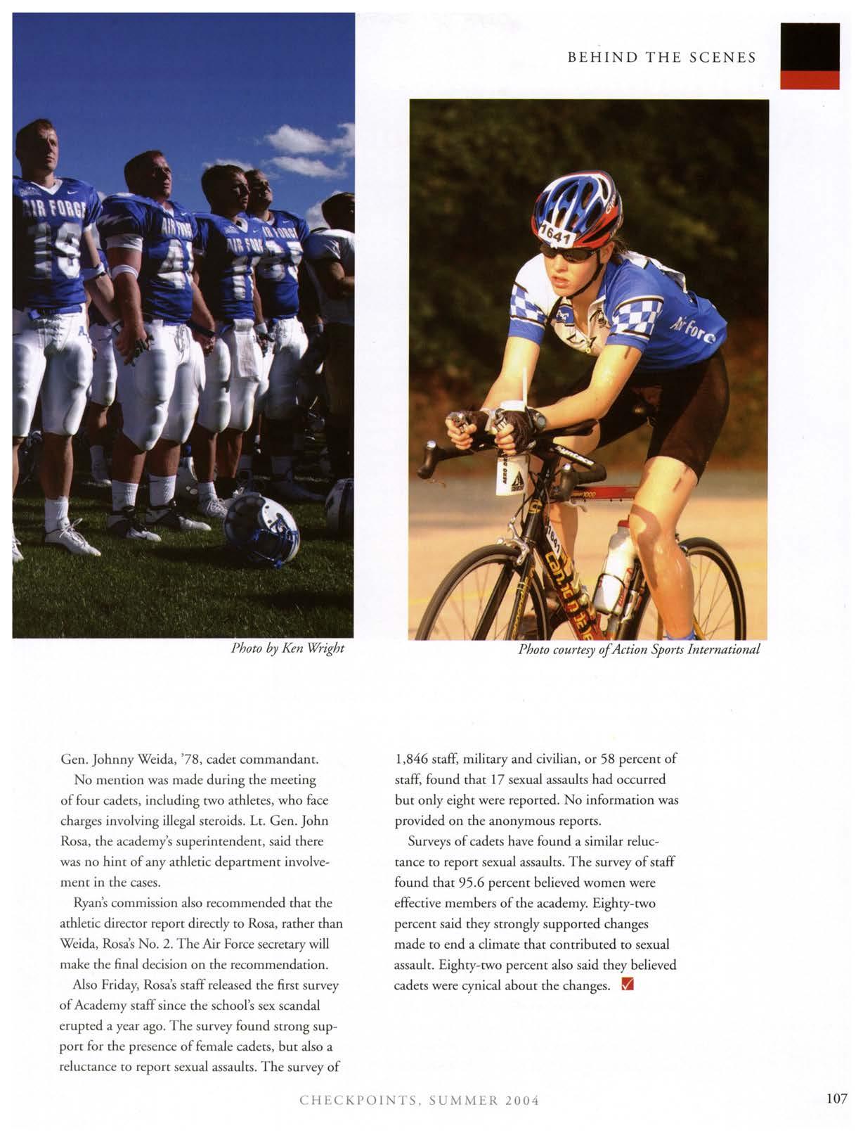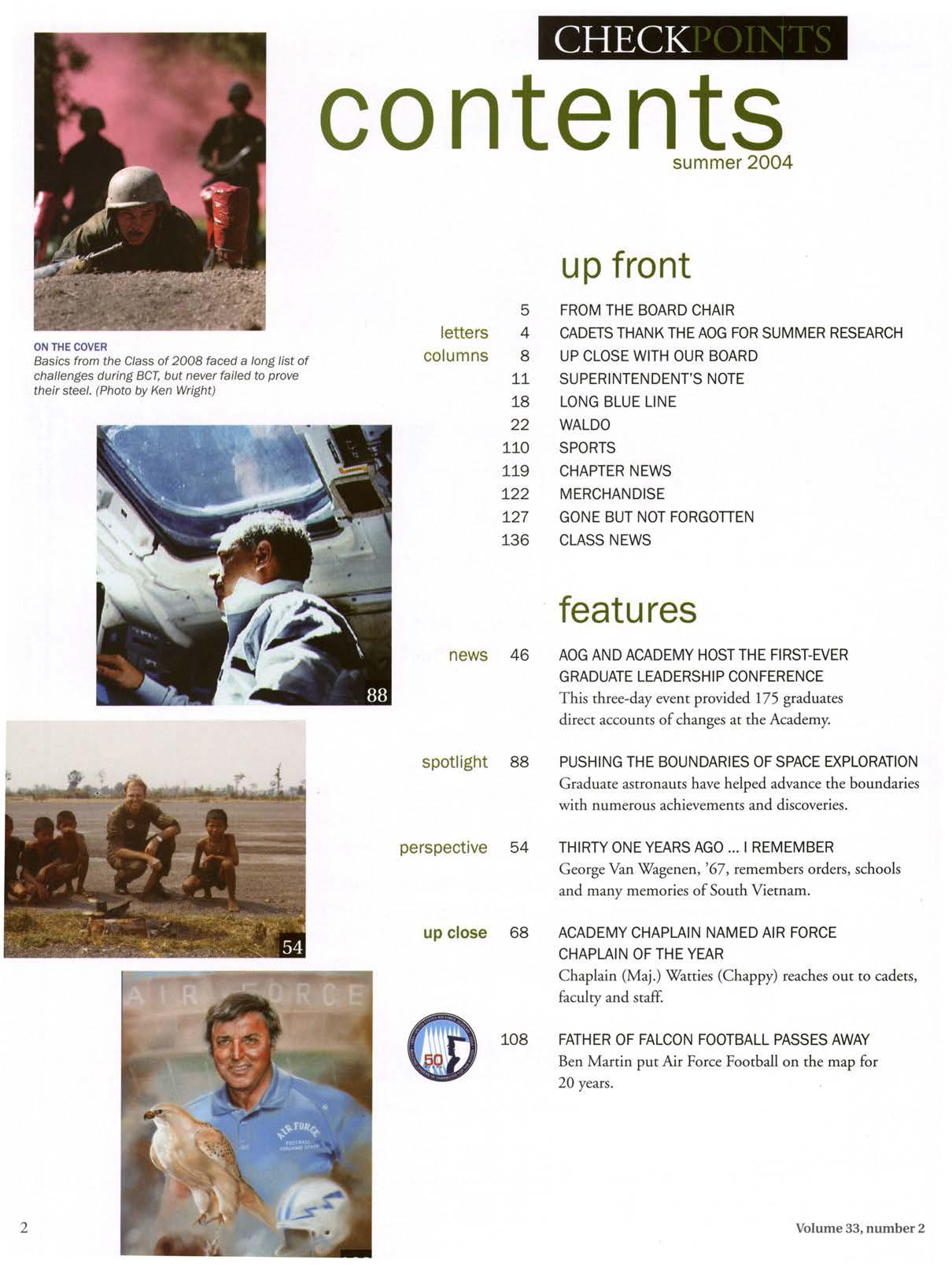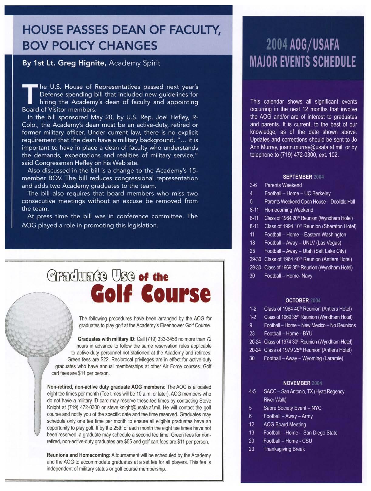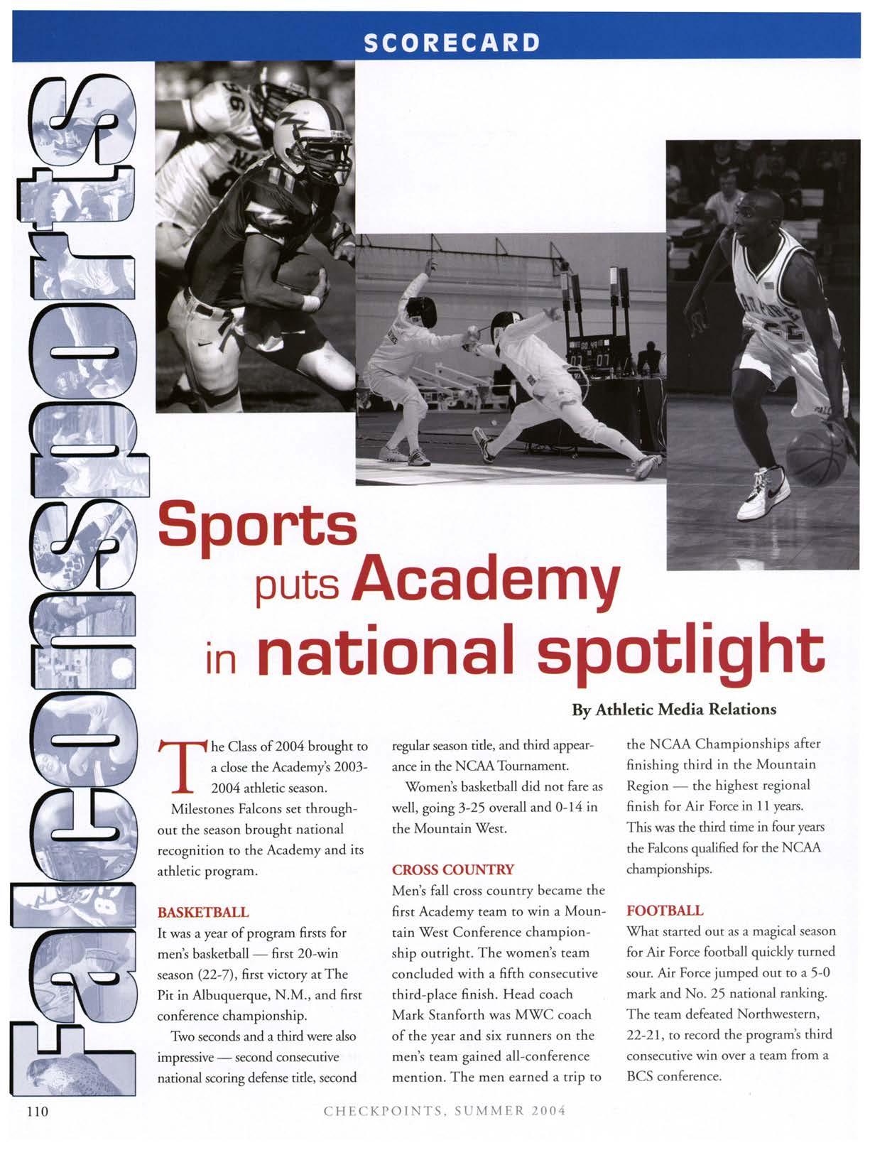 Christopher Stewart and Bob McAllister sports 110 FALCON SPORTS IN NATIONAL SPOTLIGHT 114 FUEL THE FURY OF FALCON FOOTBALL 117 TOP CADETATHLETES OF 2004 118 CADETS EARN ALL-AMERICAN STATUS CHECKPOINTS (ISSN 0274-7391) USPS 898-080 is published quarterly in March, June, September and December by the Association of Graduates, U.S. Air Force Academy. (Phone: 719-472-0300, DSN: 333-2067. FAX: 719-333-4194, E-mail: aog@aog-usafa.org.) It is provided as part of a membership package ofwhich the magazine subscription annually accounts for $10. Single copies of CHECKPOINTS for members $2.50. Periodicals postage paid at the U.S. Air Force Academy, CO and additional mailing offices. POSTMASTER: Send change of address to CHECKPOINTS, Association of Graduates, Doolittle Hall, 3116 Academy Dr., USAF Academy, CO 80840-4475. Opinionsexpressed in this magazine are those ofthe authors. They do not necessarily reflect the opinions, policy or attitude oftheAssociation ofGraduates, its officers or the editorial staff. The appearance ofadvertisements in this publication does not constitute an endorsement by theAssociation ofGraduates ofthe products or services advertised. Copyright, Association of Graduates ofthe U.S. Air Force Academy, SUMMER 2004.