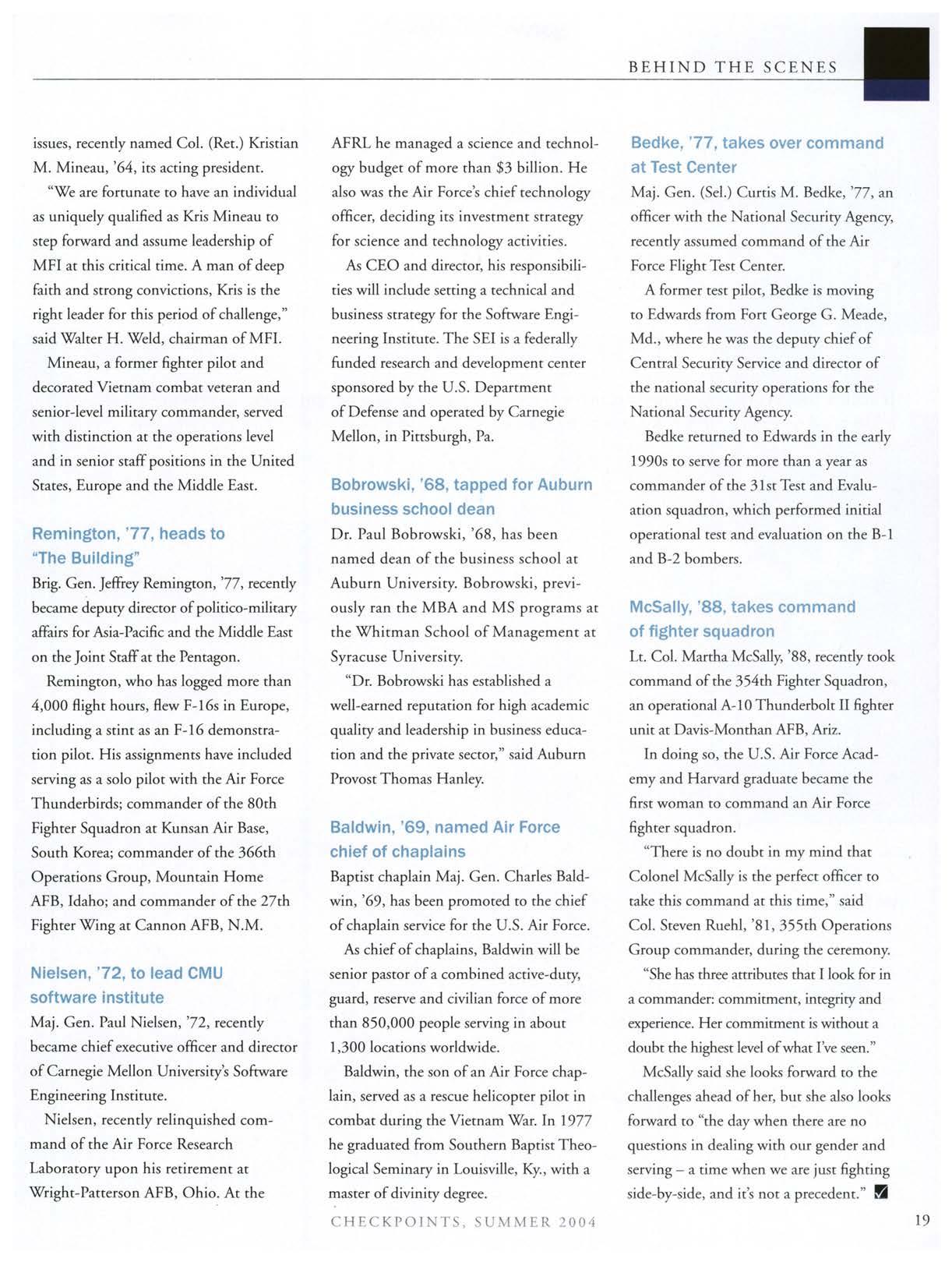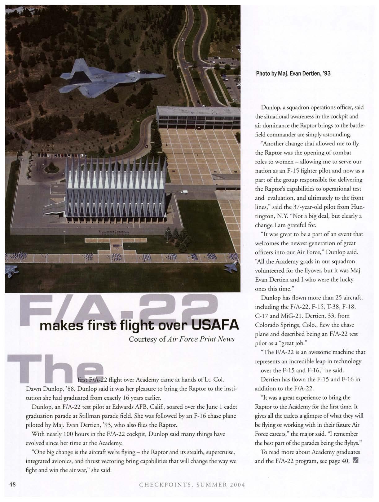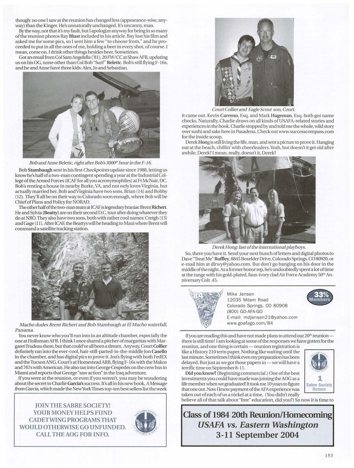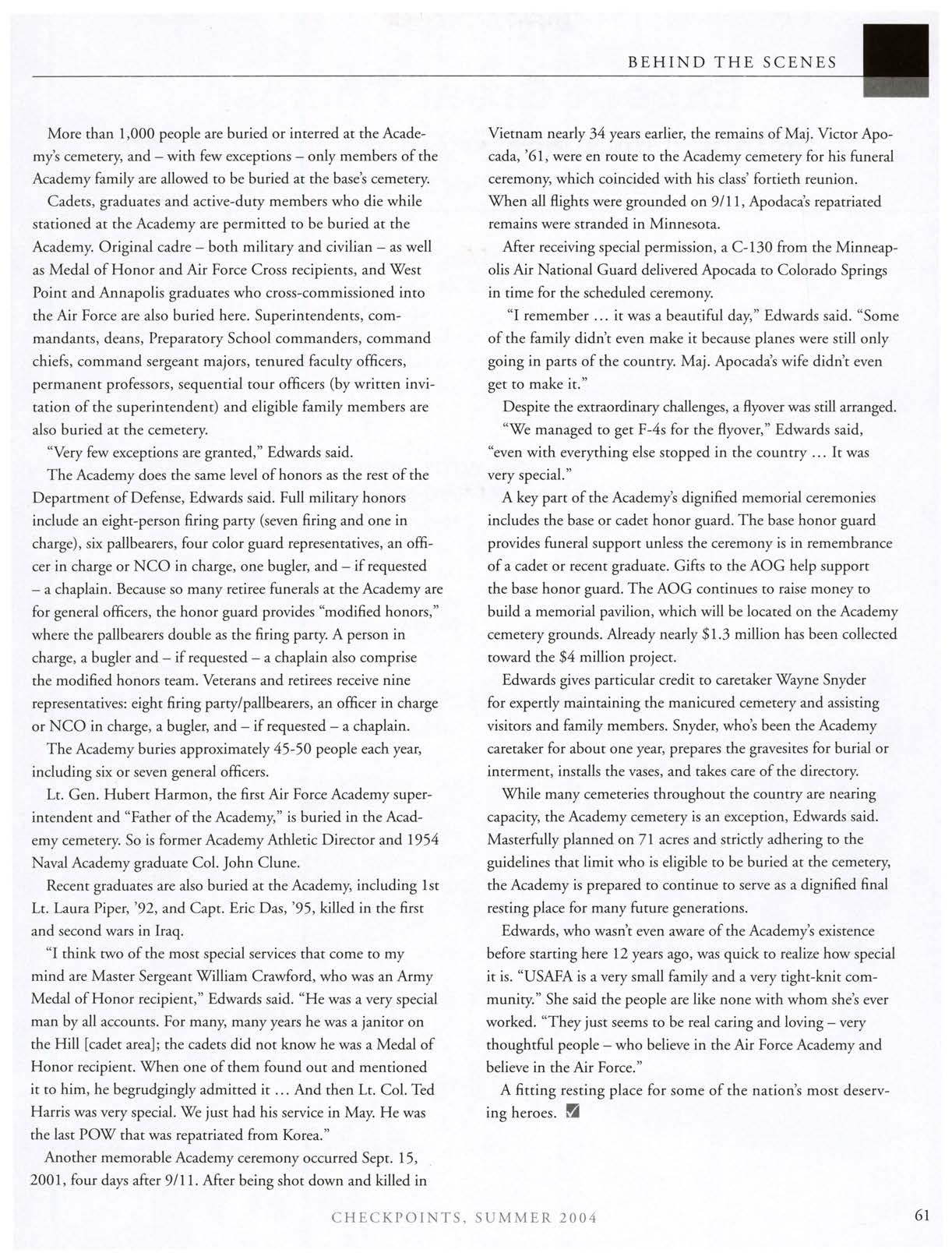 Christopher Stewart and Bob McAllister sports 110 FALCON SPORTS IN NATIONAL SPOTLIGHT 114 FUEL THE FURY OF FALCON FOOTBALL 117 TOP CADETATHLETES OF 2004 118 CADETS EARN ALL-AMERICAN STATUS CHECKPOINTS (ISSN 0274-7391) USPS 898-080 is published quarterly in March, June, September and December by the Association of Graduates, U.S. Air Force Academy. (Phone: 719-472-0300, DSN: 333-2067. FAX: 719-333-4194, E-mail: aog@aog-usafa.org.) It is provided as part of a membership package ofwhich the magazine subscription annually accounts for $10. Single copies of CHECKPOINTS for members $2.50. Periodicals postage paid at the U.S. Air Force Academy, CO and additional mailing offices. POSTMASTER: Send change of address to CHECKPOINTS, Association of Graduates, Doolittle Hall, 3116 Academy Dr., USAF Academy, CO 80840-4475. Opinionsexpressed in this magazine are those ofthe authors. They do not necessarily reflect the opinions, policy or attitude oftheAssociation ofGraduates, its officers or the editorial staff. The appearance ofadvertisements in this publication does not constitute an endorsement by theAssociation ofGraduates ofthe products or services advertised. Copyright, Association of Graduates ofthe U.S. Air Force Academy, SUMMER 2004.