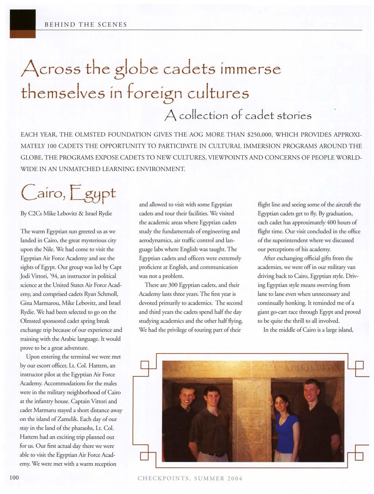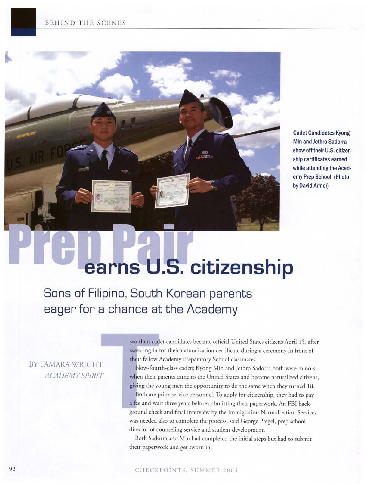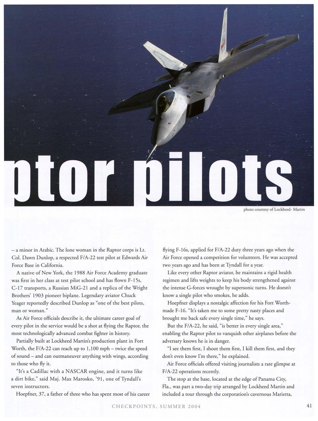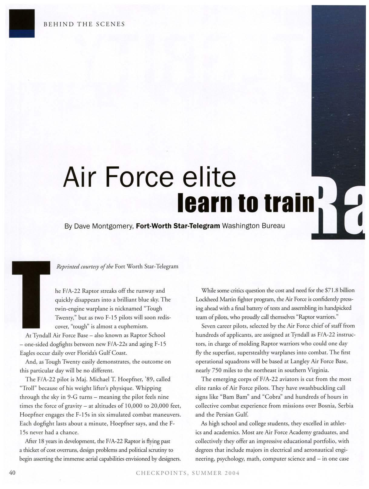 Christopher Stewart and Bob McAllister sports 110 FALCON SPORTS IN NATIONAL SPOTLIGHT 114 FUEL THE FURY OF FALCON FOOTBALL 117 TOP CADETATHLETES OF 2004 118 CADETS EARN ALL-AMERICAN STATUS CHECKPOINTS (ISSN 0274-7391) USPS 898-080 is published quarterly in March, June, September and December by the Association of Graduates, U.S. Air Force Academy. (Phone: 719-472-0300, DSN: 333-2067. FAX: 719-333-4194, E-mail: aog@aog-usafa.org.) It is provided as part of a membership package ofwhich the magazine subscription annually accounts for $10. Single copies of CHECKPOINTS for members $2.50. Periodicals postage paid at the U.S. Air Force Academy, CO and additional mailing offices. POSTMASTER: Send change of address to CHECKPOINTS, Association of Graduates, Doolittle Hall, 3116 Academy Dr., USAF Academy, CO 80840-4475. Opinionsexpressed in this magazine are those ofthe authors. They do not necessarily reflect the opinions, policy or attitude oftheAssociation ofGraduates, its officers or the editorial staff. The appearance ofadvertisements in this publication does not constitute an endorsement by theAssociation ofGraduates ofthe products or services advertised. Copyright, Association of Graduates ofthe U.S. Air Force Academy, SUMMER 2004.