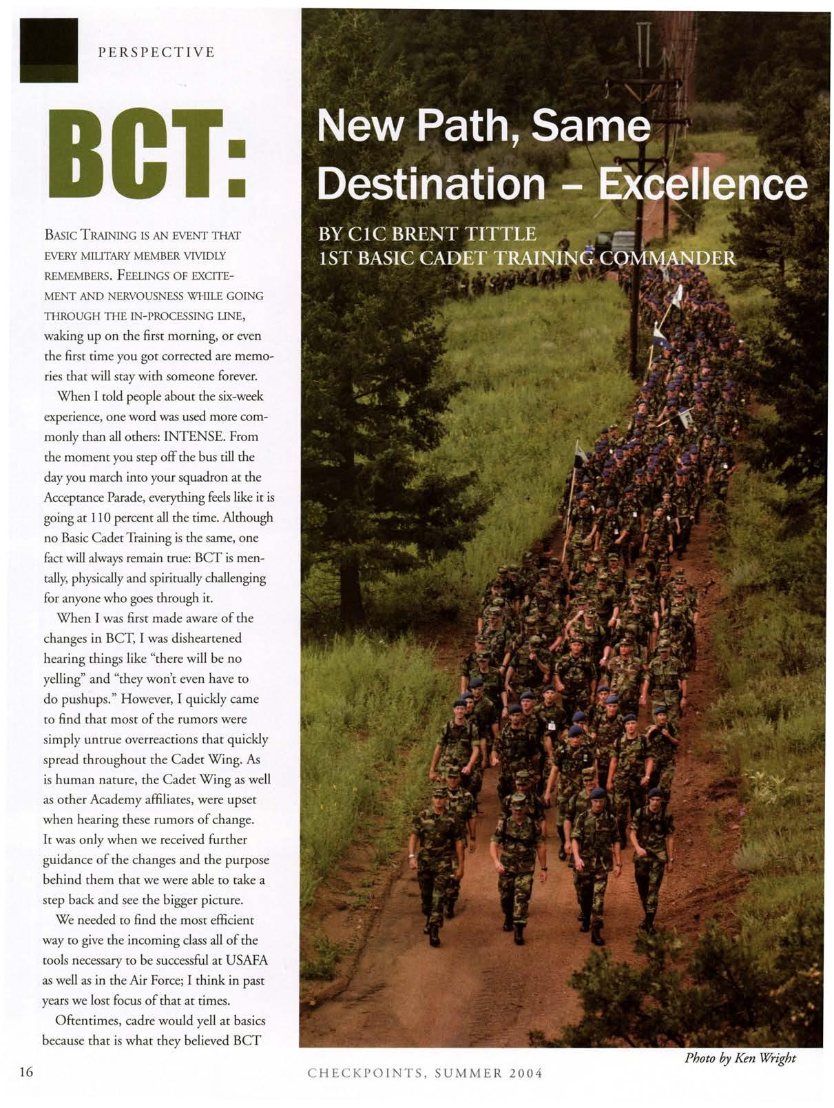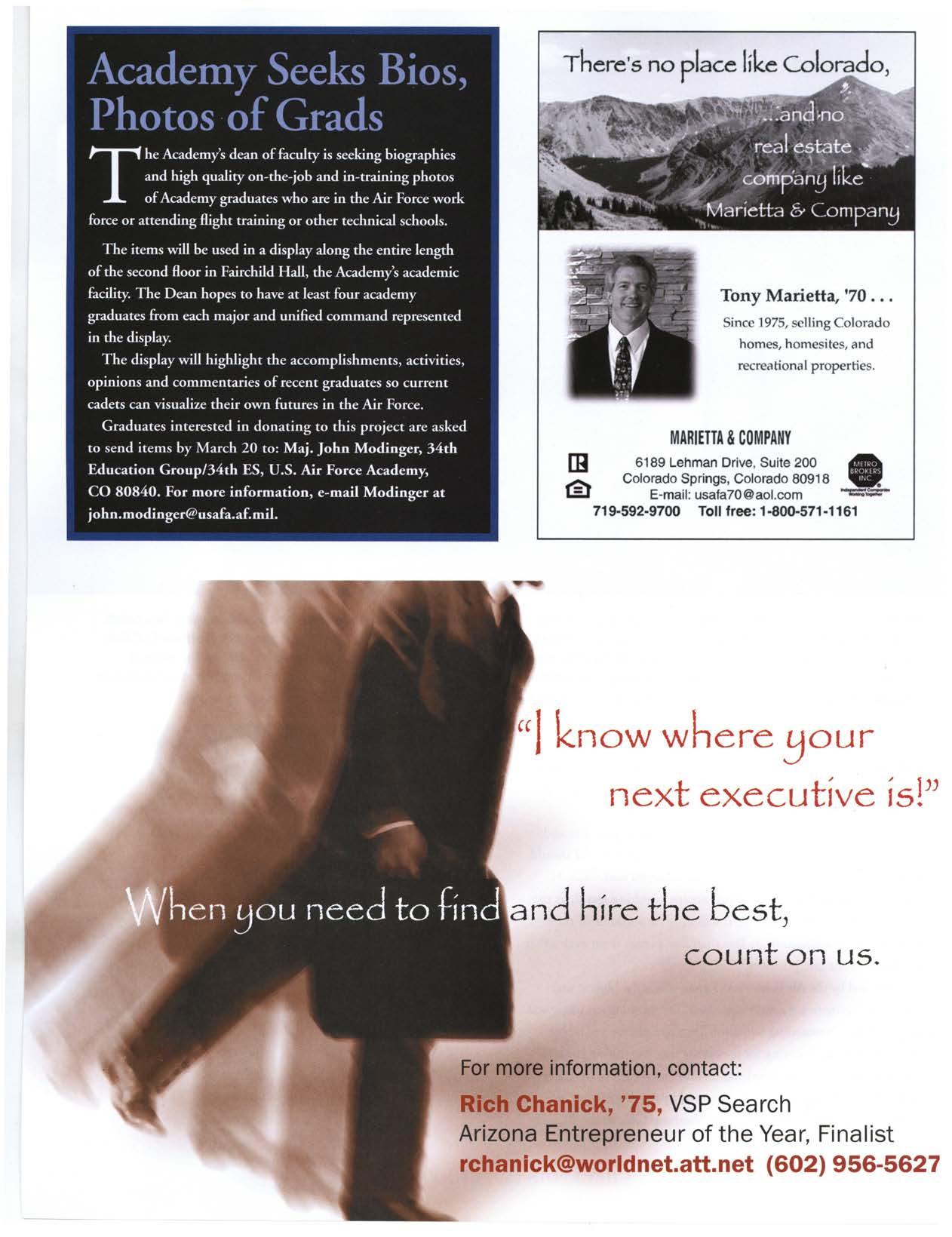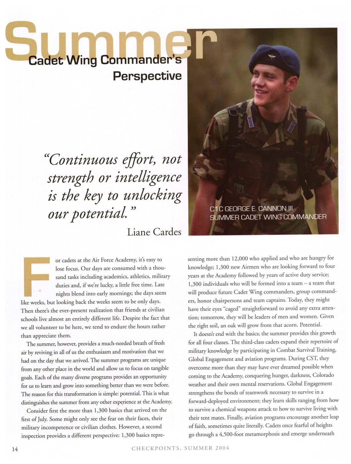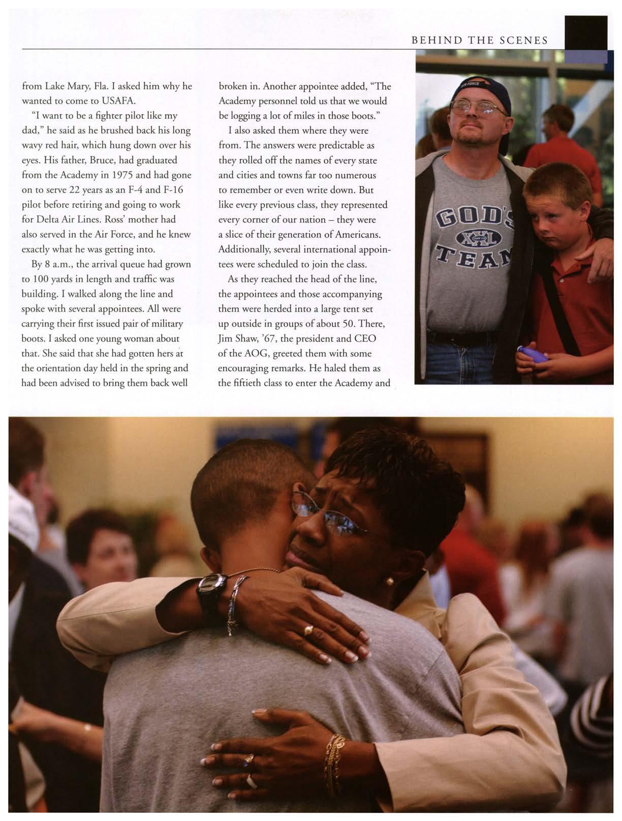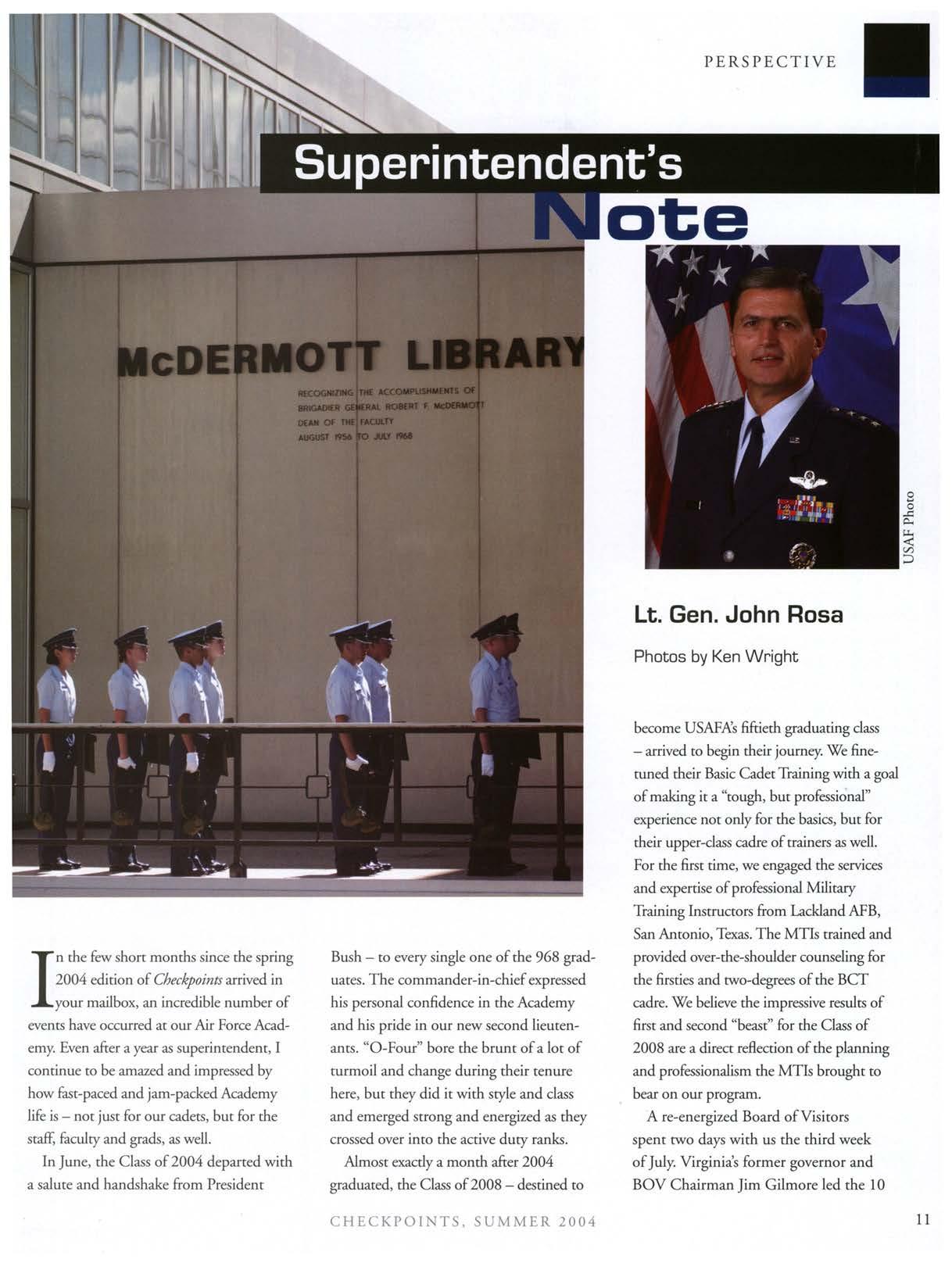 leadershe was about to observe enteringtheUnited StatesAirForce. I wonder iftheytold him about our audacious, incessant spirit missions - from putting blue food coloring in the water fountains to painting an '04 on Eagle’s Peak. I wonder iftheygave voice to our ambitions, ambitions to do everything from flyingfighter aircraft to healingbroken bones to conducting combat search and rescue missions. I wonder ifthey mentioned thatofallthe classes in the 50-yearhistoryofour alma mater, we havearguablyseen themost administrative change, engagingthat change firstwith defensive questions but, ultimately, demonstrative grace. Ifpastperformanceis anyindication offuture expectations, the business ofthe U.S. Armed Forces couldpossiblybe lifted to a flamboyantprofessionalismunparalleled in itshistory-at leastthat isthe earnesthope ofthe Class of2004.