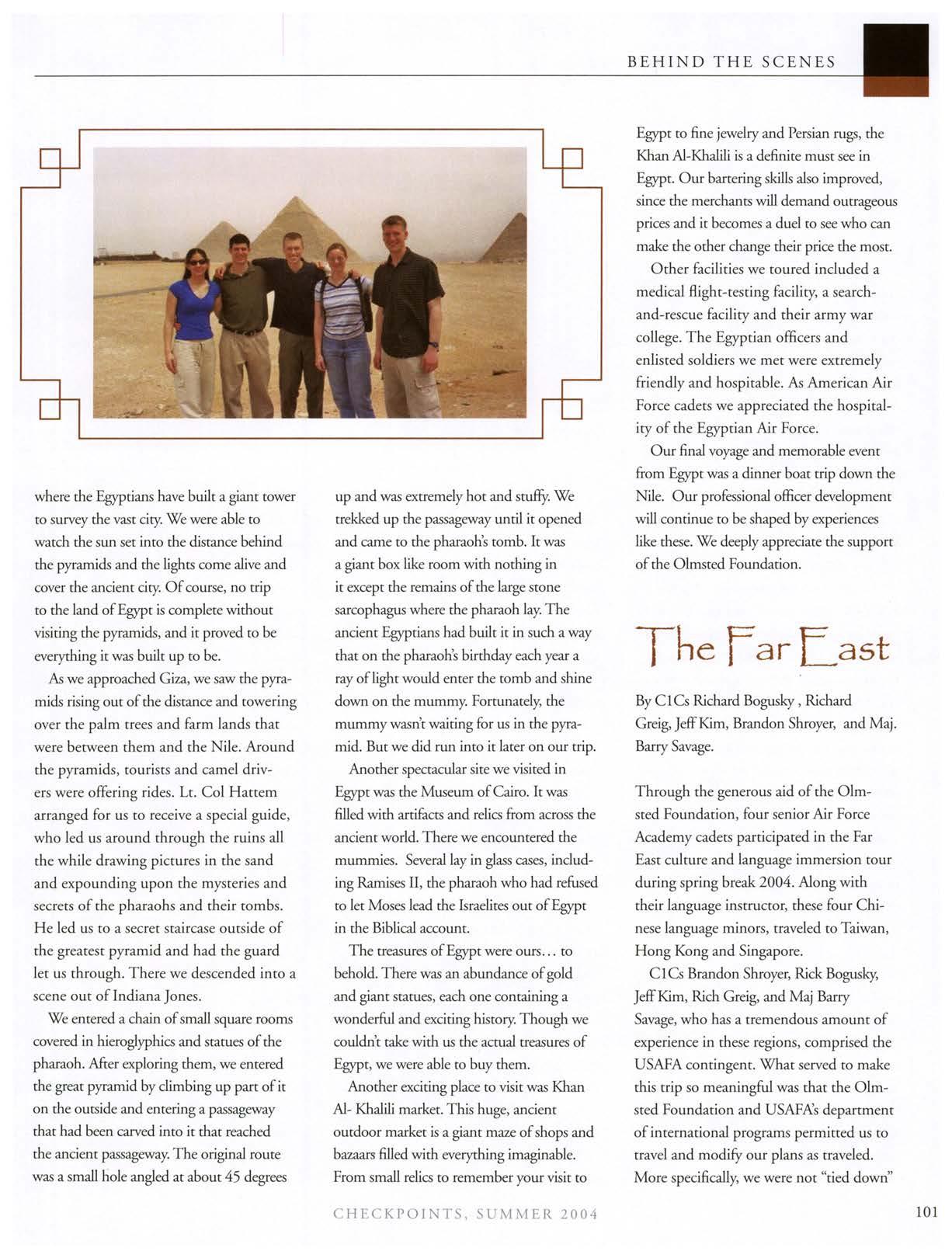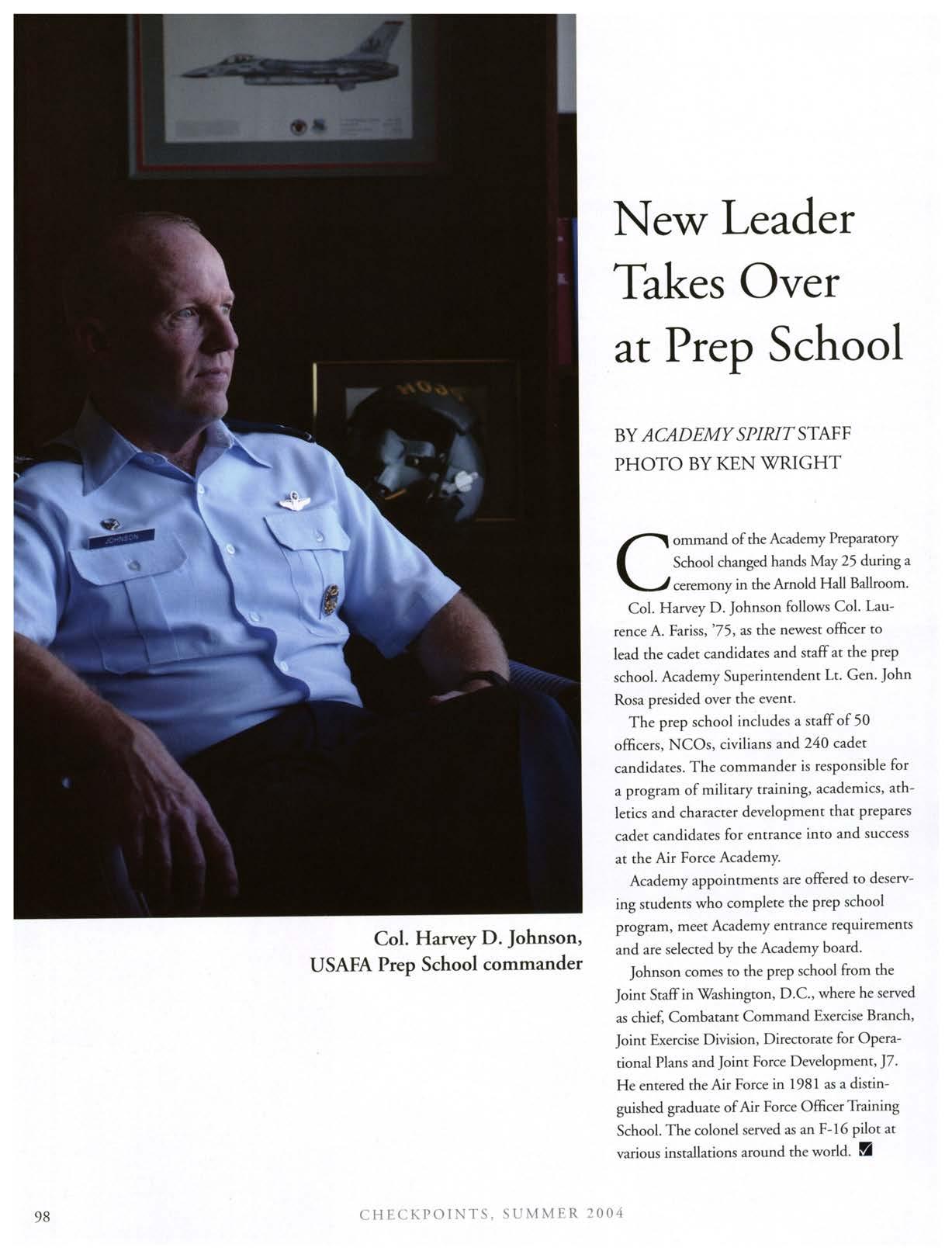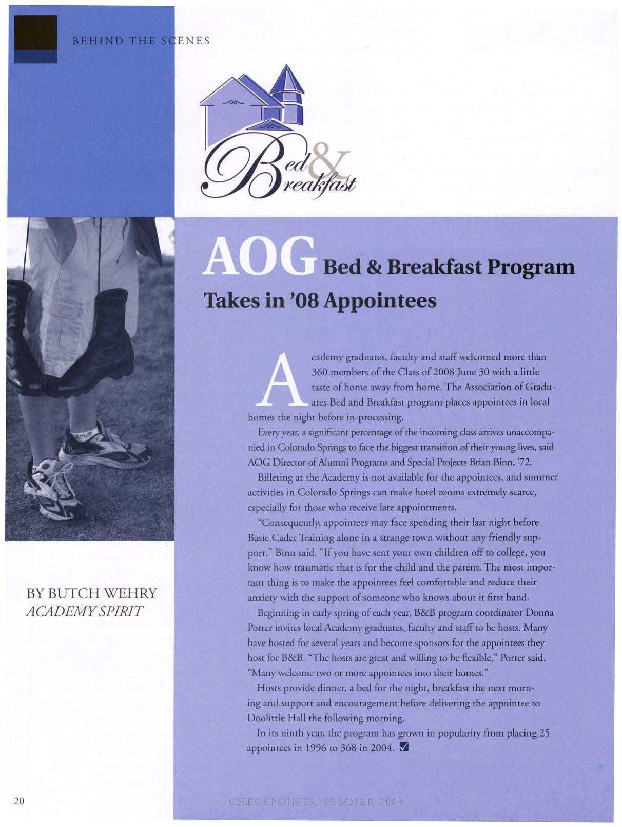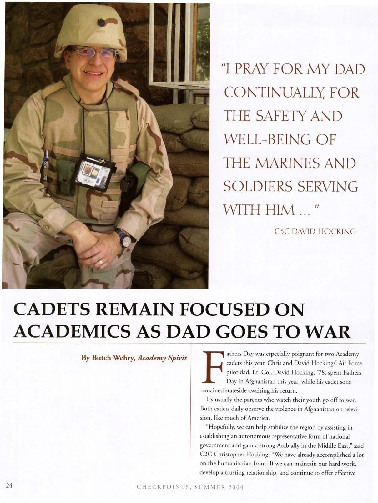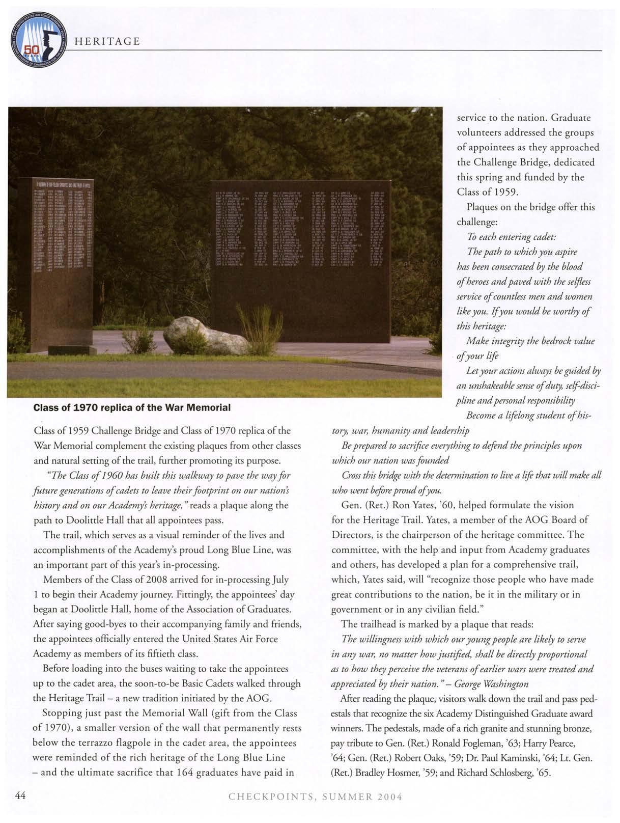 leadershe was about to observe enteringtheUnited StatesAirForce. I wonder iftheytold him about our audacious, incessant spirit missions - from putting blue food coloring in the water fountains to painting an '04 on Eagle’s Peak. I wonder iftheygave voice to our ambitions, ambitions to do everything from flyingfighter aircraft to healingbroken bones to conducting combat search and rescue missions. I wonder ifthey mentioned thatofallthe classes in the 50-yearhistoryofour alma mater, we havearguablyseen themost administrative change, engagingthat change firstwith defensive questions but, ultimately, demonstrative grace. Ifpastperformanceis anyindication offuture expectations, the business ofthe U.S. Armed Forces couldpossiblybe lifted to a flamboyantprofessionalismunparalleled in itshistory-at leastthat isthe earnesthope ofthe Class of2004.