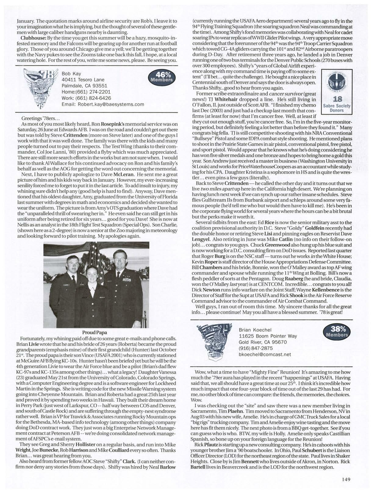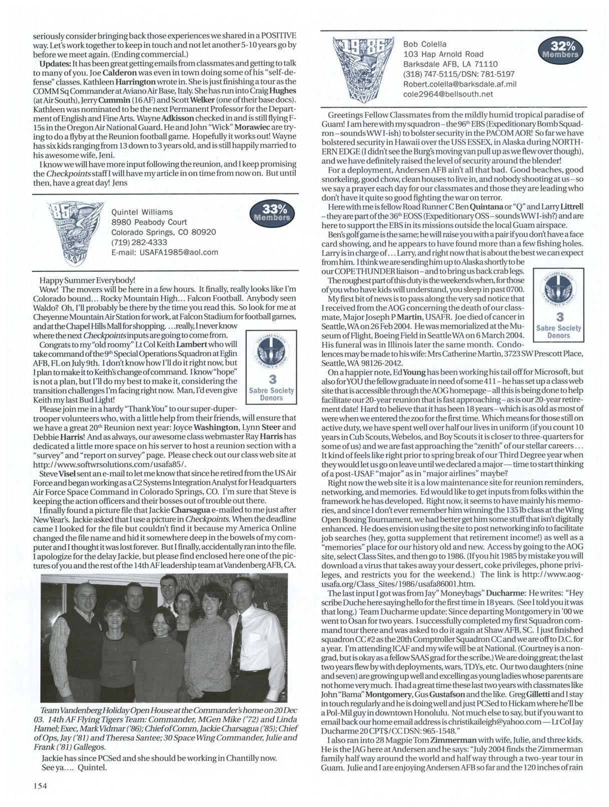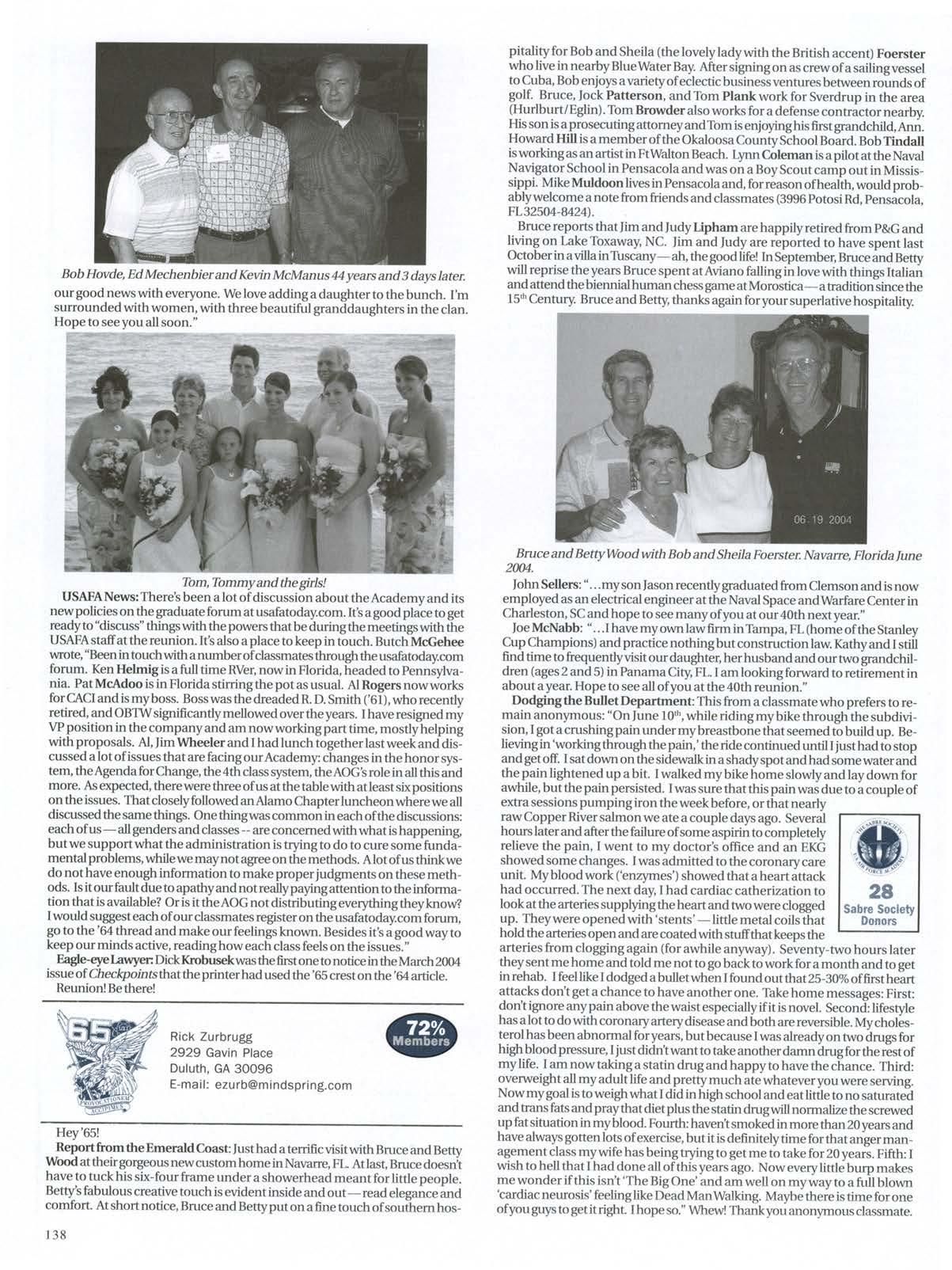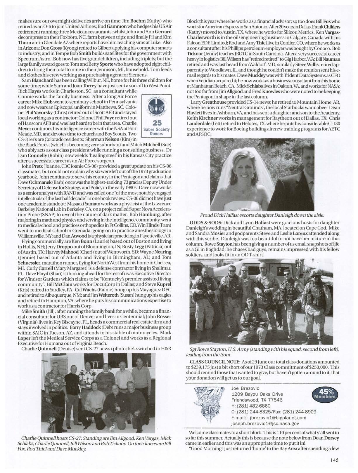That’s all I have for now because I didn’t receive too manyupdates for this article. Remember, ifyou want the class to knowwhatyou’re up to please let me know so I can includeithere. This isOURarticle, a placefor us to sharewith other alumni and fellowclassmates’ stories, news, and anyother pertinent information we want to present. Itwill onlybe as good as the contributions we make and myabilityto present it to all ofyou. Ifyou have anyadvice, critiques, or opinions ofthese articles and their content please let me know. Take care and good luck.