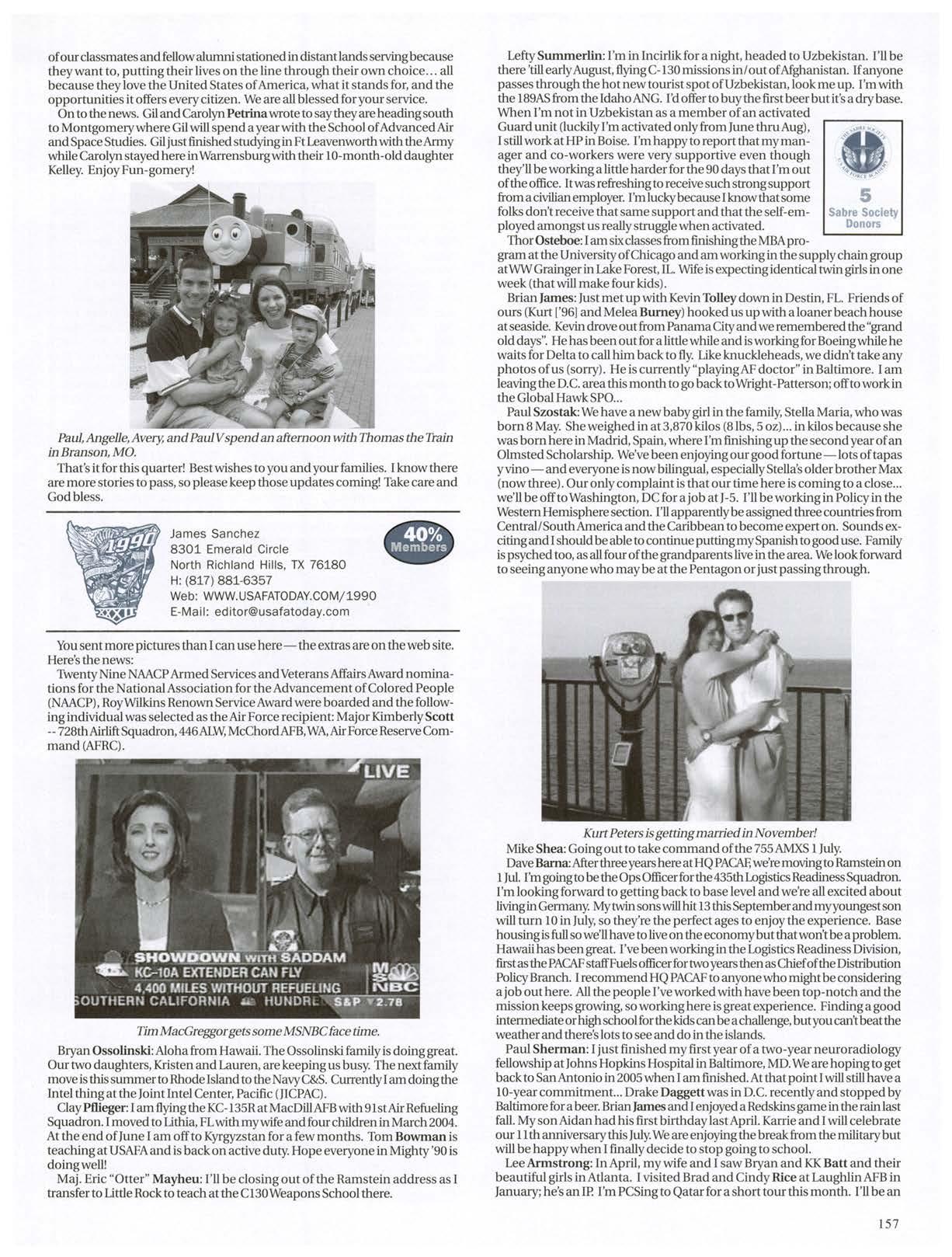 Nowforthe news fromaroundthe F-16bases: Steph Ballardand EricaAndren are at Shawdoingintelwork. Bothhavecompletedrotations in theAOR. Brian “Chewan” Deas, wife, Kristy, and 18-month-old daughterKalyssahavebeen at CannonAFB, NM for over two years now. Brian is a Block 50 flight leadwith the 522 FS Fightin’ Fireballs. The Deas familywill PCS to Misawa in the fall where Brian will continue flyingthe world’s greatest multi-role fighter. Other ’99ers at Cannon are Brian “Fuze” Healy,Andy“Judge” Beitz, Steve “Bjorn” Engberg, and Chad “Skeet” Martin. Skeet and Bjornbrought it to the enemyduring OIF, and both Chewan and Fuze have spent time in SWAfillingflightsafetyjobs. Chewan andJudge flew in the graduationparadeflyover thisyear. Greatwork fellas and thanks for the news.