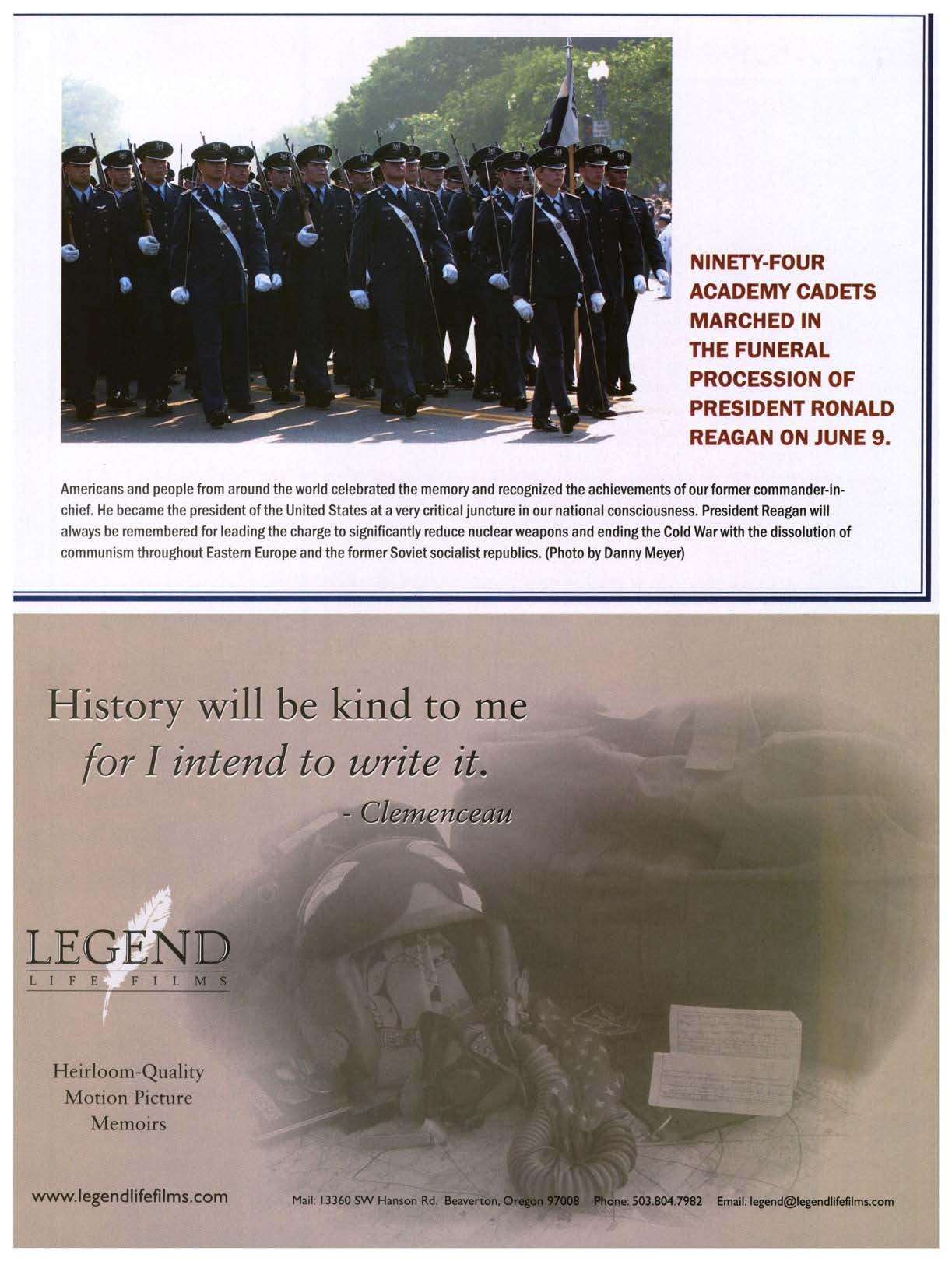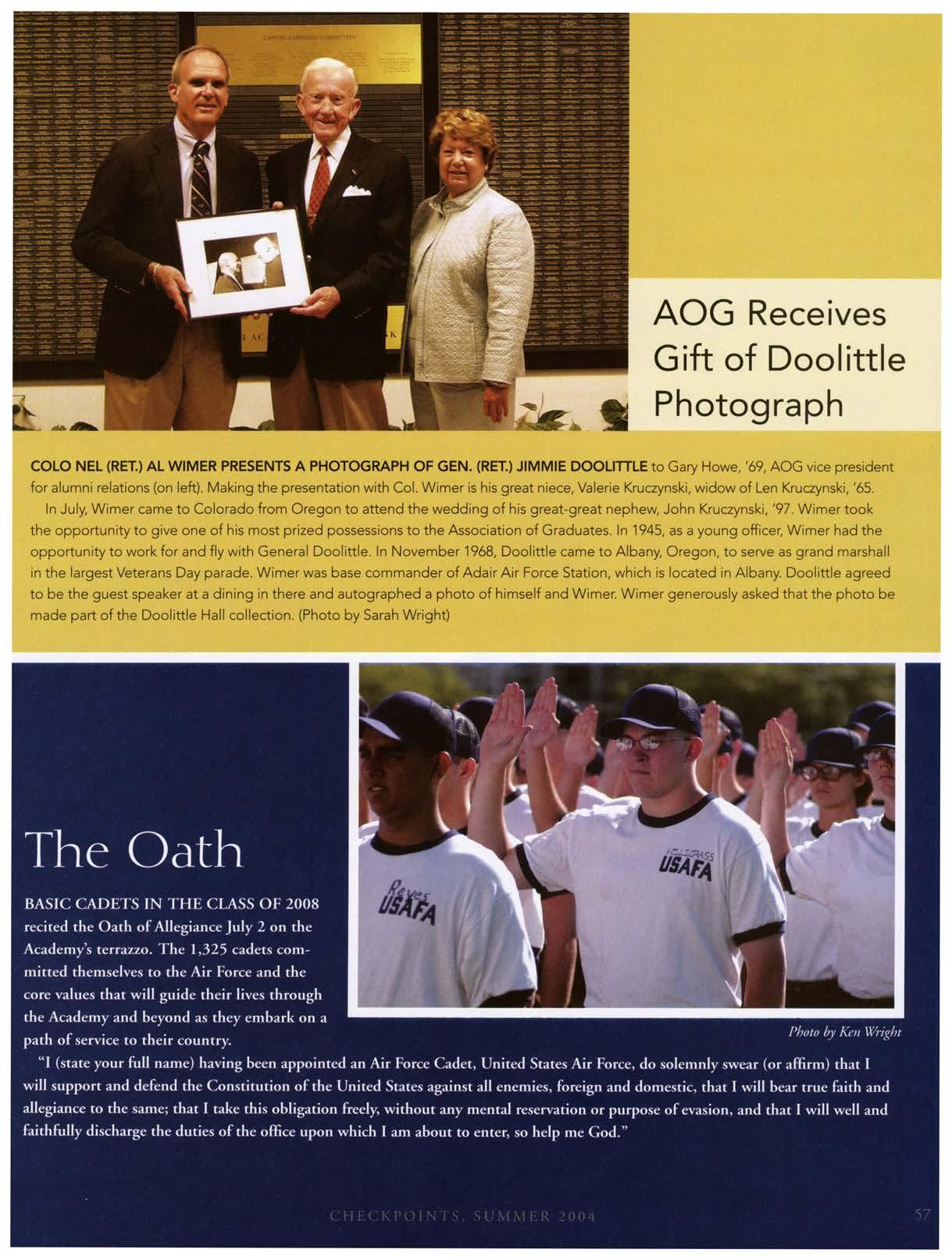 Sowhathappens from here? We have fun.We take care ofpeople.We protect the namesakeoftheUnited StatesAirForceAcademy. Wemakememories. We pause every now and then to look at the crest on the side of our rings and chuckle, with an ever-so-slightdevilishness, “That was ahell ofa good time.” We convincetheworldthatfouryears spent7,258 feetabove sea leveldoes not, ofitself, make us superior to anyone; it simply reinforces an unspoken, but unequivocal, declaration: the Class of2004 is characterized bydisciplined warriors, ready at anytime, to engage an adversaryanywhere, understanding that the wonder oftheAmericanway oflife is worth the sacrifices that have been and will be asked ofus.