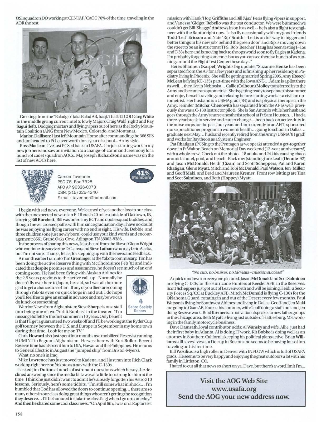 ColPadilla andRandyCarlson gettinga ride to Baghdad. ron (the 9th ARS) is full ofgradsincludingAmanda Myers, DerekRoot, Marty Laye, and Fred Gallegos from ’01; as well as TonyTorres (’98),Wade Holen (’99), Lee Hages and Brian Lane from ’00 and Ryan Sullivan, Dave Henze, Brooke Carr, and Pauline Nyugen from ’02. They are currentlydeployed to A1 Dhafra and flying all over theworld.