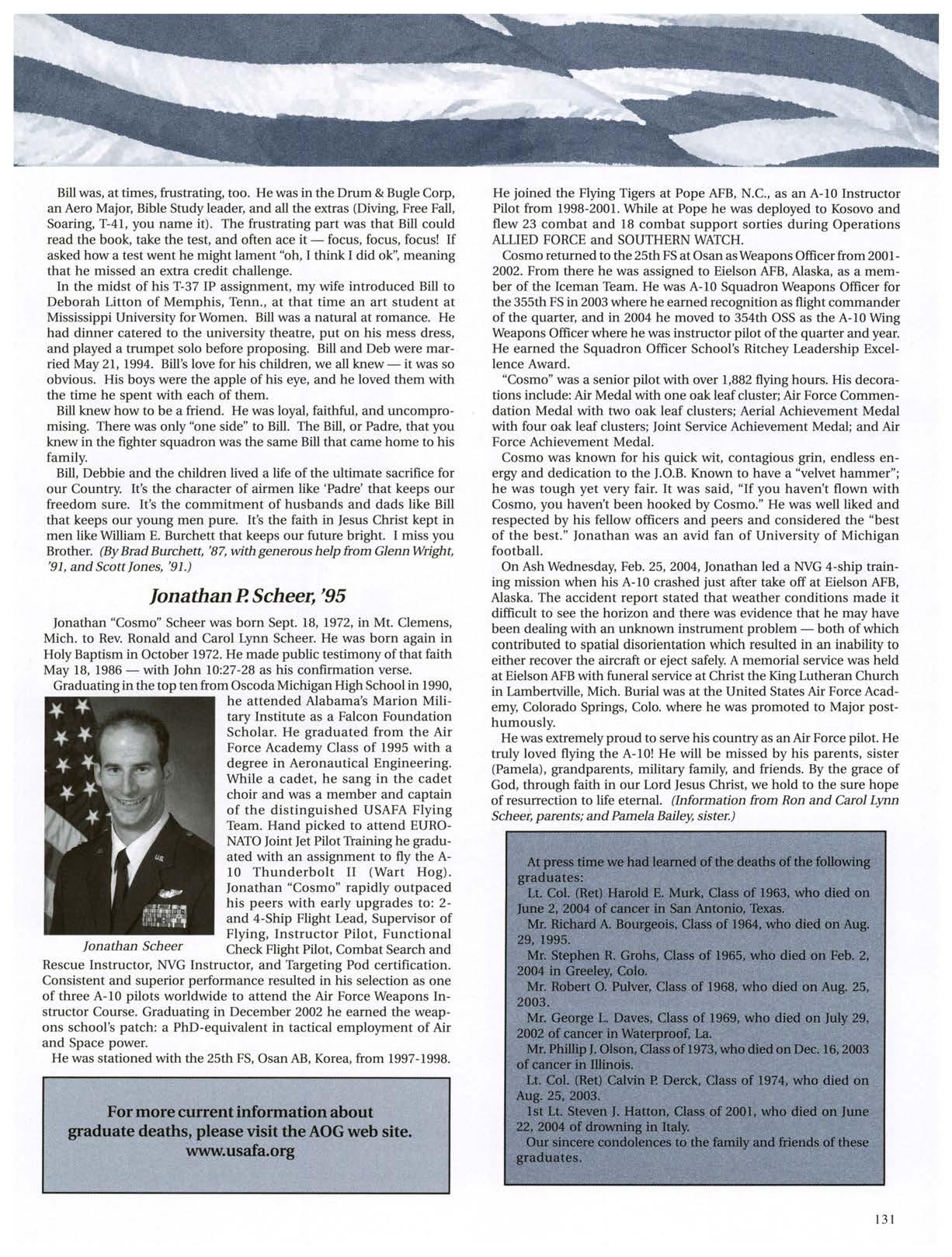 The quickanddirty on othergradsthatI haveheard is:Venus (Rivera) Larson got married and she and herhusbandwill be PCSing to Korea this summer. Melanie (Bates) Presuto tiedthe knot in Mayand is stationed at Kirtlandwith herhusband and working on the BASH team. Givey Kochanowskijust returned to the Statesfromhisyearremote atKunsan - heis spending a fewdays with his folksand visiting family before heading up to Elmendorf. Also at ElmendorfisJim Selflesswho is flyingF-15s, and Raul andAngela (Feldman) Ochoa. Jason Feuringhas settled over inOsan flyingA-10s. MarkLennon is at KadenaflyingKC-135s. Brent Bakis atTyndallfor RTU andwill be flyingF-15s at Mildenhall afterwards. Angie Fedden and herhusband are expectingtheir firstbabyattheendofthe summer andthenshe startsherMaster’s atAFIT inthe fall and Jenn Glomb is PCSingthis summer to Lauglflin.