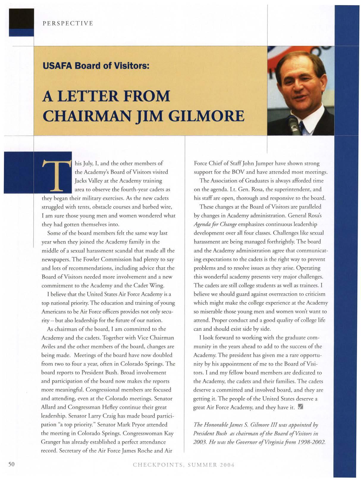 As I complete my first year as board chair, I reflect on the many opportunities I have had to meet and speak directly with graduates and friends of the Academy, to communicate with many of you via e-mail, and to participate in discussions on the graduate forum at www.USAFAToday.com. One of the consistent themes throughout the year has been the need to continue to improve communications and the need to find better ways