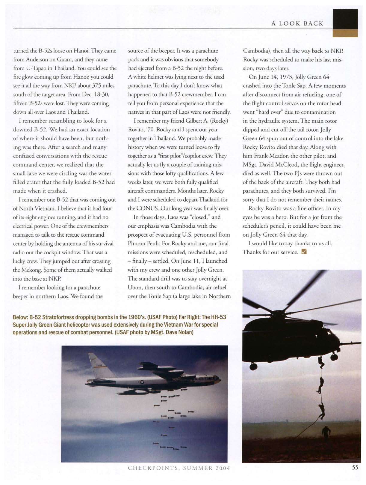 Third, it was most interesting to read the article on Col. Mike Sumida and his reflections on the 1980 Desert One mission. I was a participant myself (aircraft commander, Dragon 1), and the excellent article brought back many bittersweet memories. In addition to Art Schwall, ’69; on Dragon 3, Steve Burke, ’73; was a safety pilot on Republic 3 (one of the EC-130 fueler aircraft) and Jeff Harrison, ’76; was safety pilot on the ill-fated Republic 4. Fortunately, Jeffsurvived, but five airmen (including Tom McMillan,’73) andthree Marines did not.