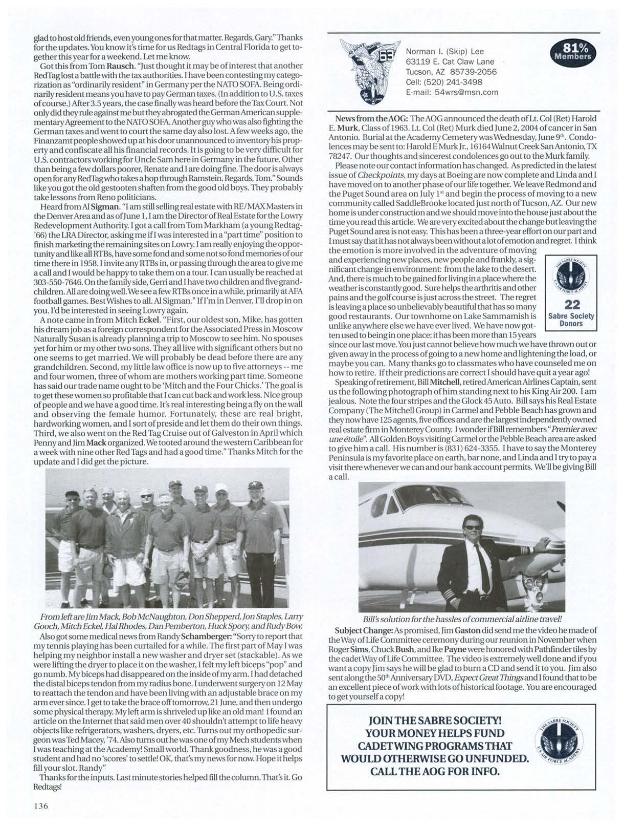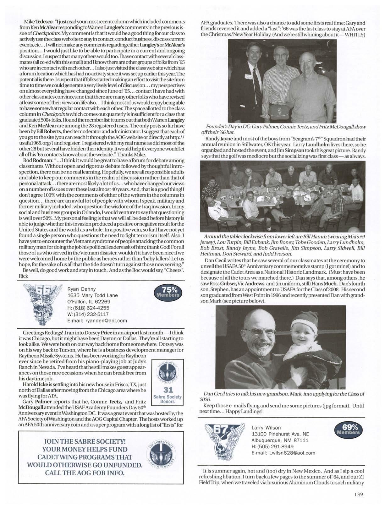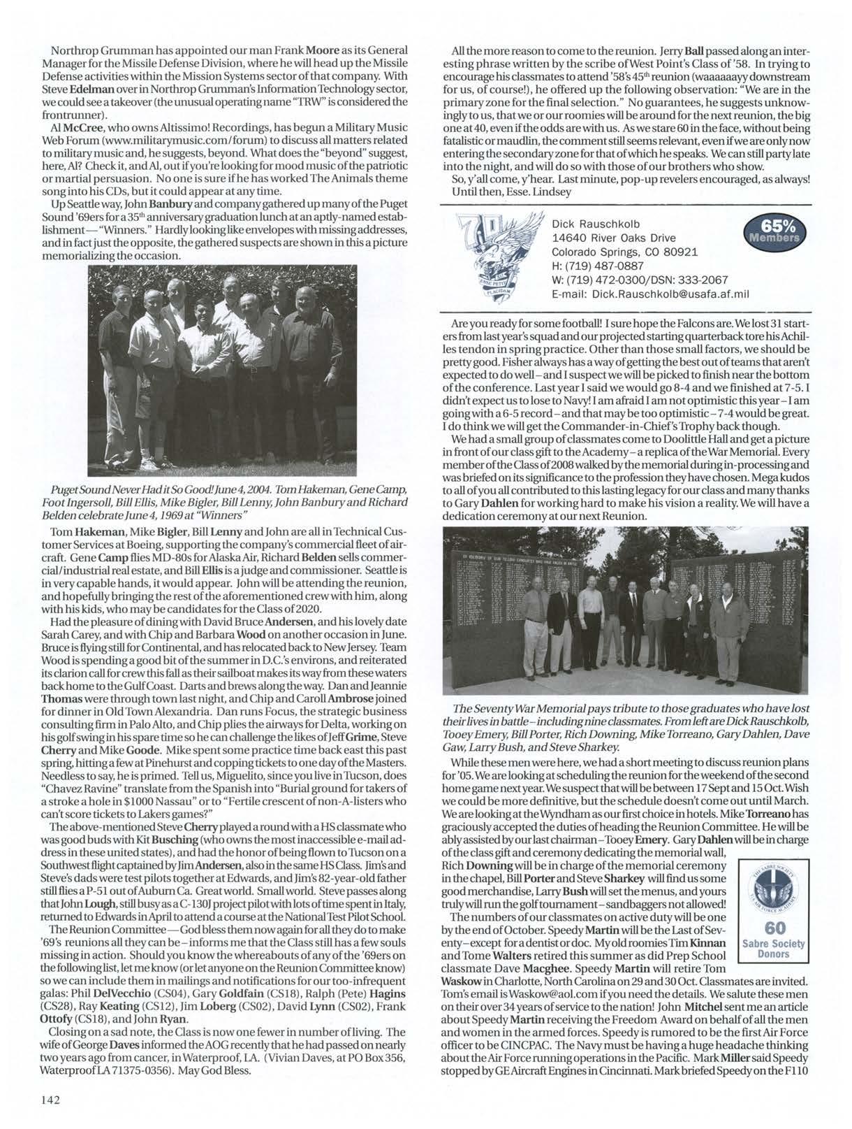 Mark Rosenowisworkingwith our former Superintendent, retired LtGen Oelstrom (’65), at the National SecurityProgram at Harvard. I am working down in D.C. this summerwith the HouseArmed Services Committee butwill be attendingthe Graduate Leadership Conference in lateJulyback at USAFA where a group ofgrads will be reviewing and discussing the newAcademy policies. Ifyou have any comments or would like anything specific to be brought up please send me an email and let me know.