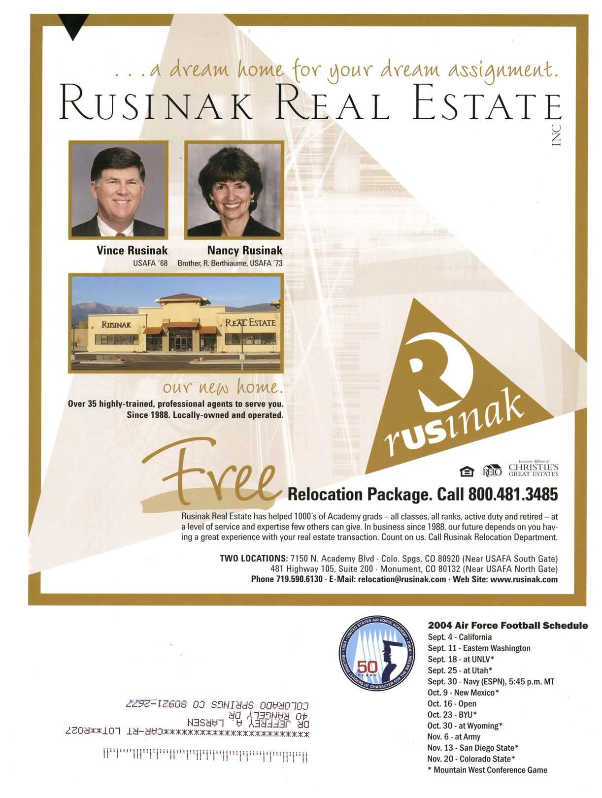 GREAT ESTATES Relocation Package. Call 800.481.3485 Rusinak Real Estate has helped 1000's of Academy grads - all classes, all ranks, active duty and retired - at a level of service and expertise few others can give. In business since 1988, our future depends on you having a great experience with your real estate transaction. Count on us. Call Rusinak Relocation Department. TWO LOCATIONS: 7150 N. Academy Blvd Colo. Spgs, CO 80920 (Near USAFA South Gate) 481 Highway 105, Suite 200 Monument, CO 80132 (Near USAFA North Gate) Phone 719.590.6130 E-Mail: relocation@rusinak.com Web Site: www.rusinak.com <fc!9Z-Ic:hQ3 00 SDNI&dS 00080100 N3s*n % mm % 2004 Air Force Football Schedule Sept. 4 - California