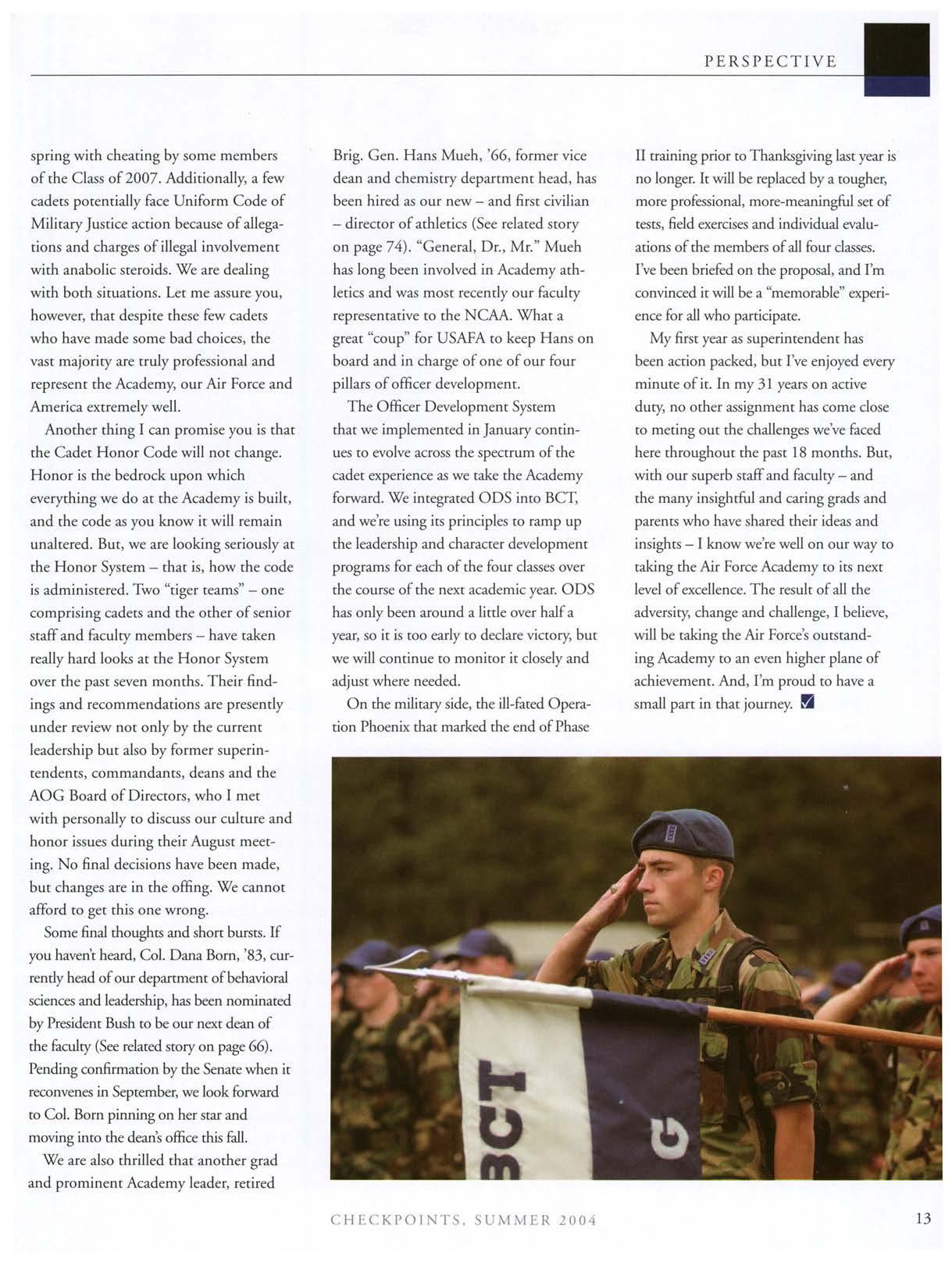 We would like to congratulate and welcome the newest members of the Academy senior leadership team. Col. Dana Born, ’83, has been announced as our new dean and, as of this writing, is awaiting Congressional approval ofher promotion to Brigadier General (see related story on page 74). Dr. Hans Mueh, ’66, has been selected as the new athletic director (see related story on page 66). We couldn’t be more pleased with these choices. Both Dana, who’s been the head of the behavioral sciences and leadership department, and Hans, who’s been the vice dean and head of the chemistry department as well as the Academy’s faculty representative to the NCAA, are intensely aware of the challenges facing the Academy and are committed to their resolution. We wish Dana and her husband Tim and Hans and his wife Sally all the best as they take on these important responsibilities.