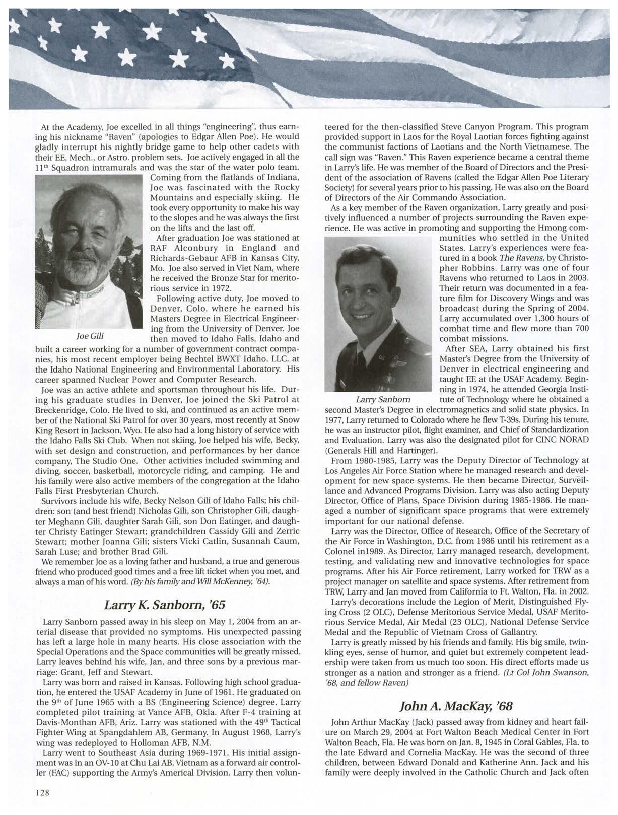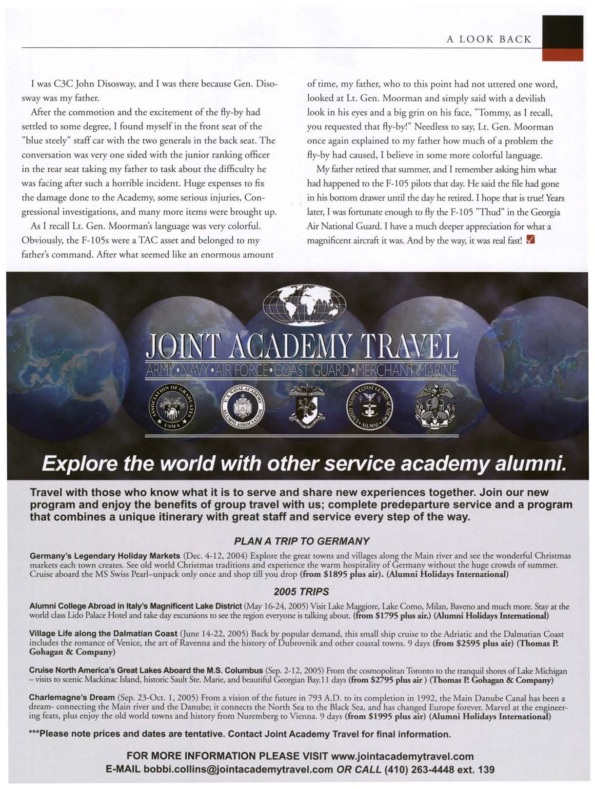 Finally, kudos to 2nd Lt. Chris Ayoub, ’03, recognized as the 2003 Cadet of the Year. As a more recent member of “The Long Blue Line,” he is now attending UPT at Vance AFB, Okla. He just happens to be a classmate and friend of my youngest son, James, a pilot trainee from the 711th Special Ops Sq (USAF Reserves). It’s great to know that our Air Force of today and the future is in good hands.