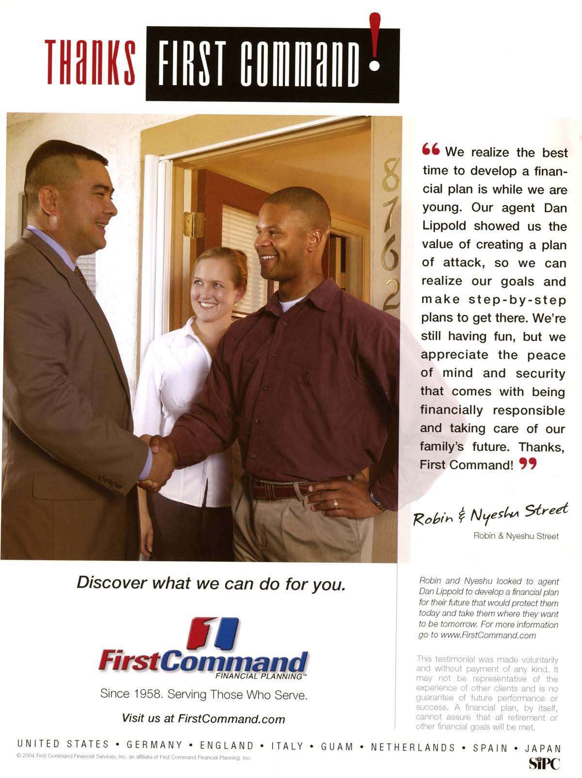 66 We realize the best time to develop a financial plan is while we are young. Our agent Dan Lippold showed us the value of creating a plan of attack, so we can realize our goals and make step-by-step plans to get there. We’re still having fun, but we appreciate the peace of mind and security that comes with being financially responsible and taking care of our family’s future. Thanks, First Command! 99 KoH* t NyesU Street Robin & Nyeshu Street Discover what we can do for you. Ji FirstCommand FINANCIAL PLANNING Since 1958. Serving Those Who Serve. Visit us at FirstCommand.com Robin and Nyeshu looked to agent Dan Lippold to develop a financial plan for their future that wouldprotect them today and take them where they want to be tomorrow. For more information go to www.FirstCommand.com This testimonial was made voluntarily and without payment of any kind. It may not be representative of the experience of other clients and is no guarantee of future performance or success. A financial plan, by itself, cannot assure that all retirement or other financial goals will be met. UNITED STATES GERMANY ENGLAND ITALY GUAM © 2004 First Command Financial Services, Inc. an affiliate of First Command Financial Planning, Inc. NETHERLANDS SPAIN JAPAN SIPC