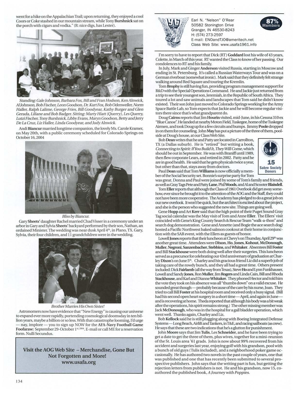 Jen (Trevino) and GregBailey are at Charleston; Gregis flyingC- 17s andJenis stilldoingweather over at Shawso theylive inthelittle town ofSantee and commute to work each day. Jason Goldberg is deployedduringhis firstwedding anniversary, butjob satisfaction makesthetimegobyfaster. He recentlysawBill Dains and his girlfriendAngelainAtlanta. Here’s a pictureoftheGoldbergweddinglast
