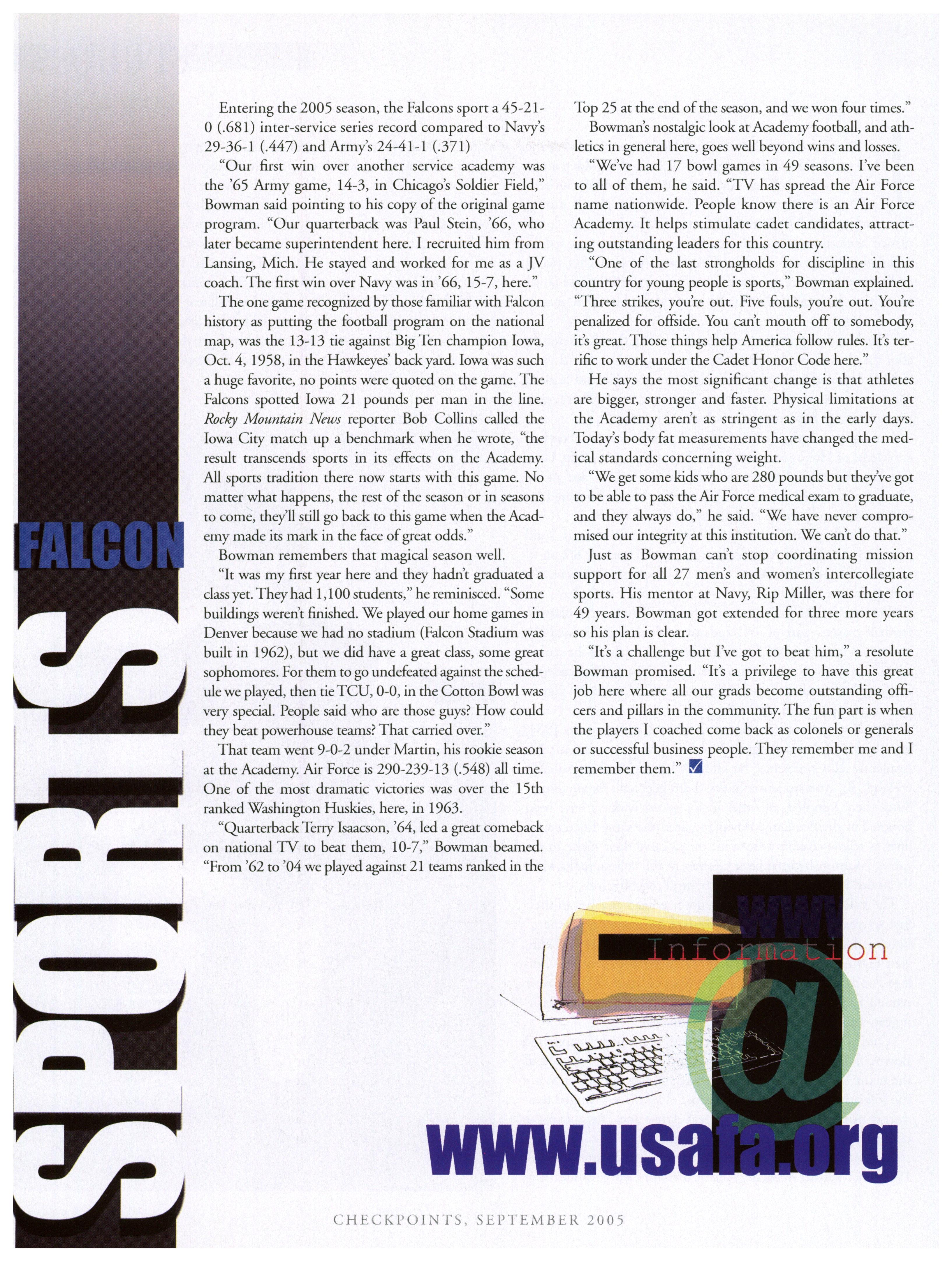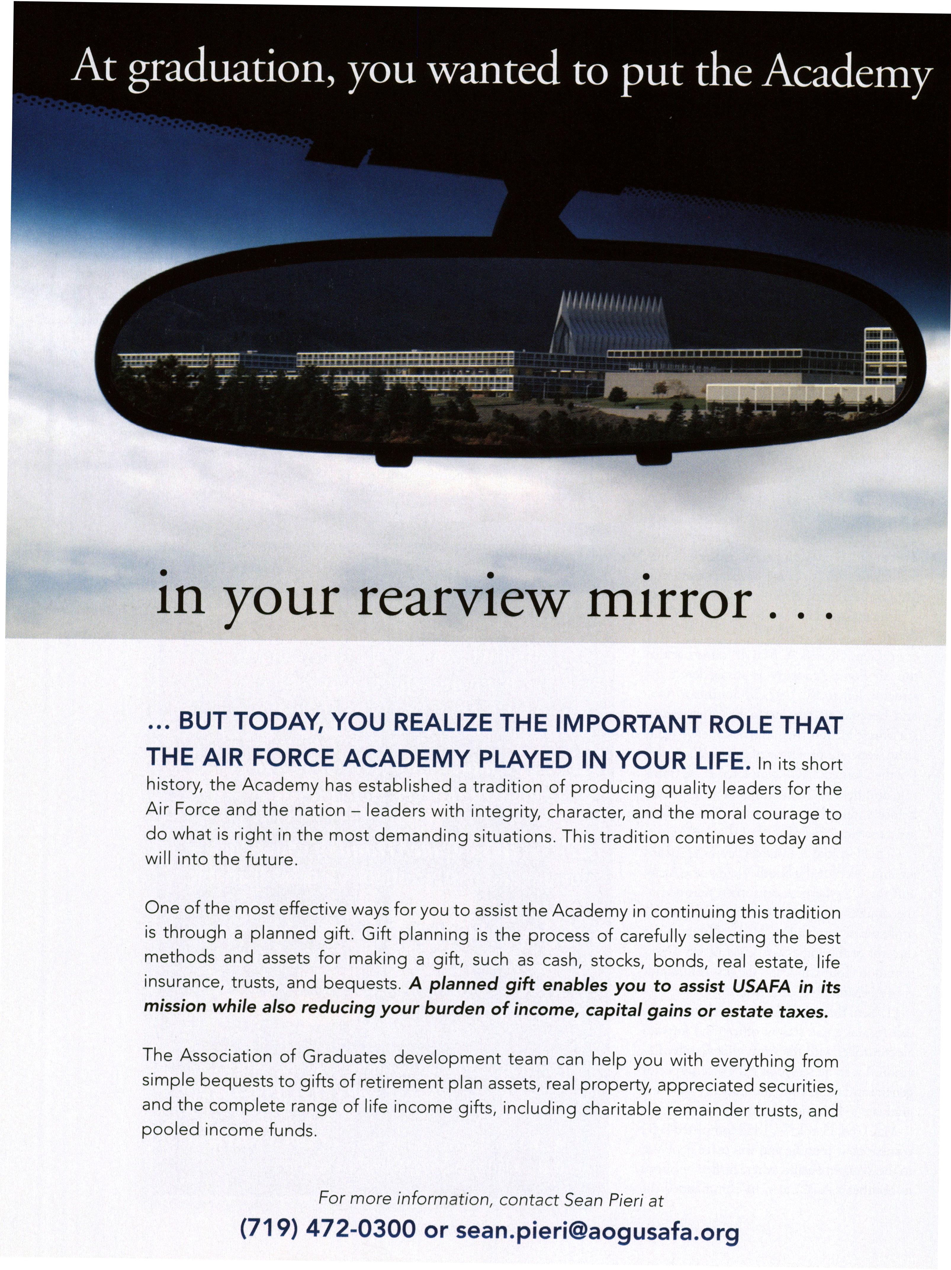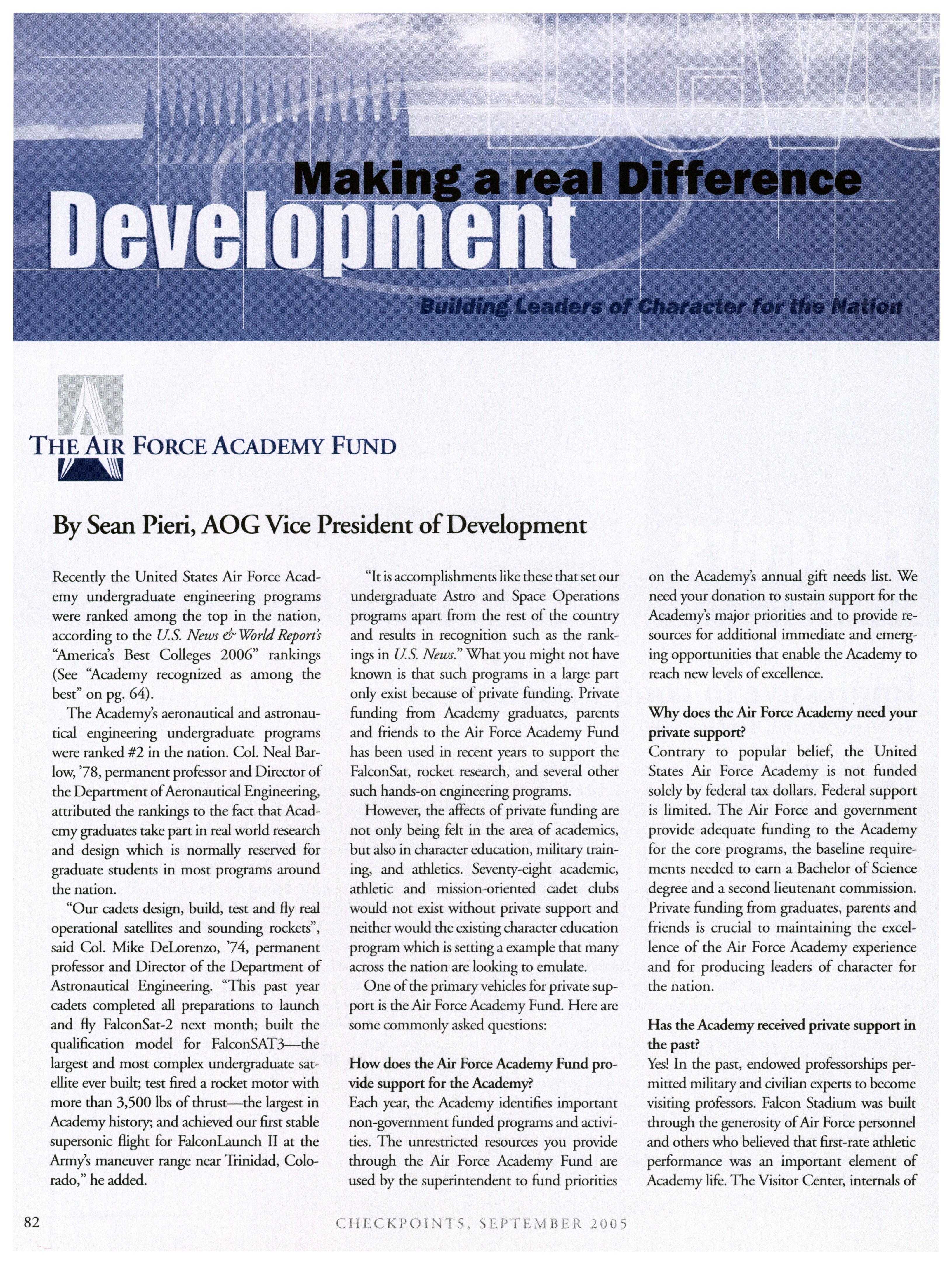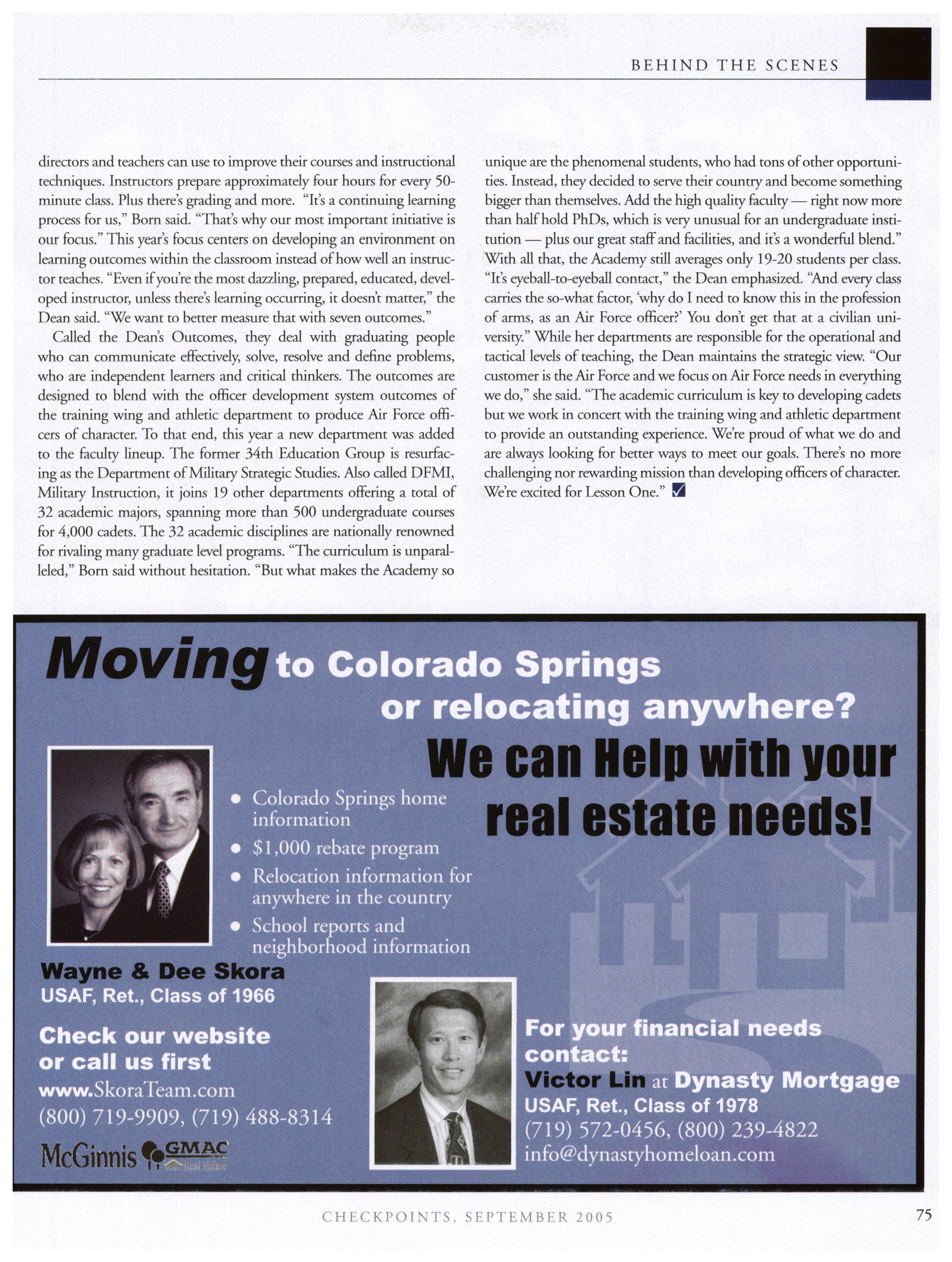 Opinions expressed in this magazine are those of the authors. They do not necessarily reflect the opinions, policy or attitude ofthe Association ofGraduates, its officers or the editorial staff. The appearance ofadvertisements in this publication does not constitute an endorsement by theAssociation ofGraduates ofthe products or services advertised. Copyright, Association ofGraduates of the U.S. Air Force Academy, September 2005.