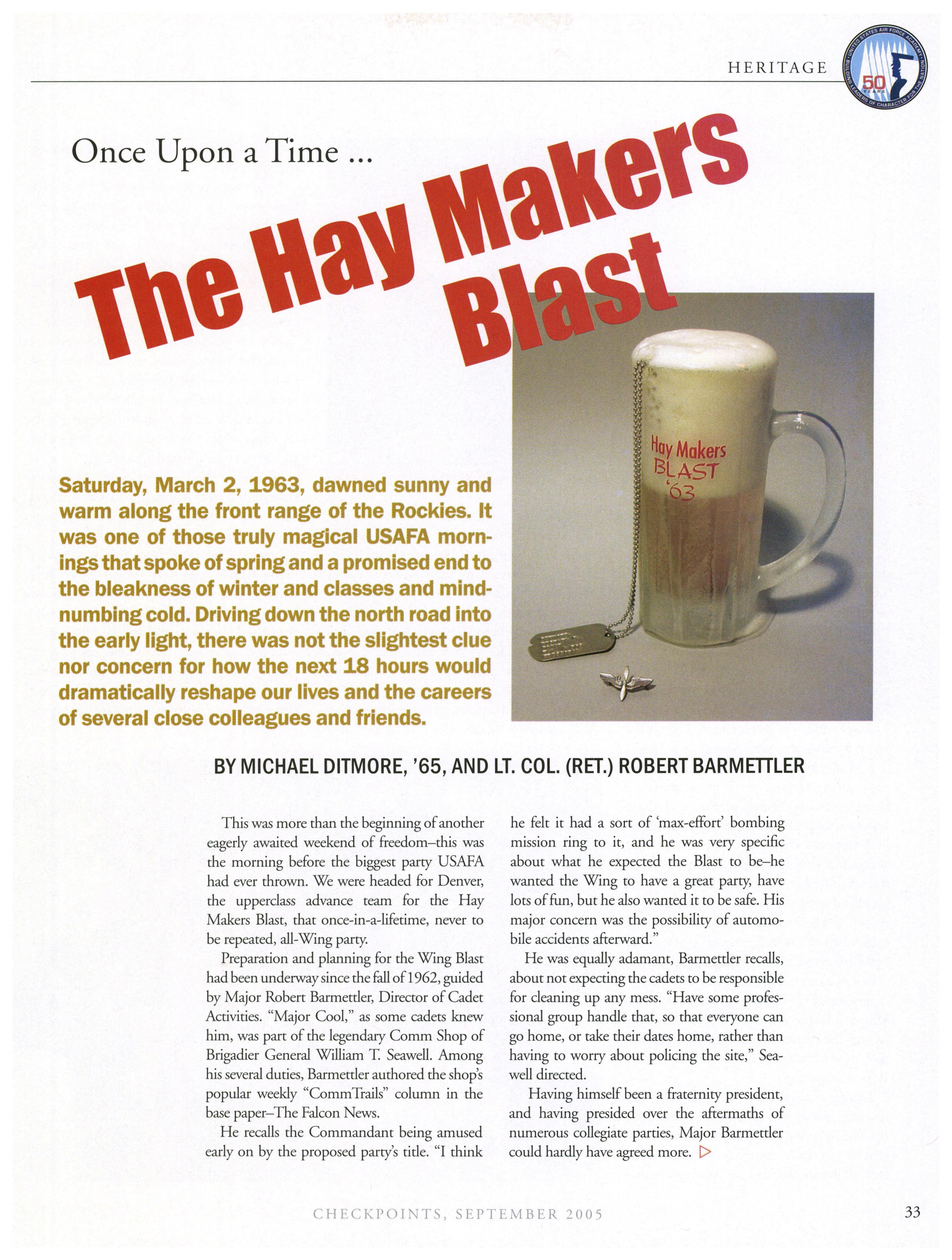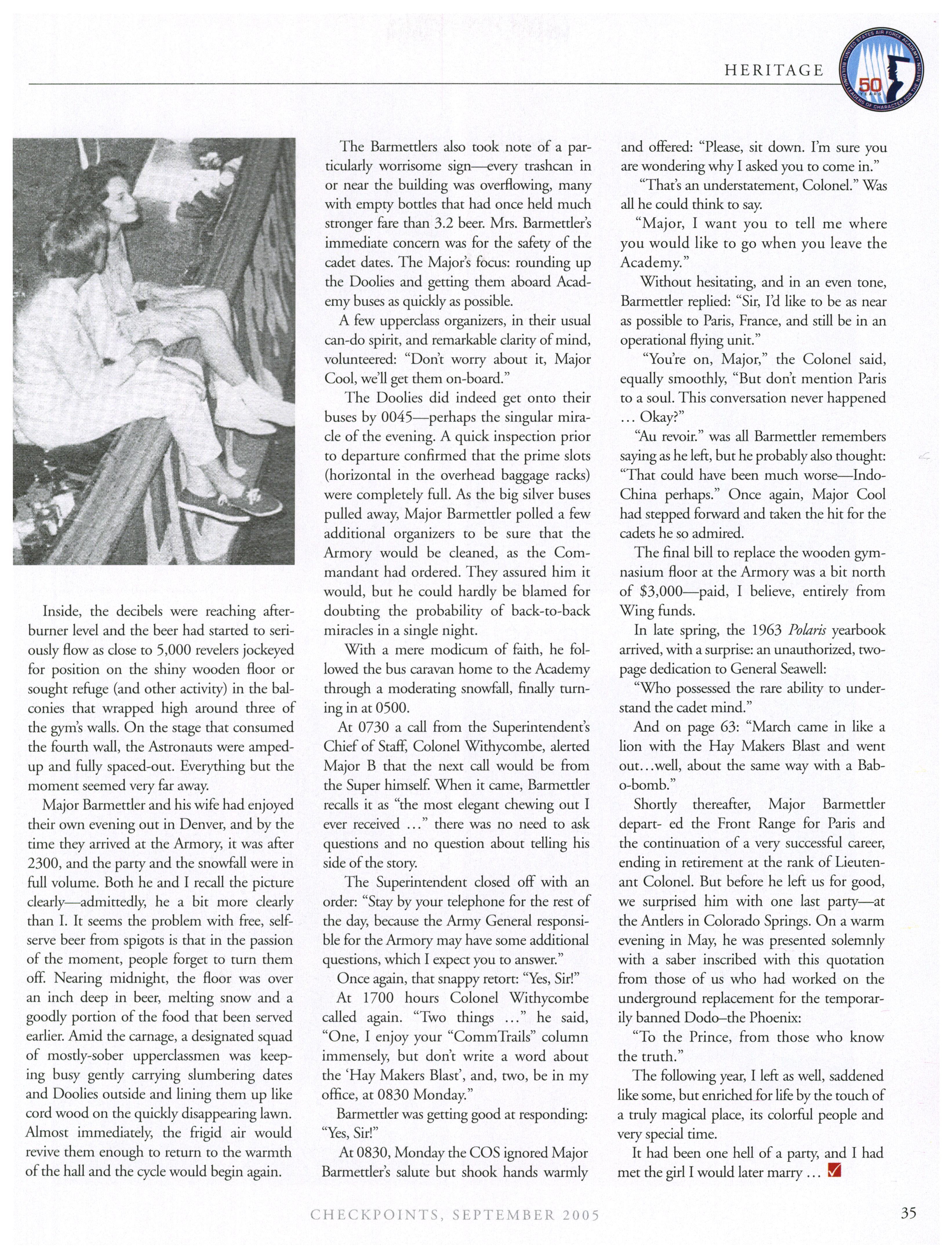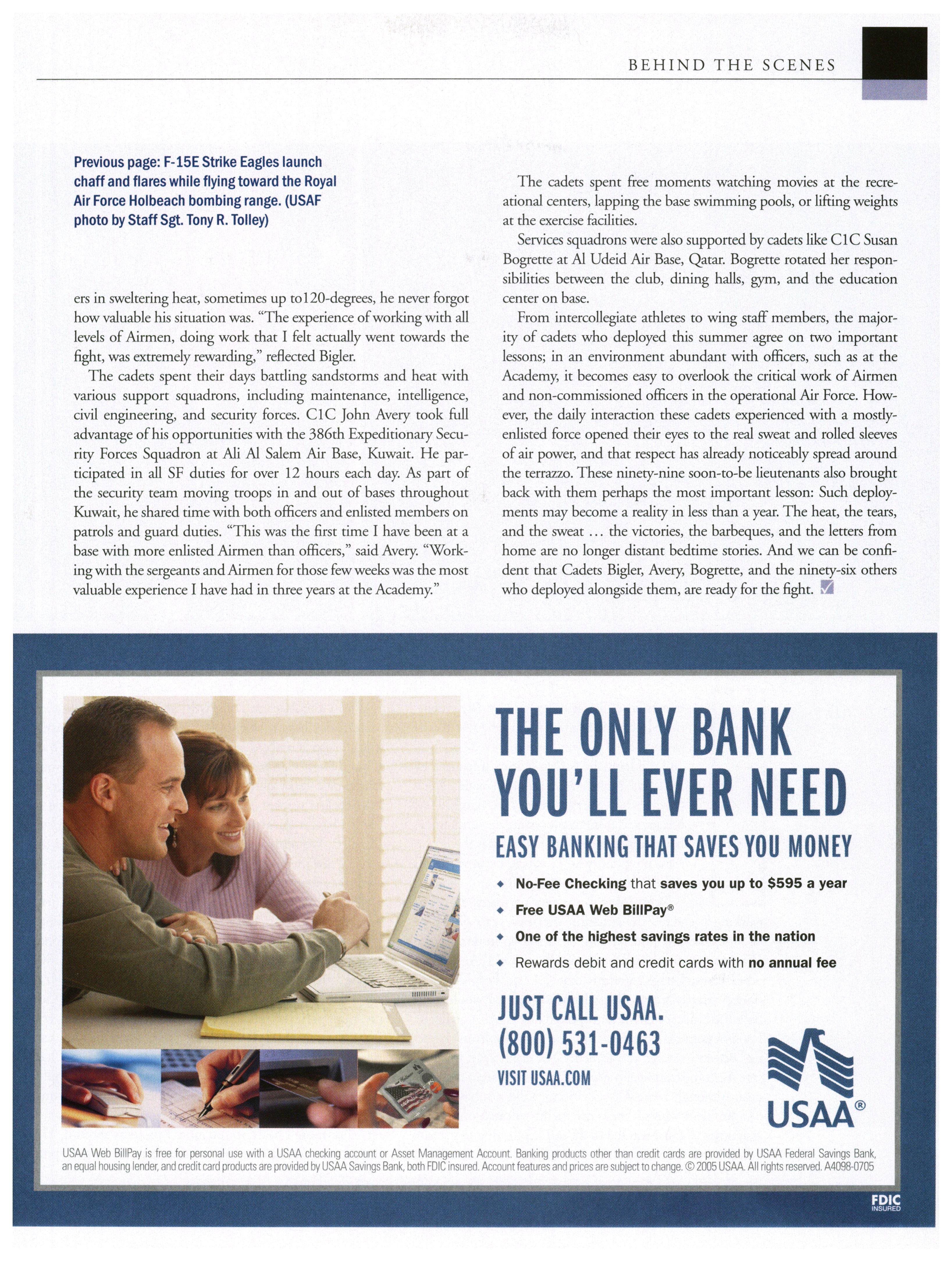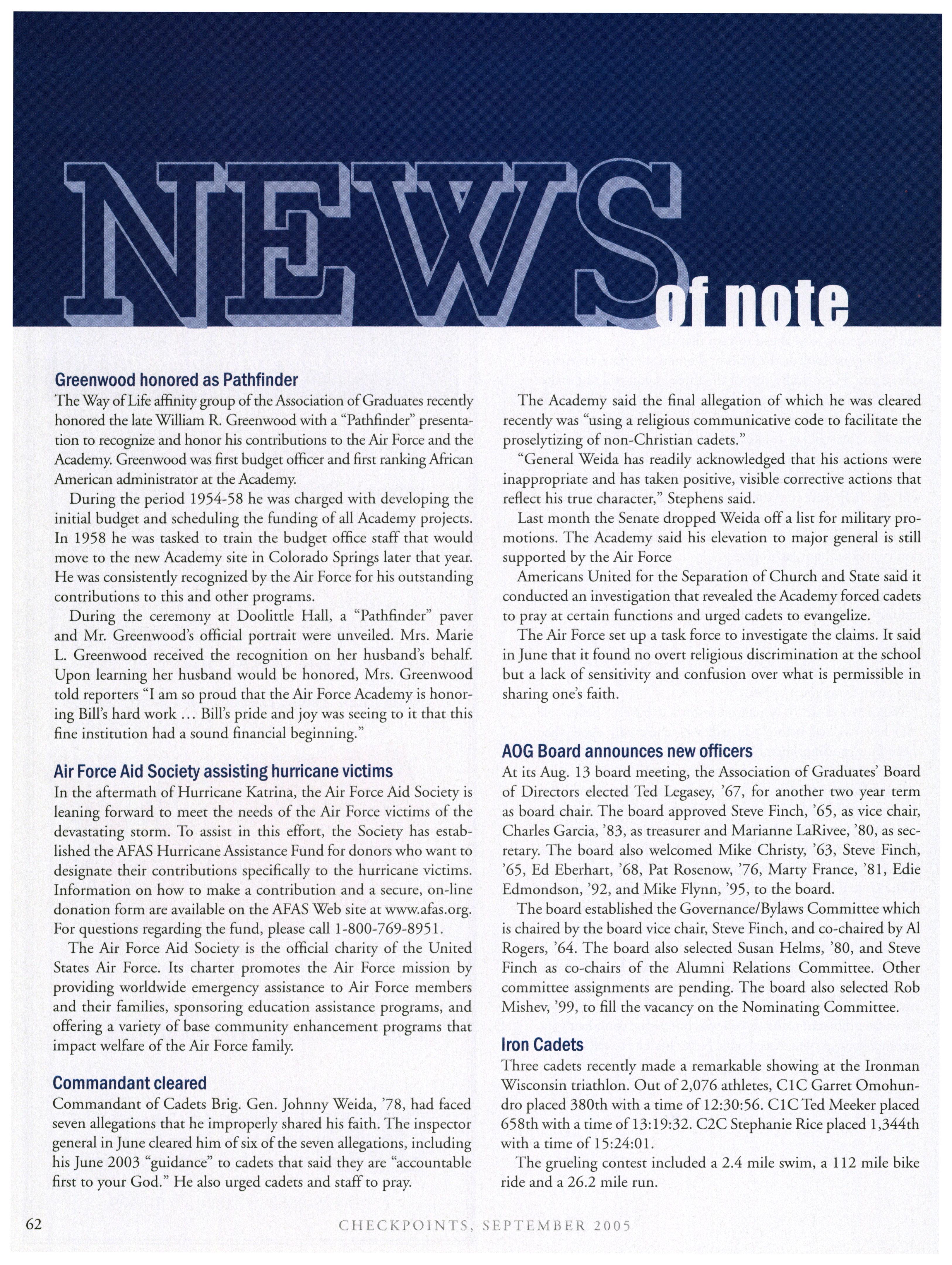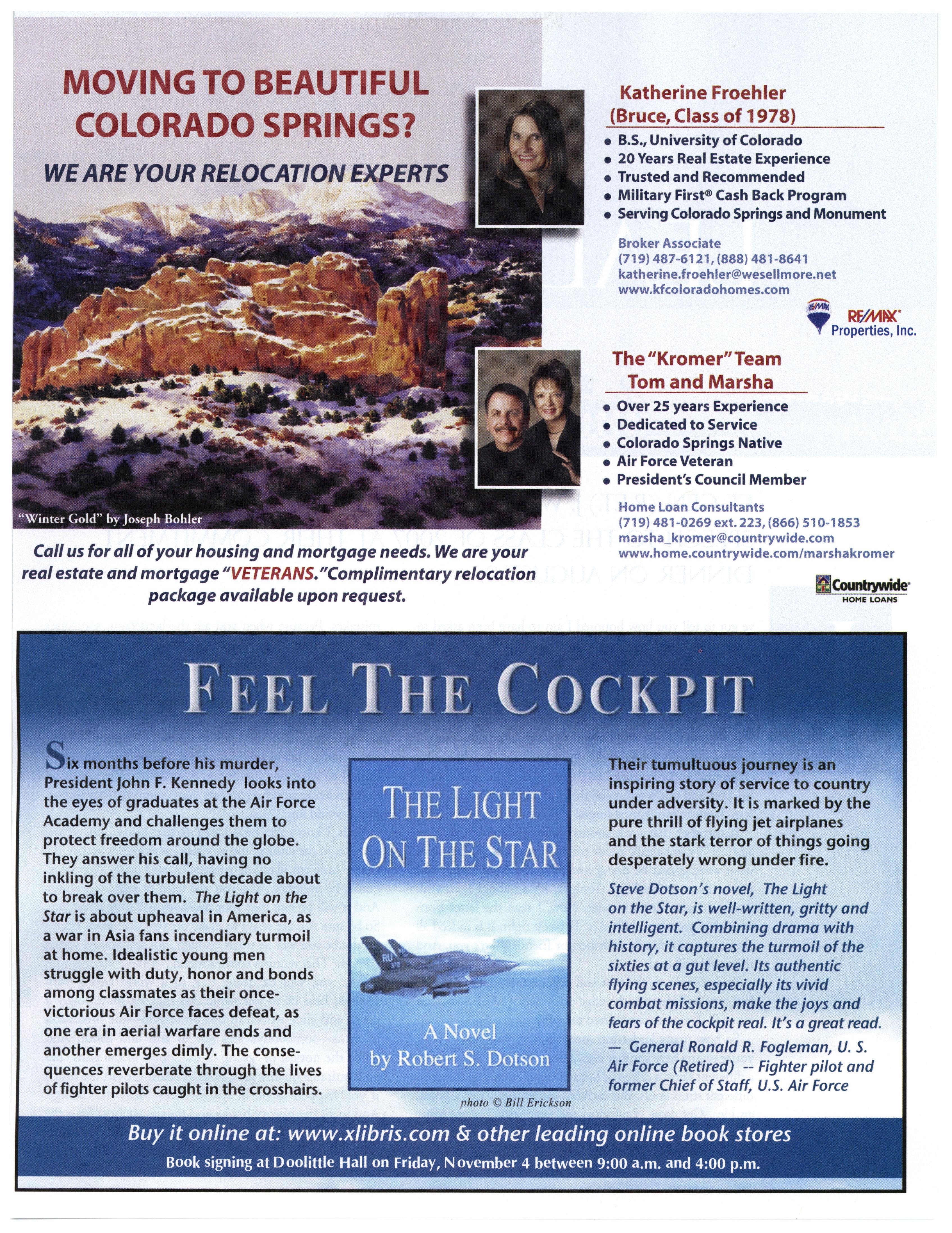 Opinions expressed in this magazine are those of the authors. They do not necessarily reflect the opinions, policy or attitude ofthe Association ofGraduates, its officers or the editorial staff. The appearance ofadvertisements in this publication does not constitute an endorsement by theAssociation ofGraduates ofthe products or services advertised. Copyright, Association ofGraduates of the U.S. Air Force Academy, September 2005.