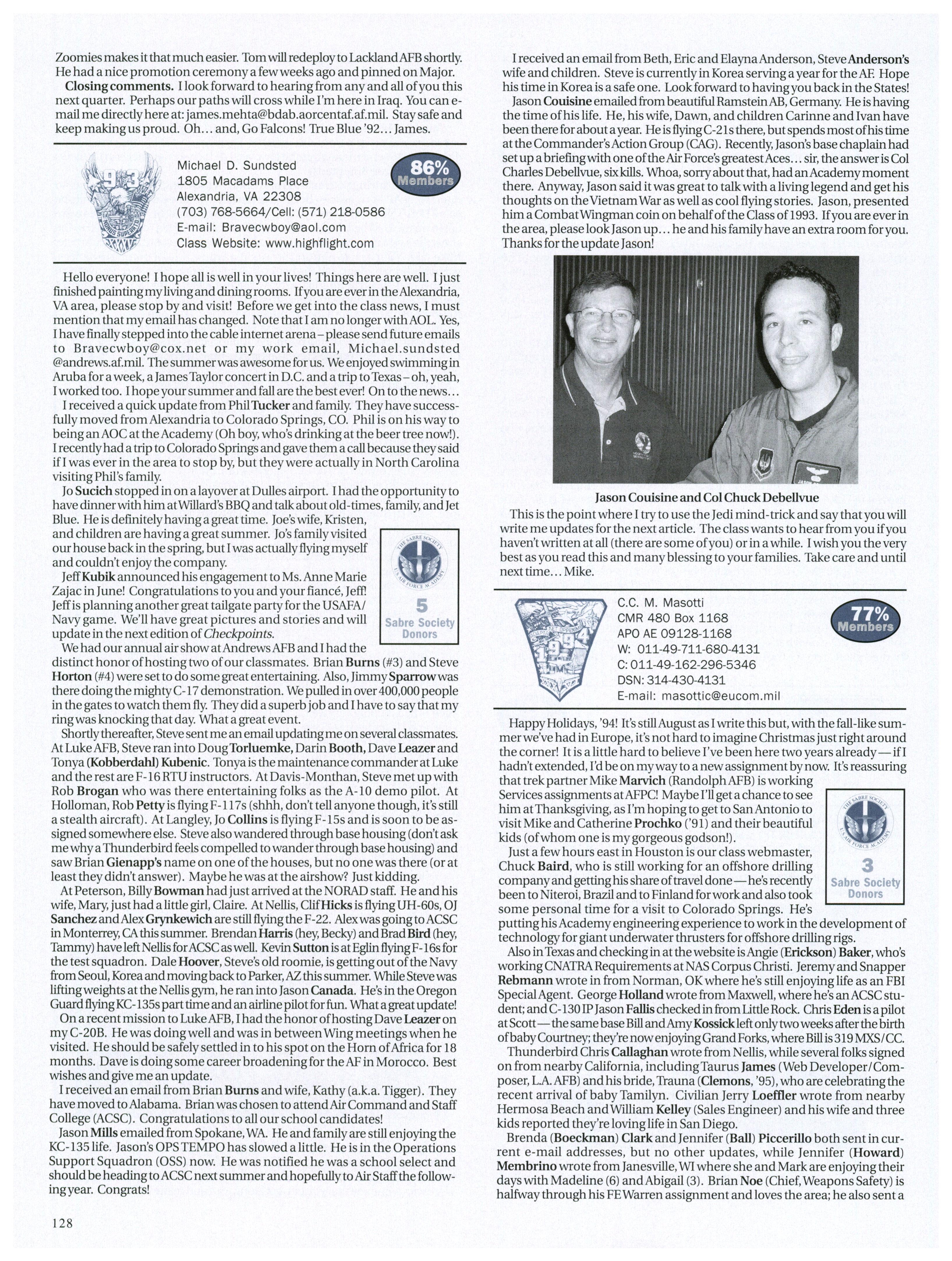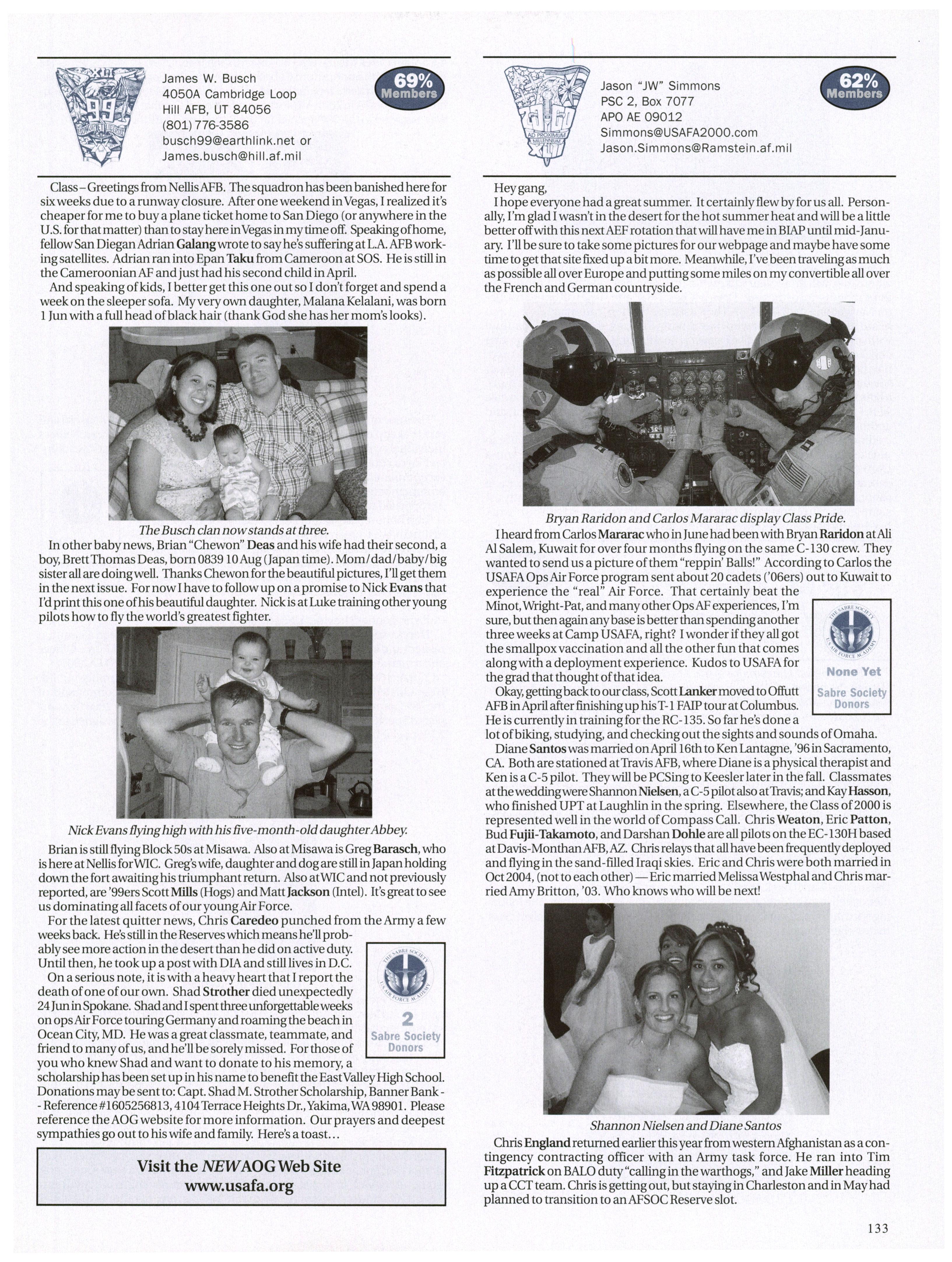 I didn’t hear from as manyfolks this time and got a lot ofrejected emails, so please shoot me an update for your email address. I can give you a USAFA2000.com address with more space than the popular ones and POP3 access ifyou would like a class pride address for family and friends. Keep sendingpictures and updating us on your experiences, family, and duty assignments. Until next time, continue to represent the class with our “work hard-partyhard, always excel” attitude. Jason