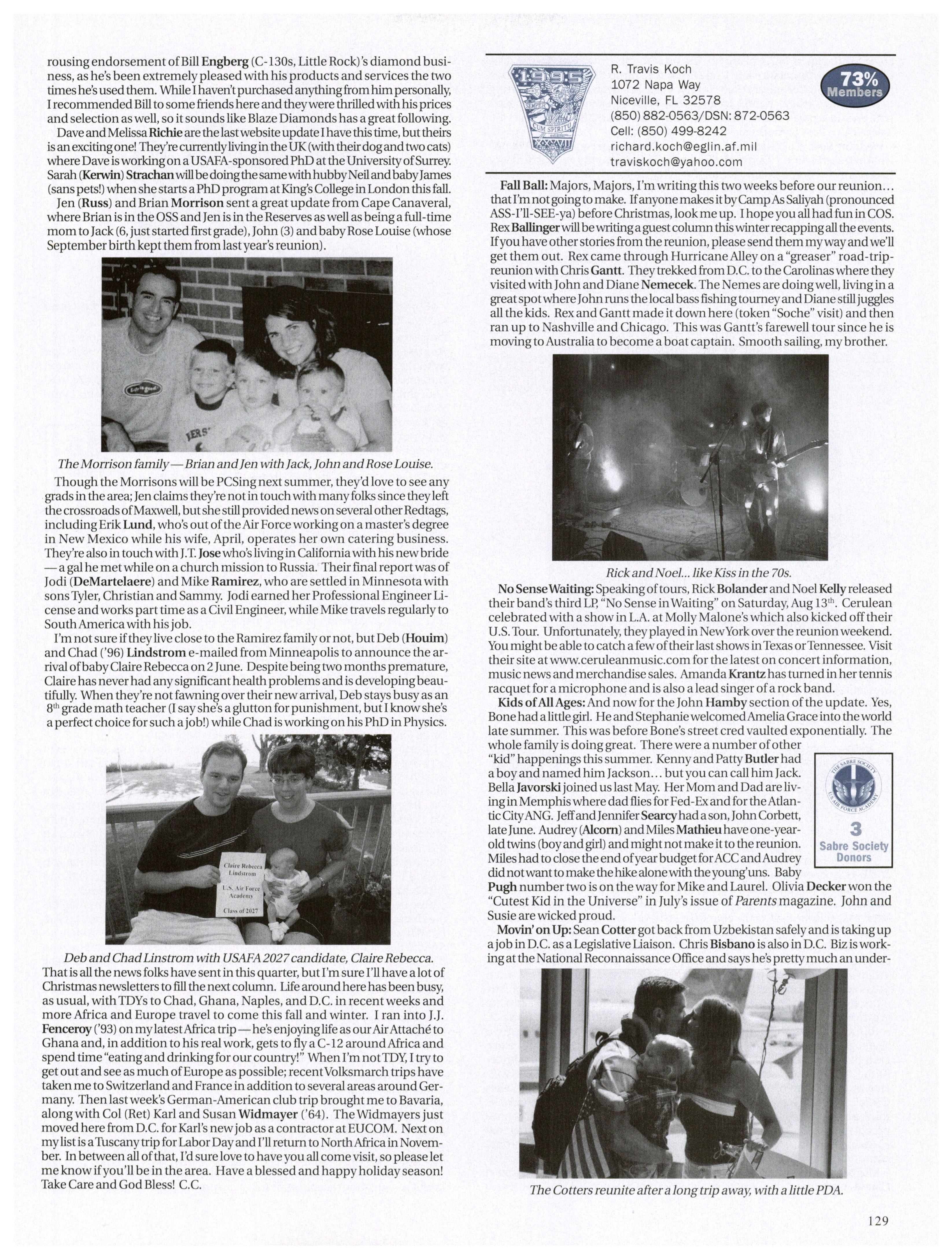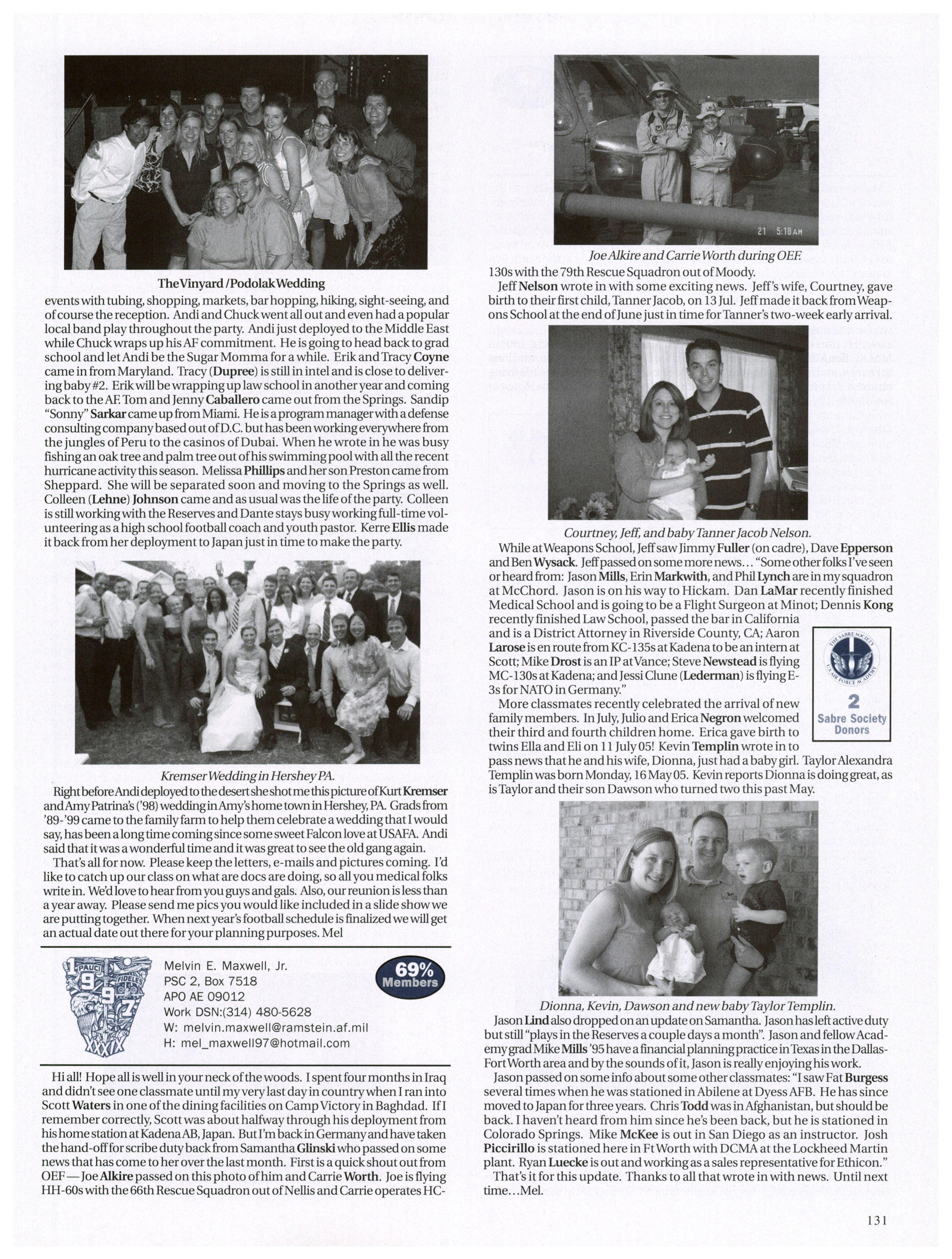 Thankyouforthe submissions and updates. Holly (Hermann) Kinseywrote: “The pastyearalmosthas been crazy. RandyKinsey (2003) and I were married inJuly04, so I changed names from Hermann to Kinsey. In October I deployed to Bagram,Afghanistan where I worked in theJoint Logistics Center with the Army... definitely an eye opener. I finallyreturned home at the end ofJanuary. Since then I’ve taken over a flight that has been keeping me crazybusy!”