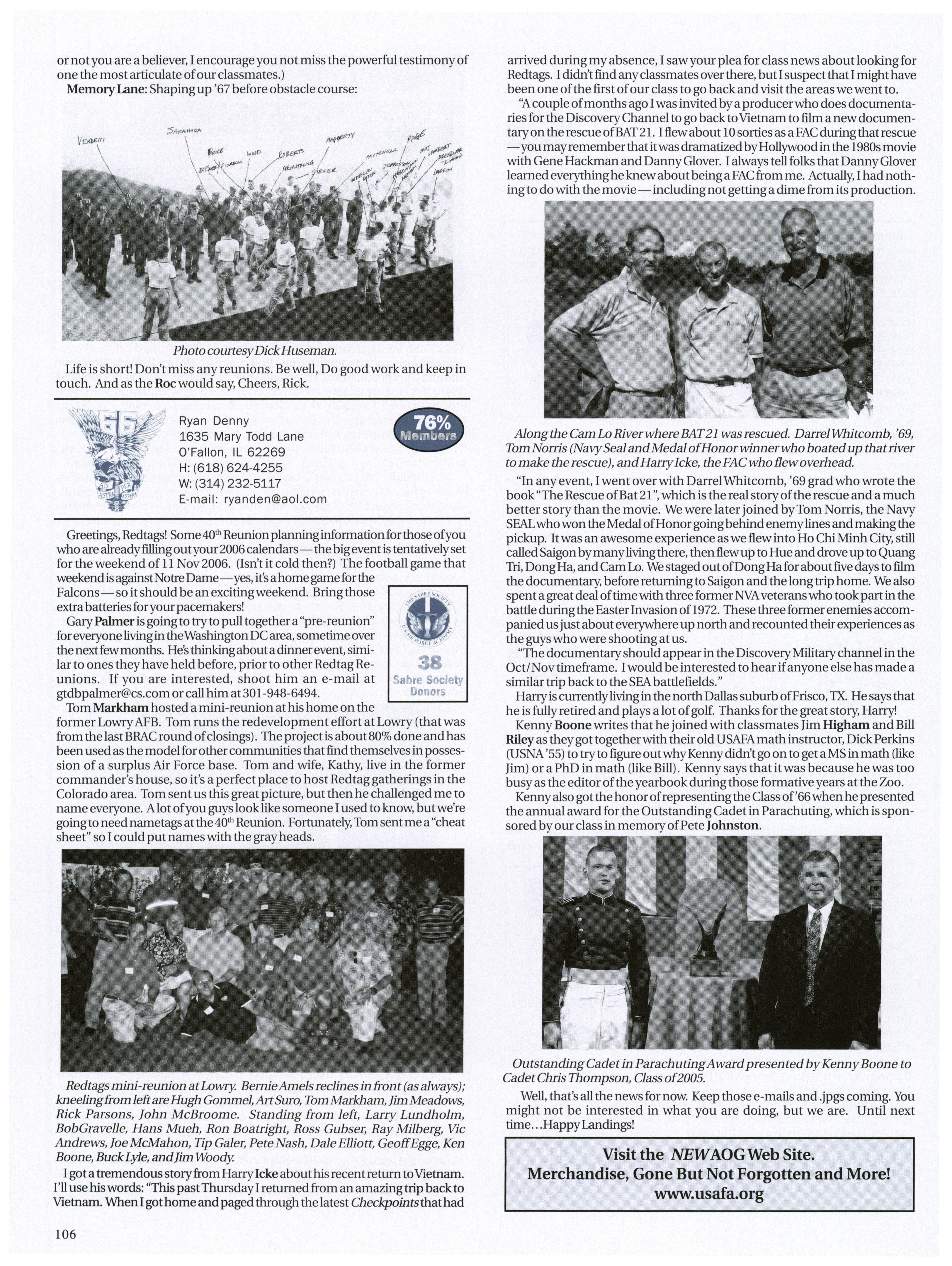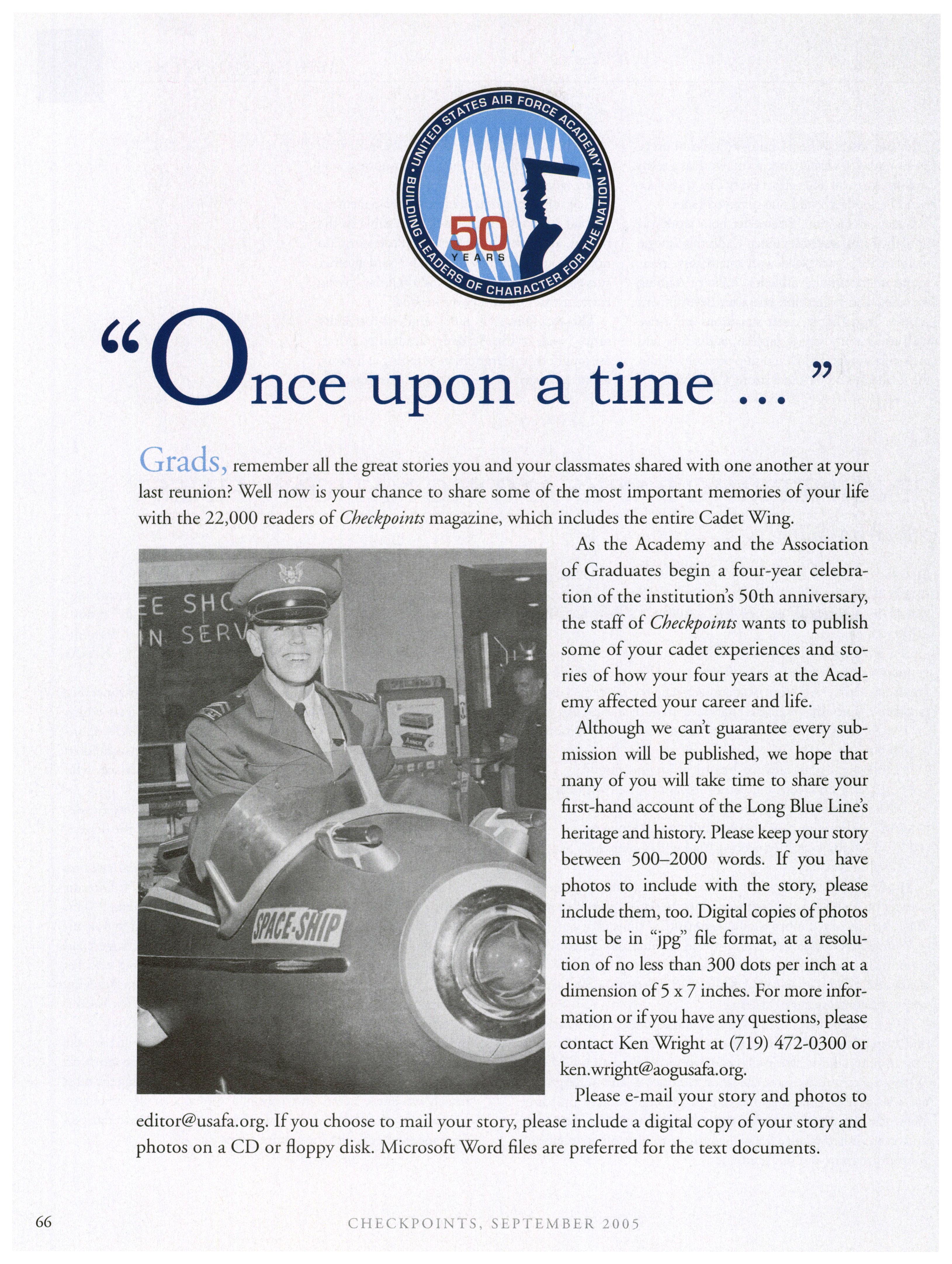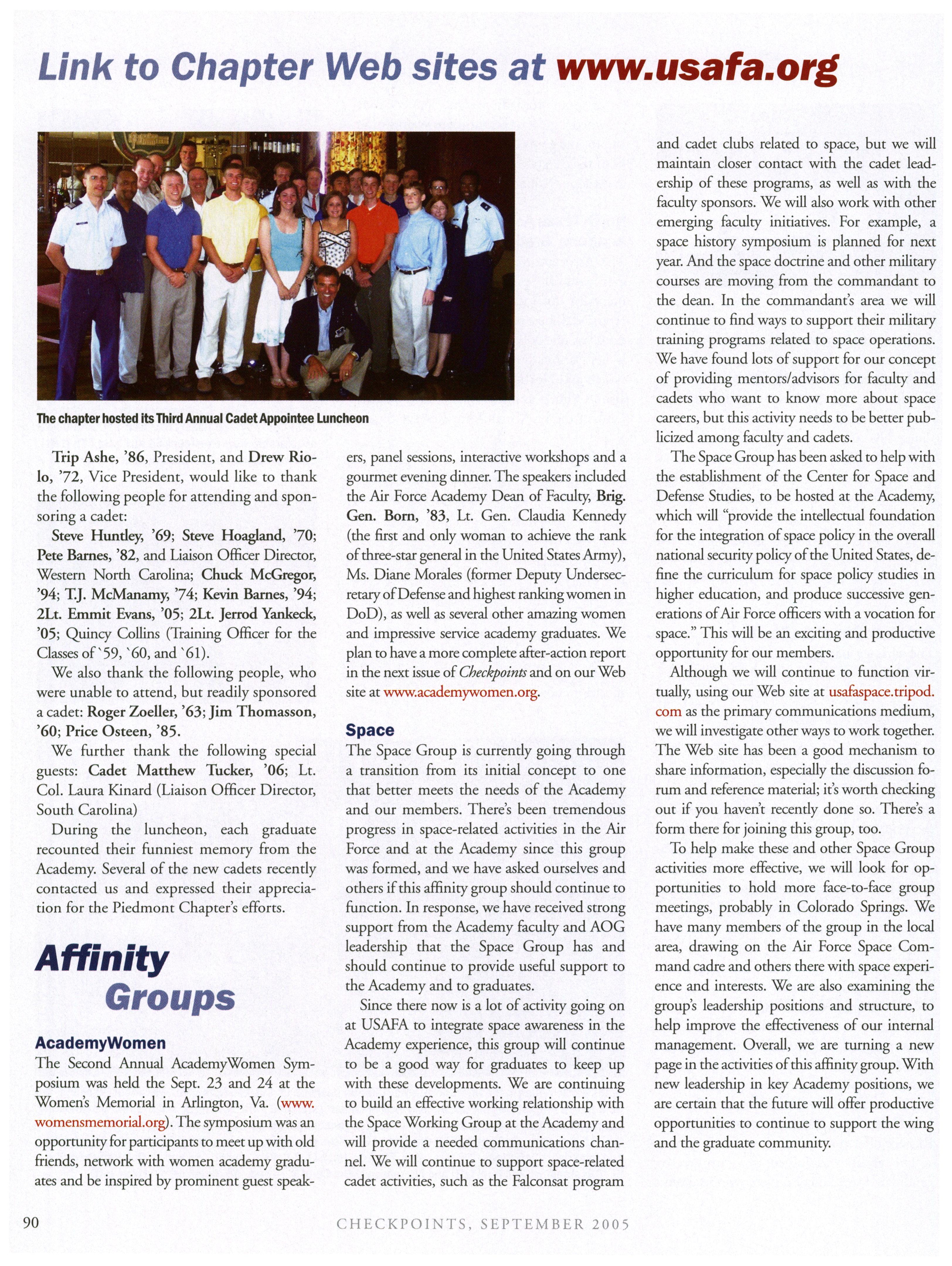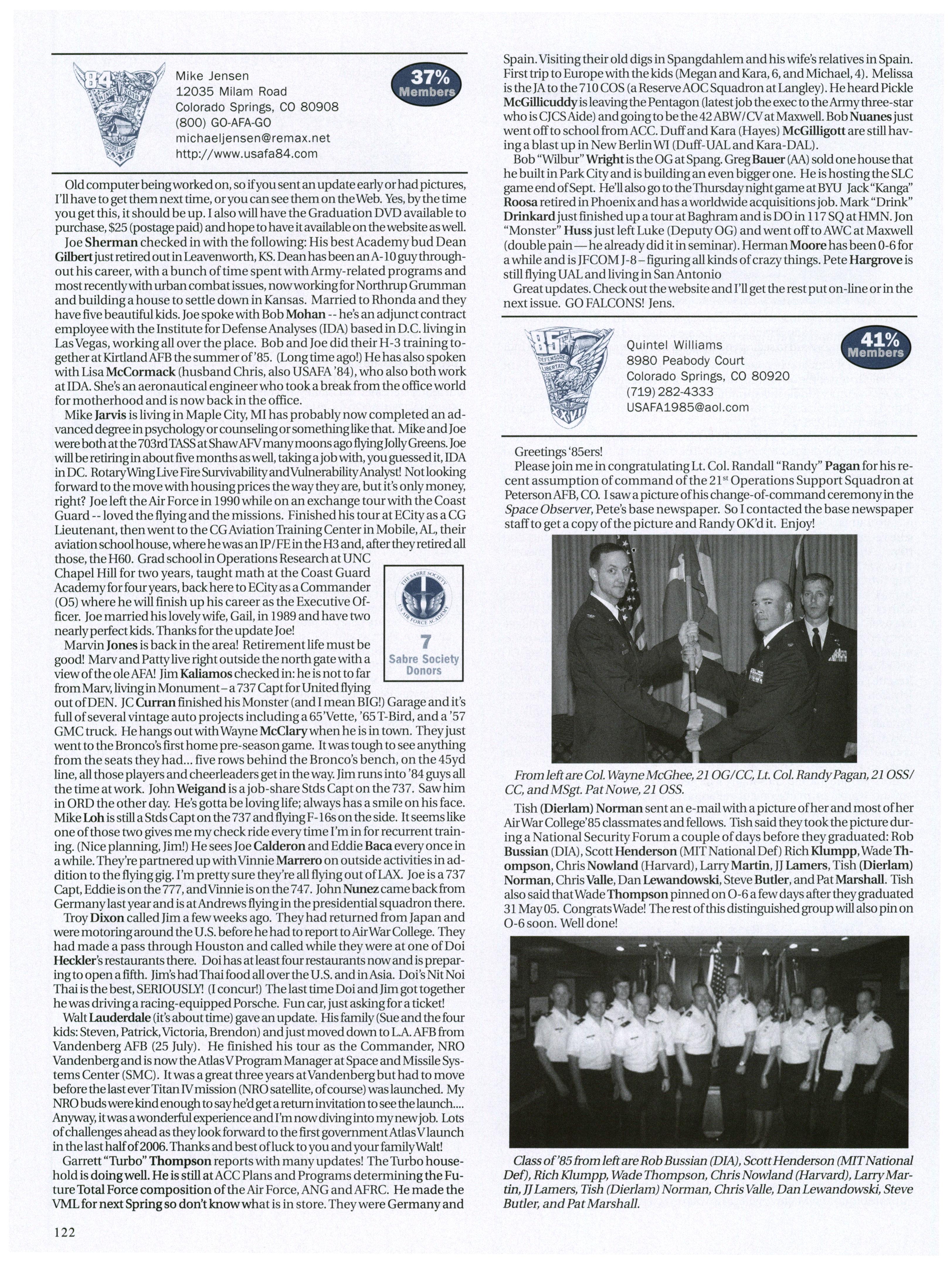 Please let us know ifyou’d like to submit any news (personal/base/unit/ class) or shout-outs for next month’s issue. Also, next timewe’re featuring a brief“memorycorner,” so please share anyUSAFA memories or experiences with fellowclassmates since graduation that have madeyou laugh or helped you through this pastyear somehow. Thanks!