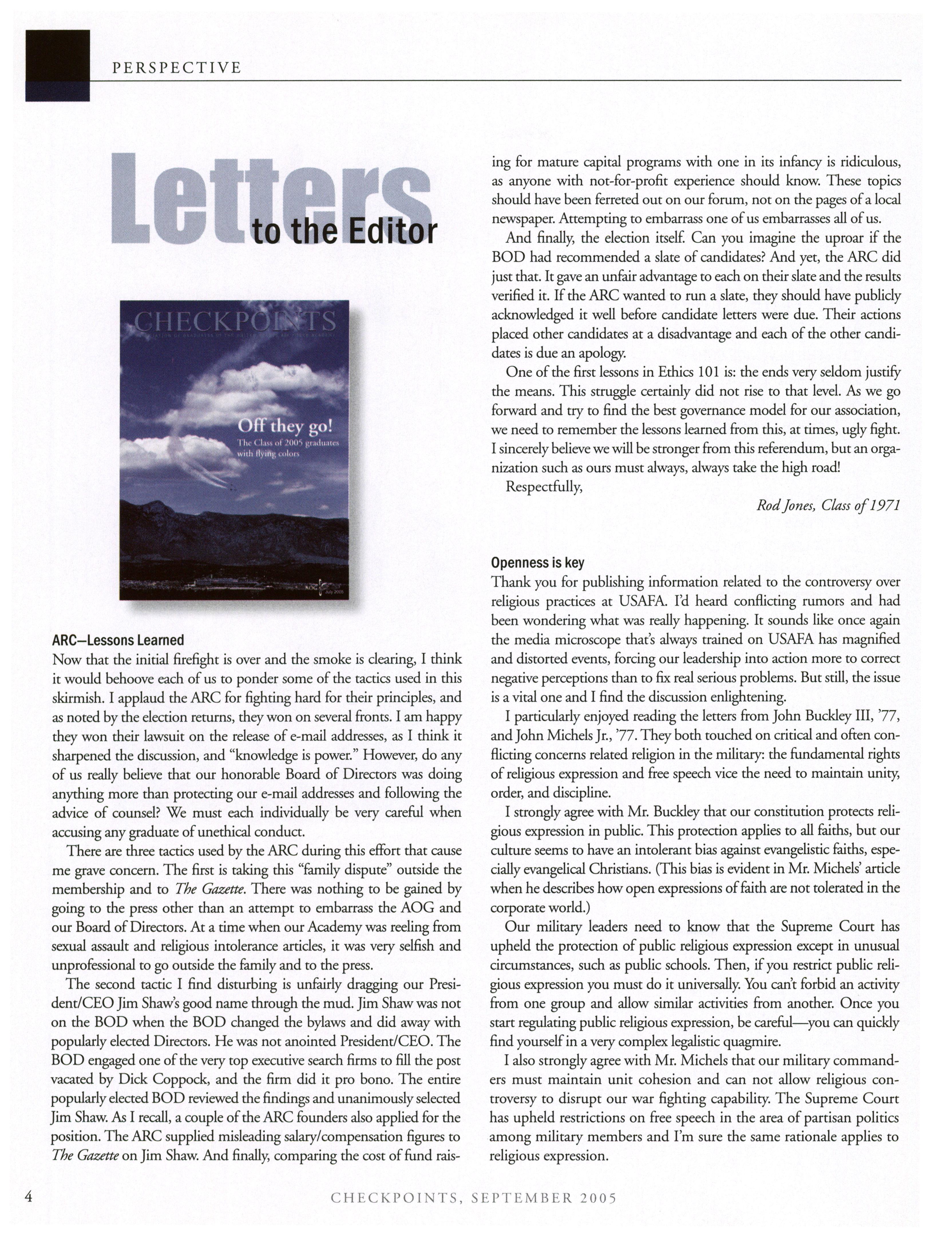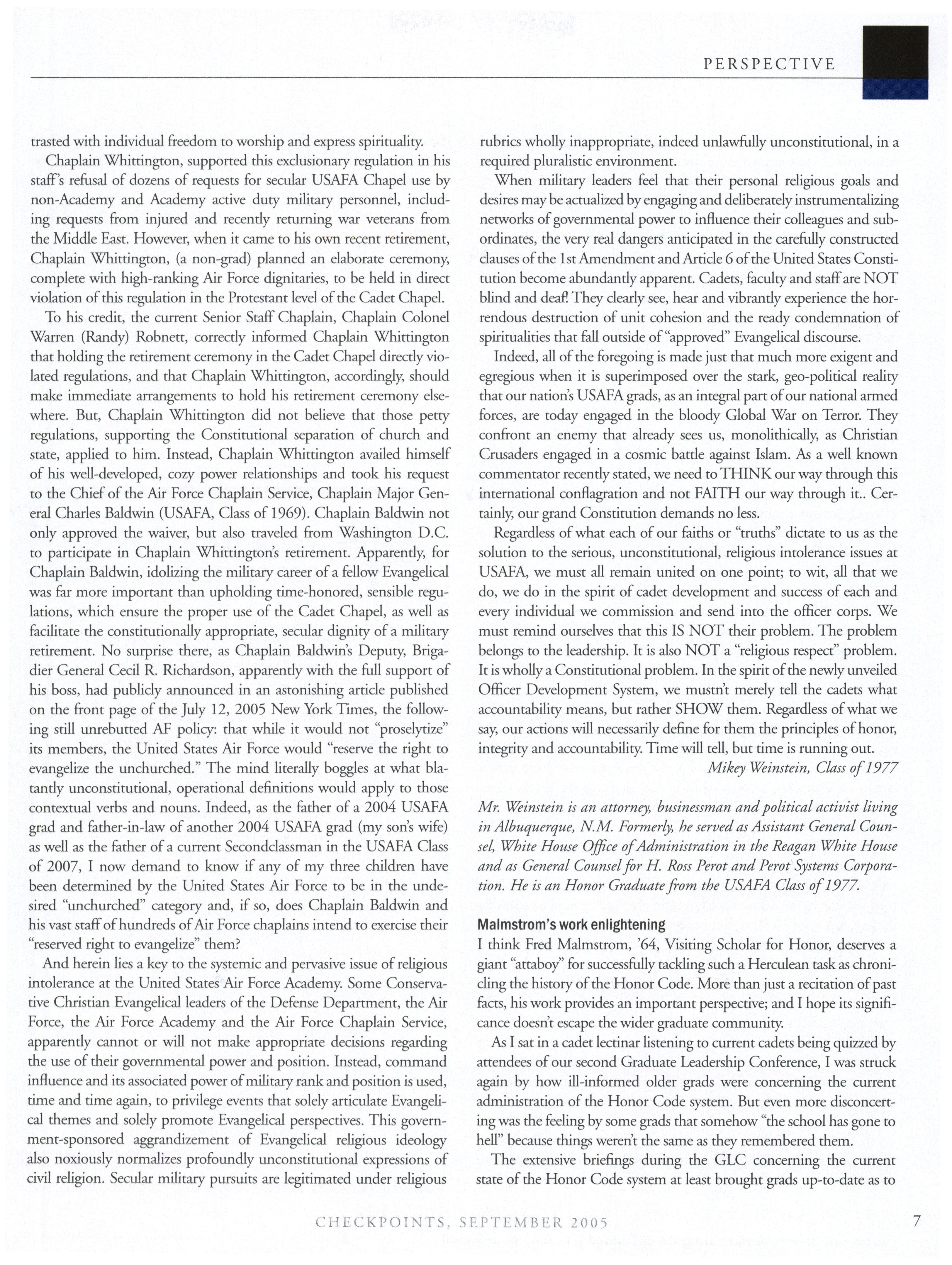 Despite the darkness that sometimes shadows our beloved institution, mere reflection on its bedrock fundamentals of“honor” and “integrity” tacidy reassures every USAFA grad that the issue pertaining to religious intolerance, like others that have come before it, will be resolved in an appropriate manner. However, Heather Beers article in the last issue of Checkpoints does not provide me the same reassurance and it should give each of us pause. In the article, she reports on the religious intolerance issue at USAEA and what the leadership has done to confront the issue. As many ofyou know, I have been a leading spokesperson/activist for reform on this issue, but nothing has surprised (and saddened) me more than how the issue was presented to the USAFA graduate community in her article. As a matter ofhonor and integrity, I wish to convey irrefutable facts that tell the “rest of the story.” Once you have read this rebuttal, you can judge for yourself what is really going on inside the Zoo with regards to religious intolerance at USAFA.