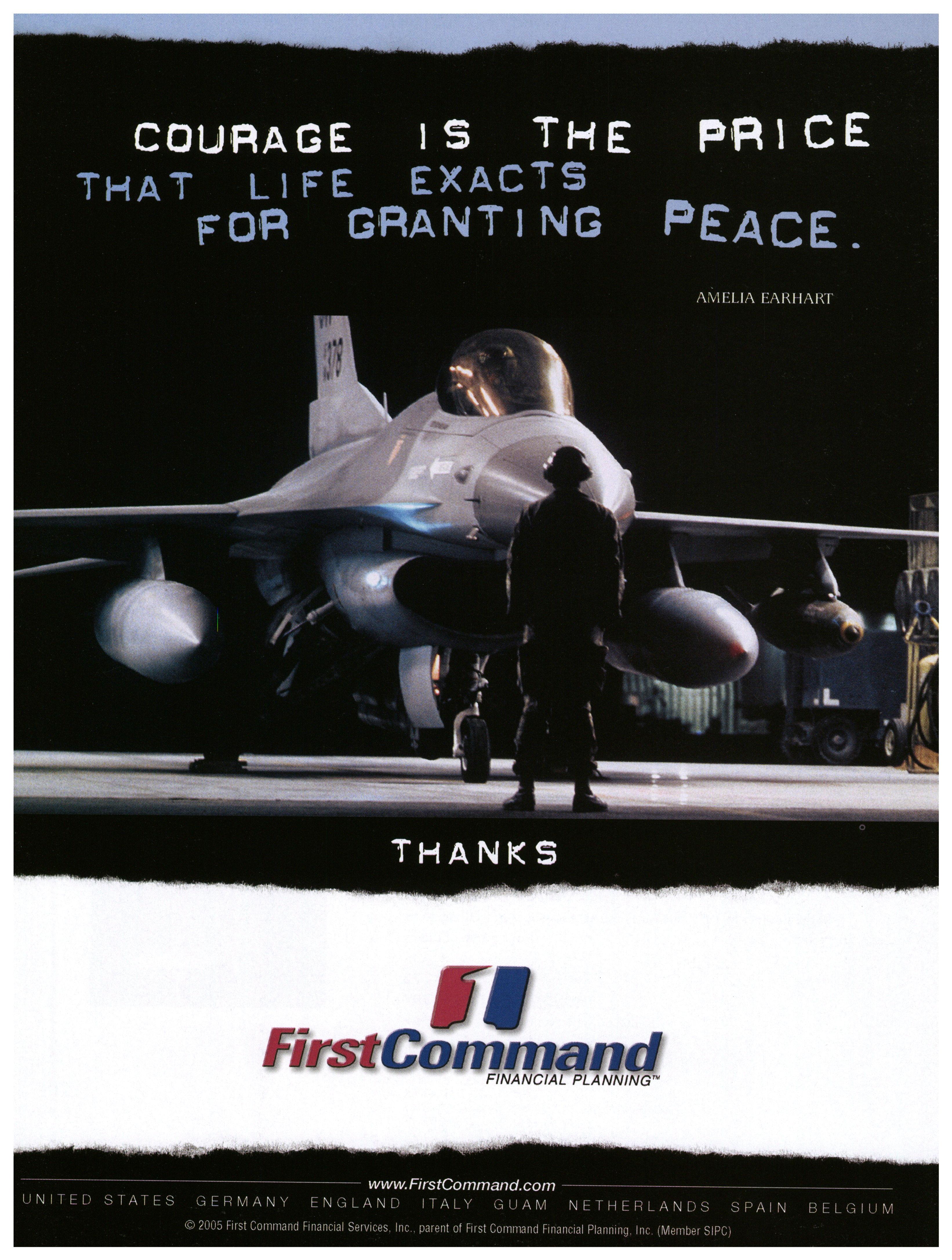 COURAGE is The PRICE THAT LIFE EXACTS FOR GRANTING PEACE. AMELIA EAKMART ff FirstCommand FINANCIAL PLANNING 7 www.FirstCommand.com UNITED STATES GERMANY ENGLAND ITALY GUAM NETHERLANDS SPAIN BELGIUM © 2005 First Command Financial Services. Inc., parent of First Command Financial Planning. Inc. (Member SIPC)