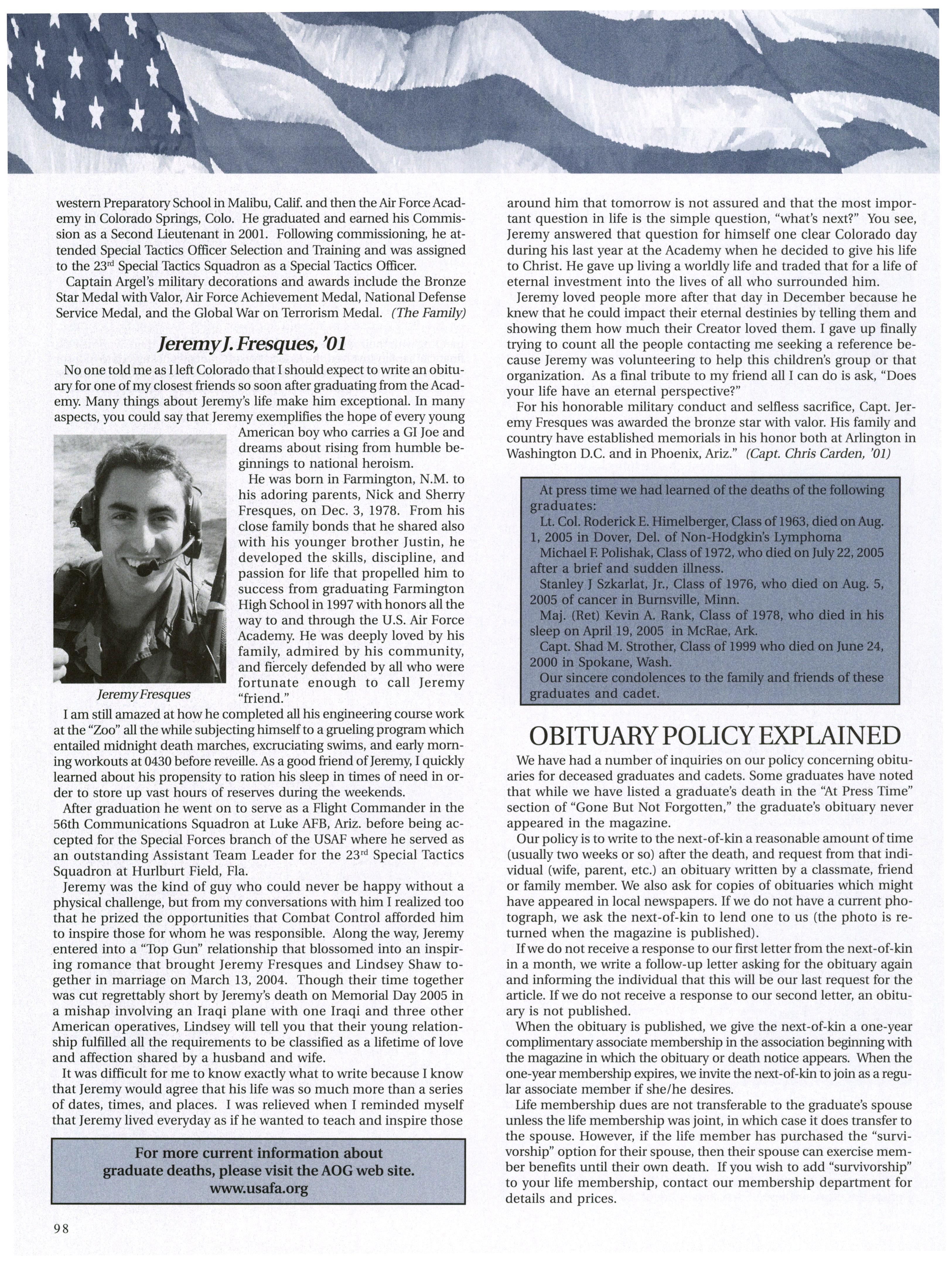 CaptainJeremyFresques was bom3 Dec 1978, anative ofFarmington, NM. He graduated from theAcademyin 2001 and served as a Flight Commanderof the 56th Communication Squadron at LukeAir Force Base. In 2002 he completed SpecialTactics Officer Selection and training and was assigned to the 23rd Special Tactics Squadron, Hurlburt Field FL.