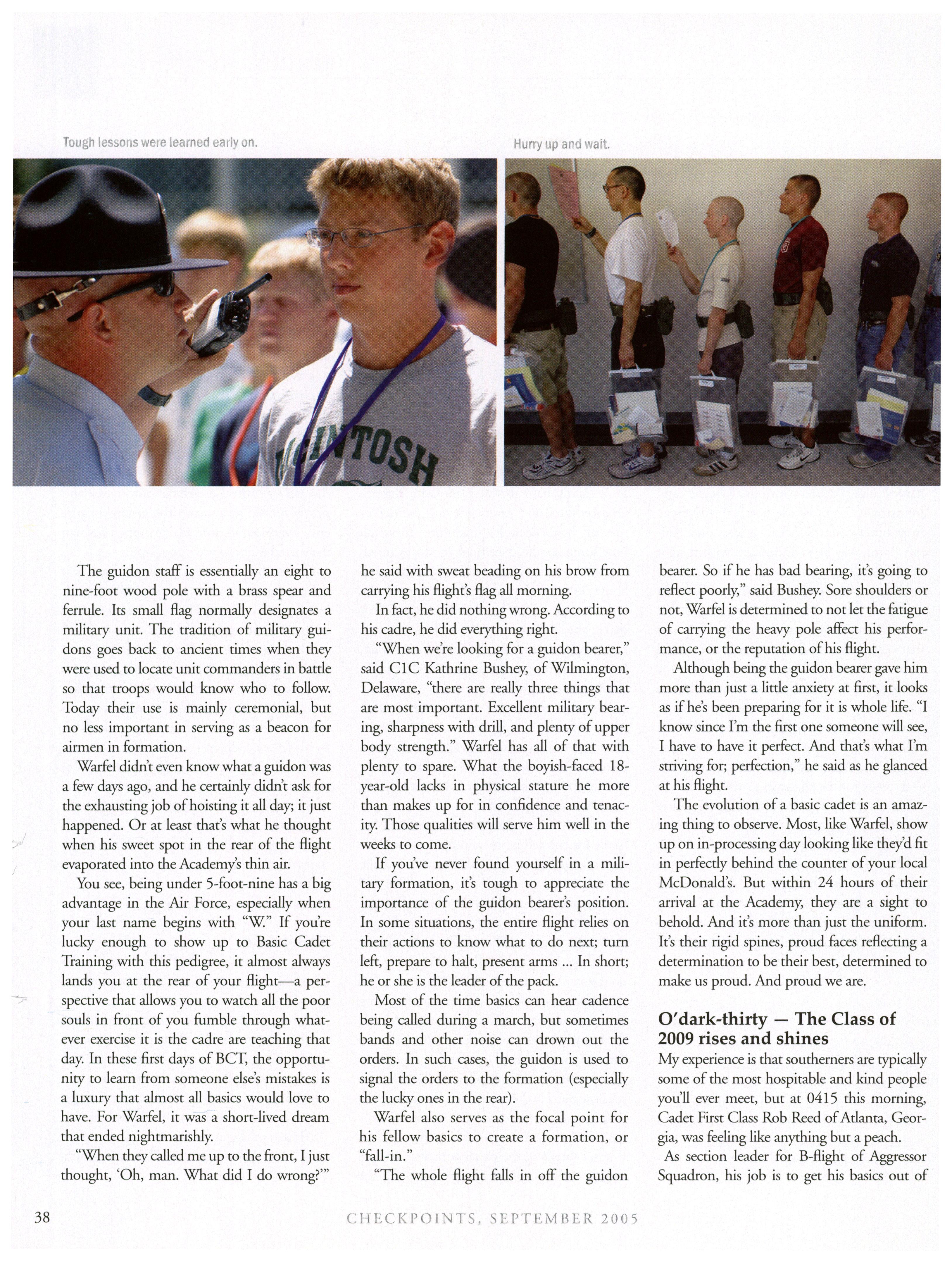 LETTERS TO THE EDITOR 4 FROM THE BOARD CHAIR 10 SUPERINTENDENT'S NOTE 12 WALDO 22 LONG BLUE LINE 44 SPORTS 76 CHAPTER NEWS 88 GONE BUT NOT FORGOTTEN 93 CLASS NEWS 99 features 24 GOOD MORNING, AIR FORCE ACADEMY! Cadet radio station, KAFA, fills airwaves with “sonic independence” 36 THE FIRST STEPS OF A LONG JOURNEY The Class of 2009 arrives and thrives 54 THE CLASS OF 50 YEARS AGO In the summer of 1955, the Air Force Academy opened its doors to its first group ofcadets 72 THOUGHTS OF DISCOVERY Kelly, 86, reflects on descent from space ON THE COVER: Cadetsfrom the Class of2009 rise to the challenge ofBasic Cadet Training. (Photos by Ken Wright) Volume 34, number 2